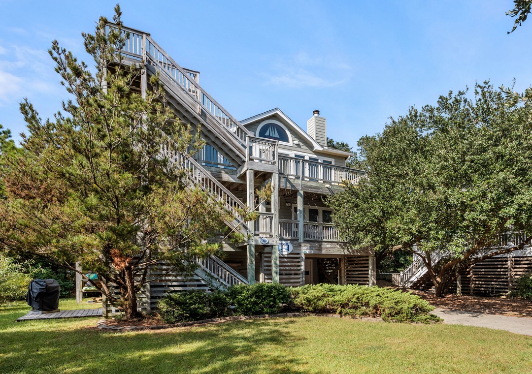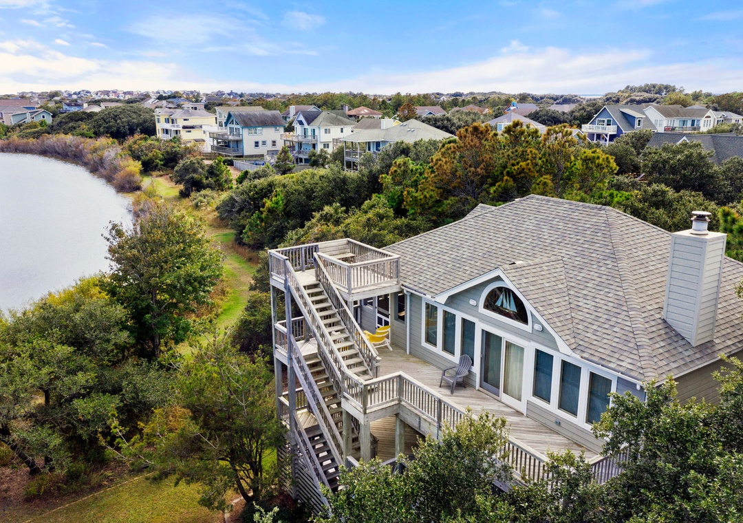 Slow down the pace and set your clocks to island time when you spend your next Outer Banks vacation at Turtle's Cove. This four-bedroom oceanside and lakefront home in the community of Ocean Sands is just a short walk to the beach via a beautiful tree-lined, lakeside path. The lakefront lot is situated on a quiet cul-de-sac for privacy and seclusion. Nature lovers will appreciate the trail through the woods and around the lake. Get a panoramic, bird's eye view of the lake and the entire neighborhood from the rooftop deck.