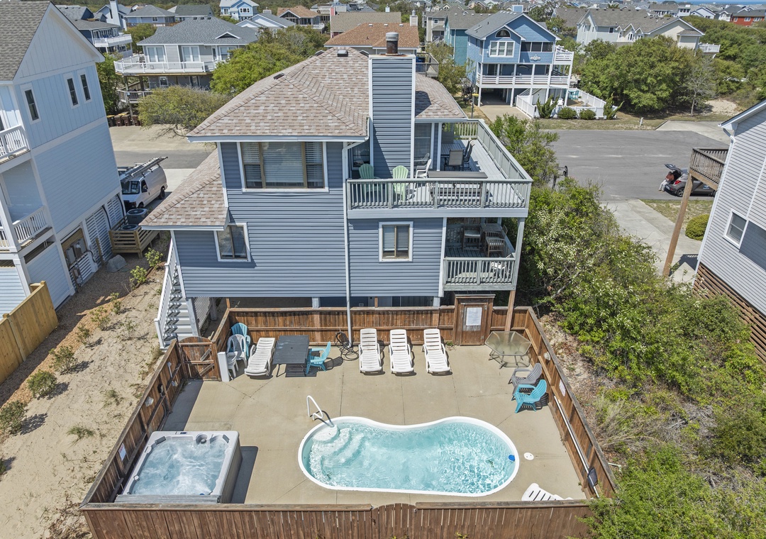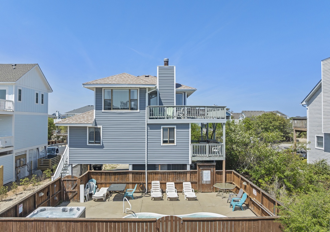 Starting at ground level, you’ll find a convenient utility room with a washer and dryer, an outdoor shower for rinsing off after beach days, and access to your private pool and relaxing hot tub. There is also a carport and a outdoor grill, perfect for outdoor gatherings.