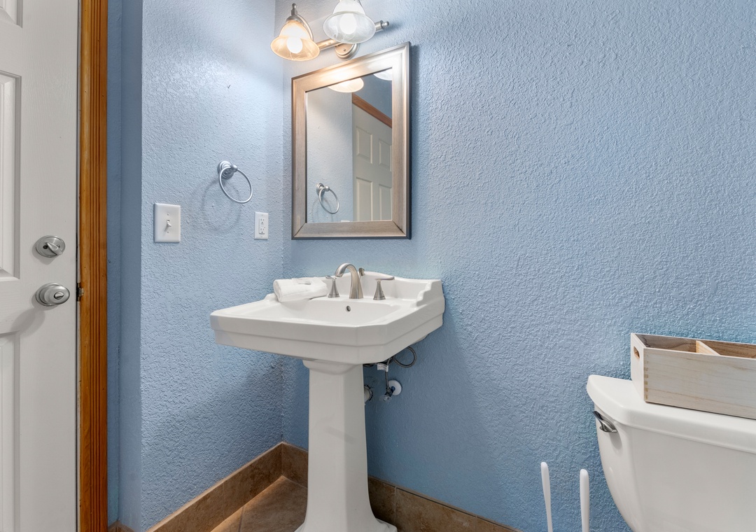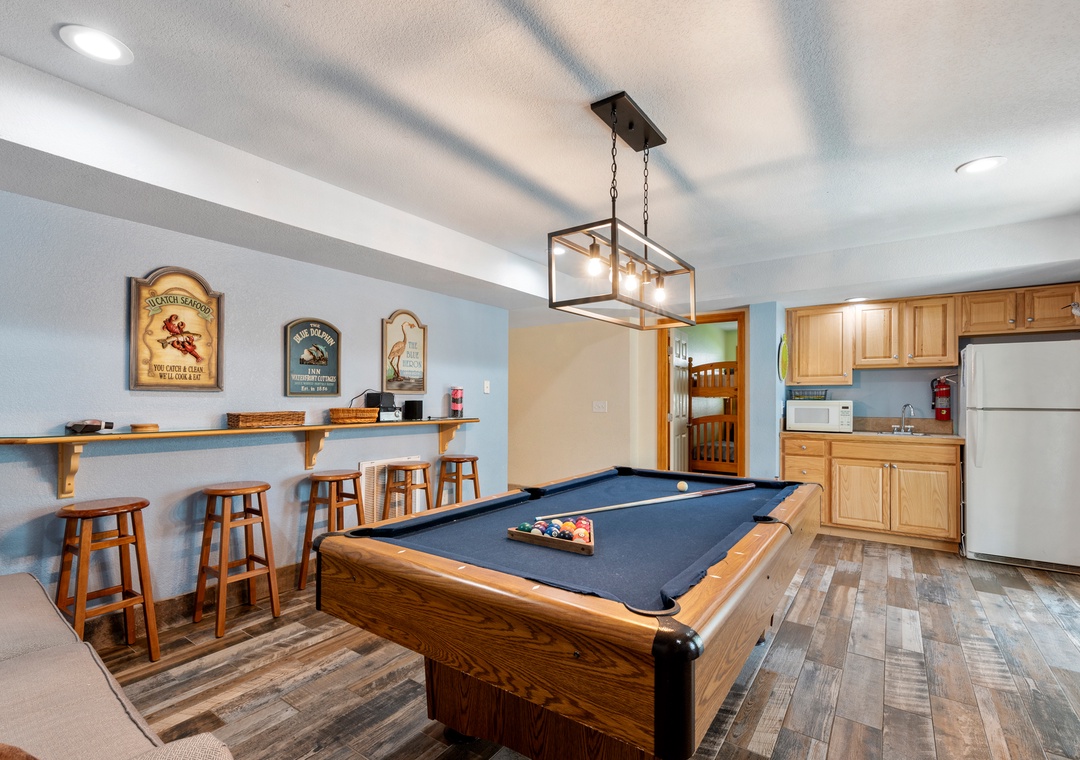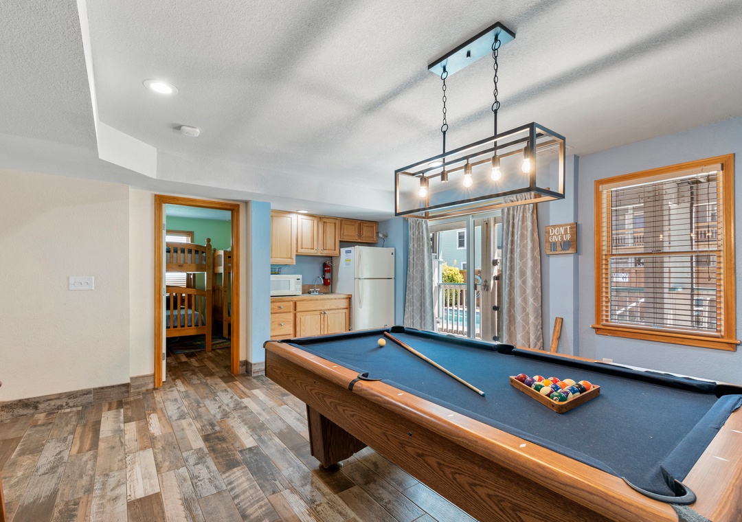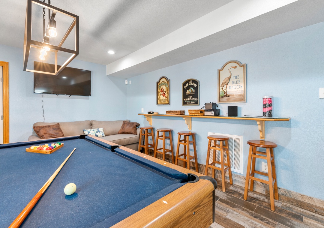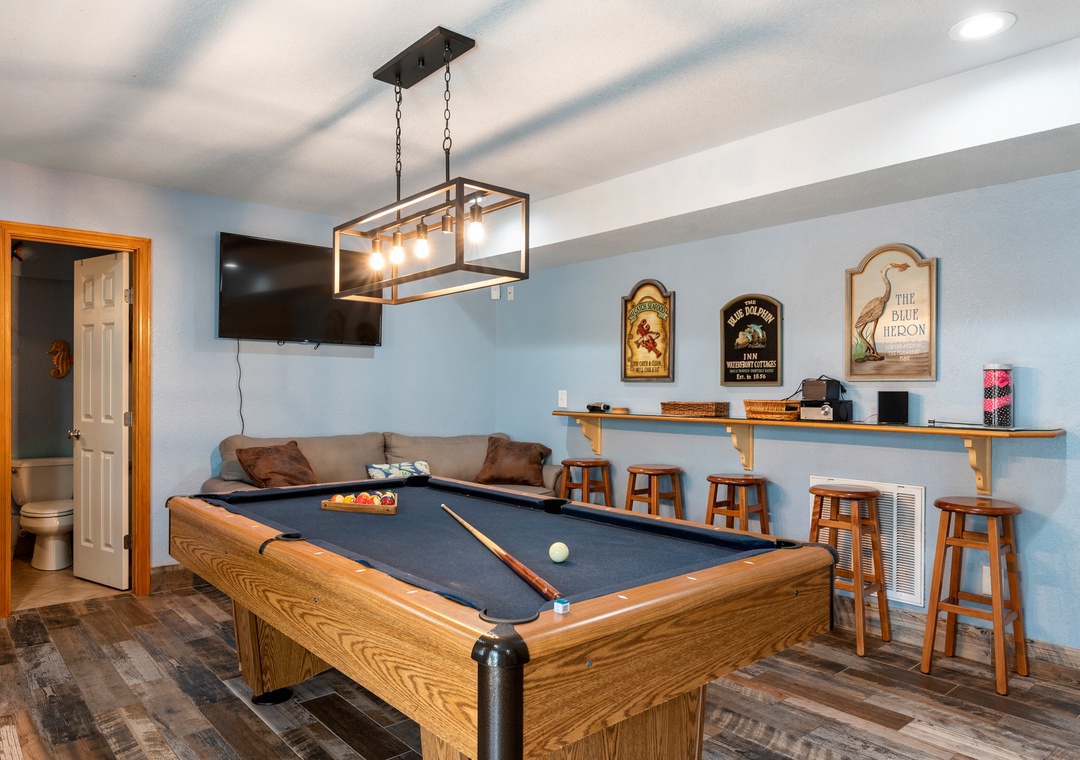 With over 3,500 square feet of comfortably furnished living space, Joshua's Place is ideal for extended families or multiple groups vacationing together. Four more bedrooms are located on the mid-level, all of which have king beds, ensuite baths and deck access. The den with sofa and TV can serve as an additional living area, and also provides a desk for staying caught up with work or school remotely. This room opens up onto a covered deck with hot tub that overlooks the pool area below. The fun continues downstairs in the game room with a pool table, wet bar and full-size fridge - perfect for poolside drinks and snacks! A half bath on the ground floor can be conveniently accessed directly from the pool area. Two more bedrooms that share a Jack-and-Jill bath are also located on this level.