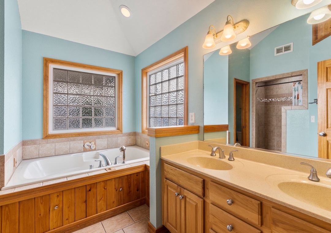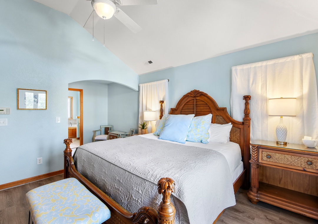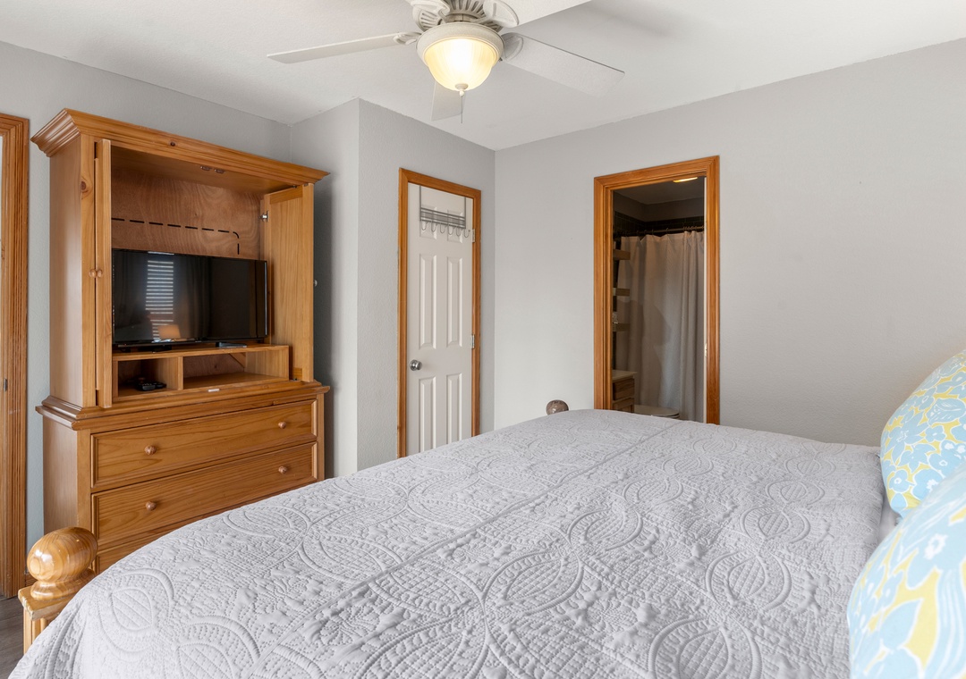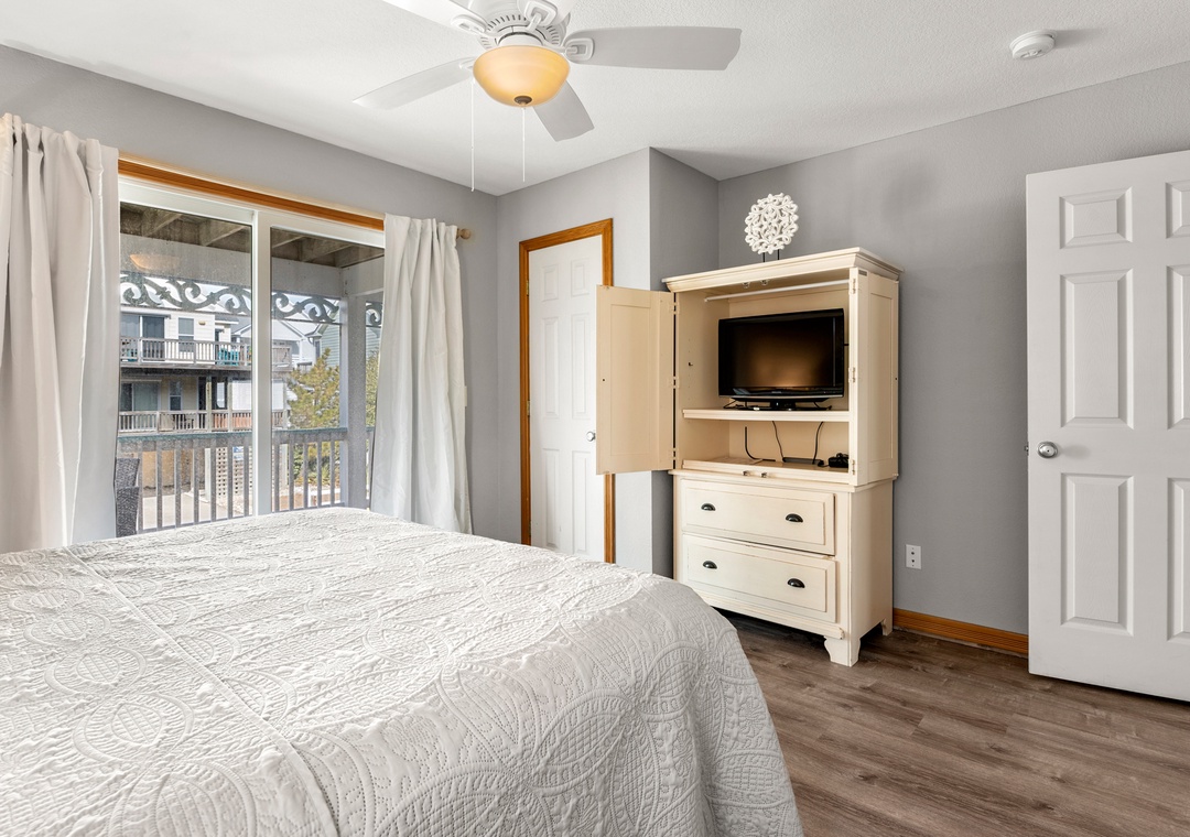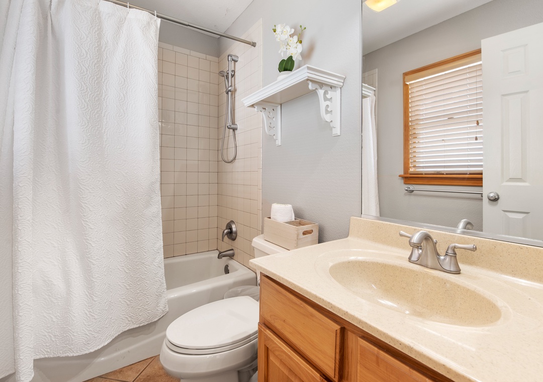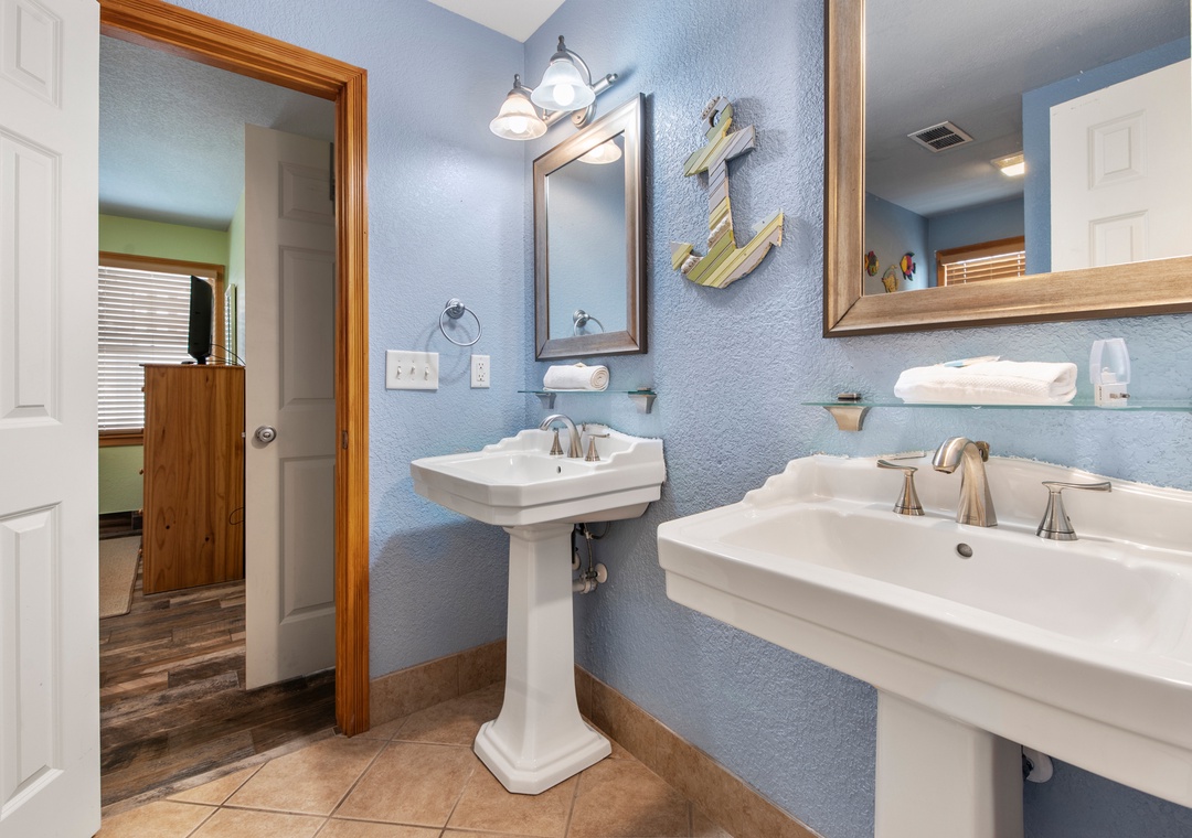 With over 3,500 square feet of comfortably furnished living space, Joshua's Place is ideal for extended families or multiple groups vacationing together. Four more bedrooms are located on the mid-level, all of which have king beds, ensuite baths and deck access. The den with sofa and TV can serve as an additional living area, and also provides a desk for staying caught up with work or school remotely. This room opens up onto a covered deck with hot tub that overlooks the pool area below. The fun continues downstairs in the game room with a pool table, wet bar and full-size fridge - perfect for poolside drinks and snacks! A half bath on the ground floor can be conveniently accessed directly from the pool area. Two more bedrooms that share a Jack-and-Jill bath are also located on this level.