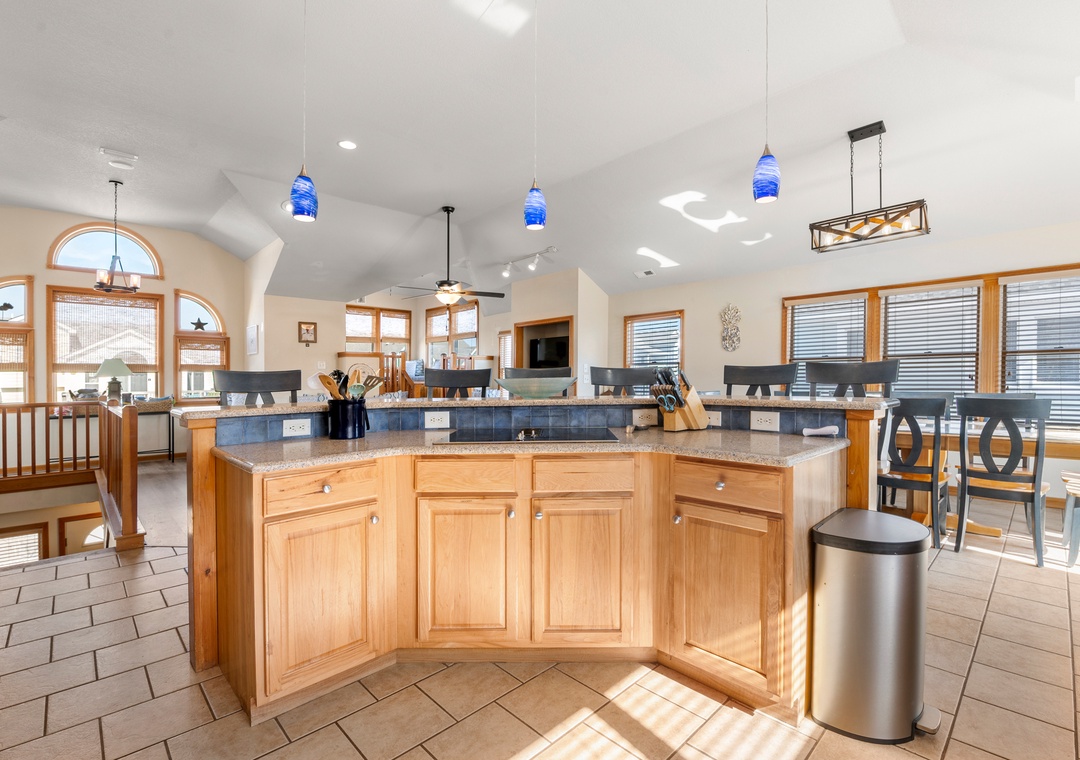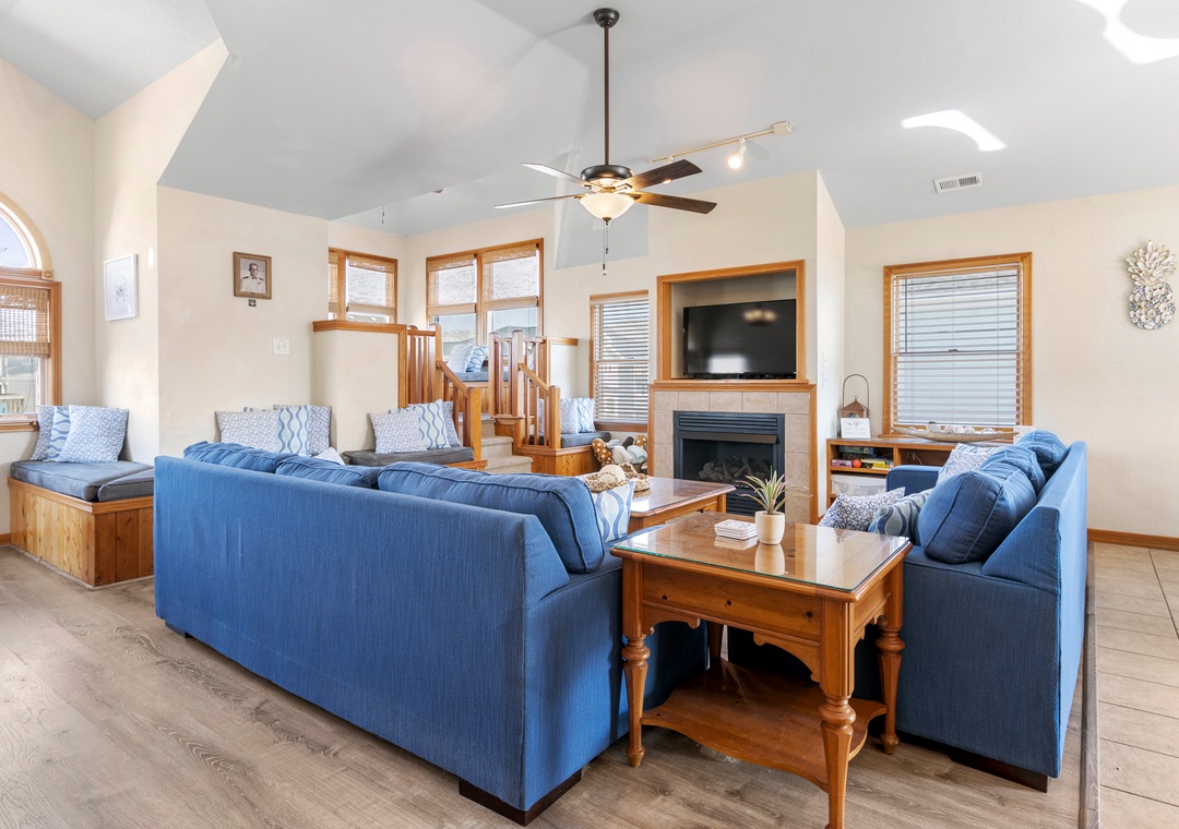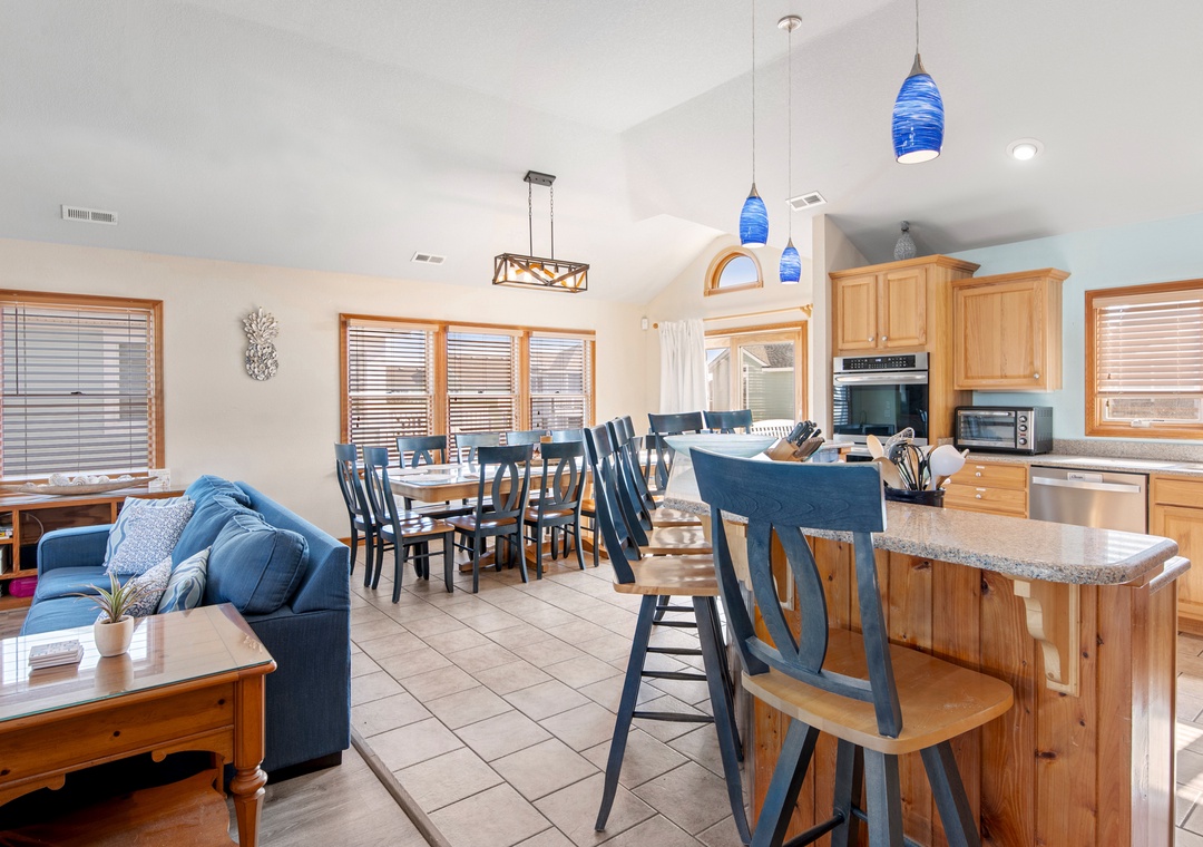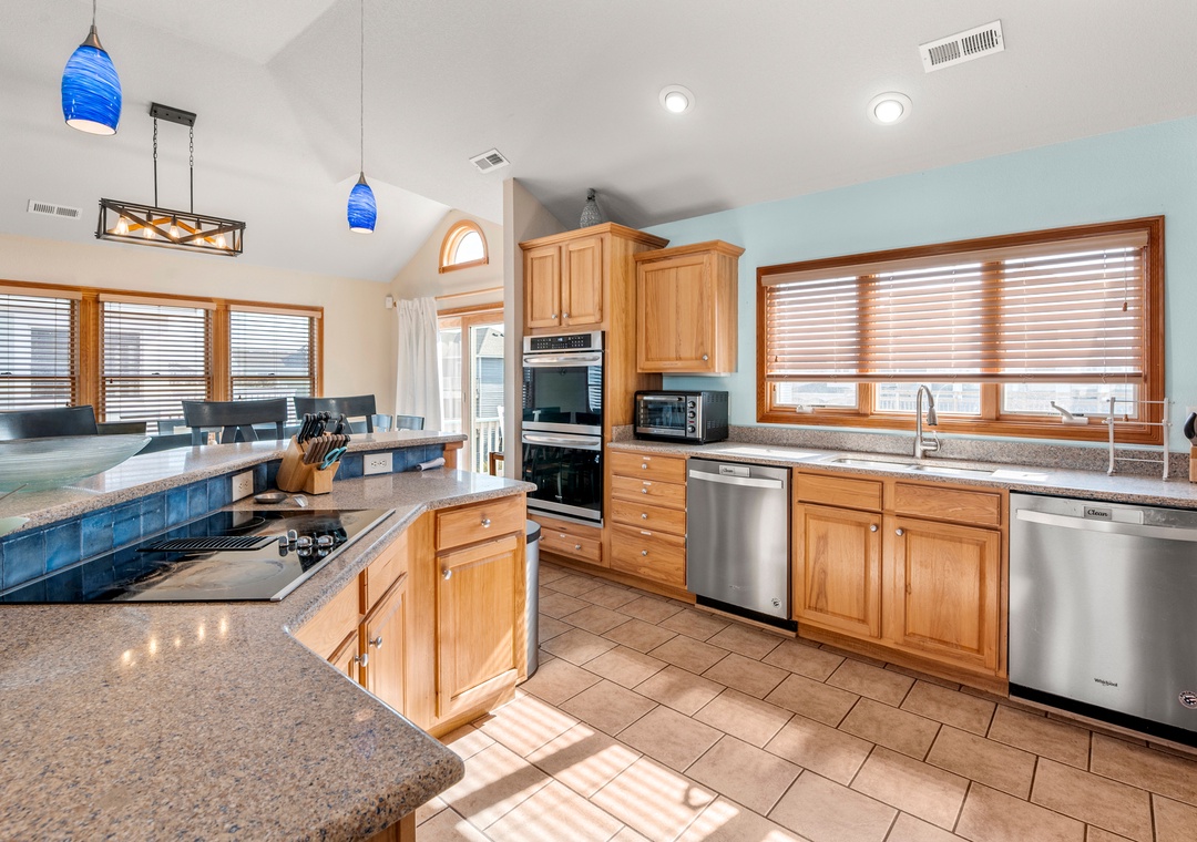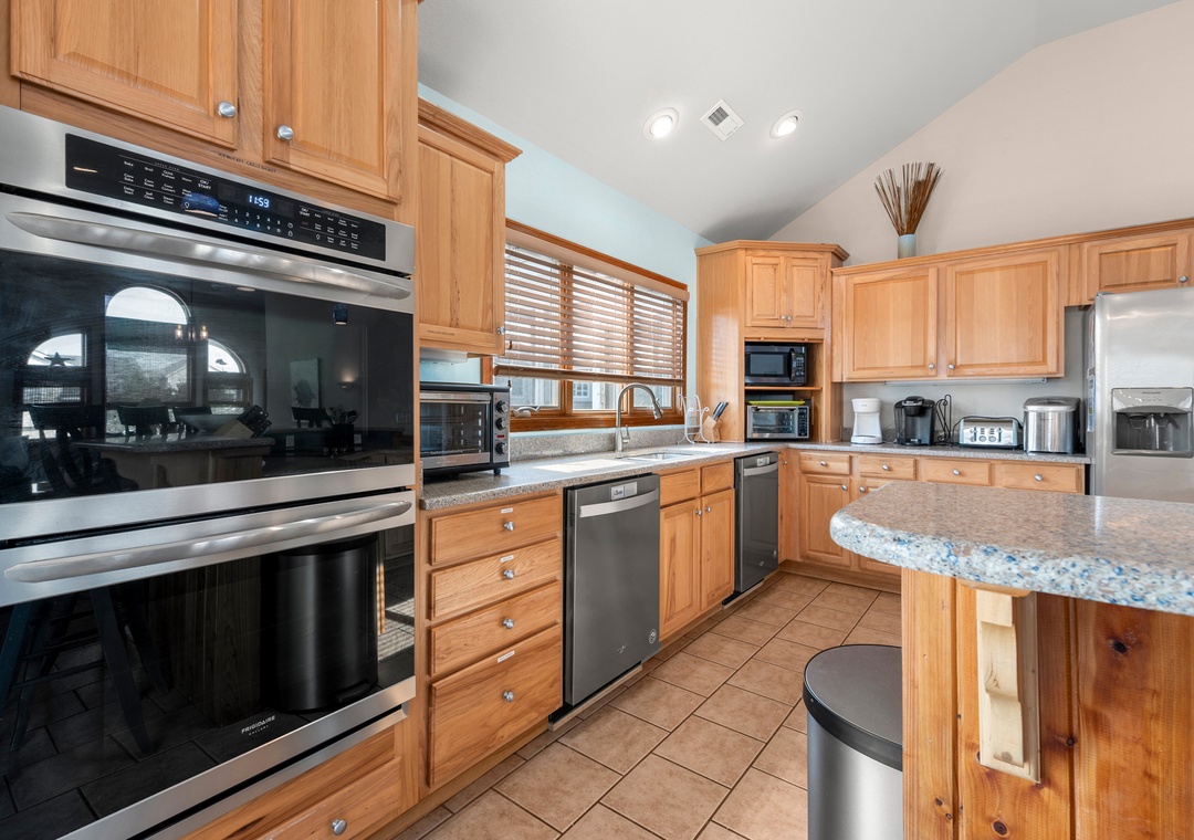 The top level features a spacious, open-concept layout with fantastic flow between the living, dining and kitchen areas. Vaulted ceilings and plenty of windows create a bright and airy space with abundant natural light. The Ships Watch with built-in bench seating overlooks the great room below and even offers a horizon view of the ocean. When you're not trying out one of Corolla's fantastic restaurants, you can prepare meals at home in the kitchen featuring granite countertops and stainless steel appliances. A double oven and two dishwashers will make cooking and cleaning up for large groups a breeze. The top-level primary suite includes deck access and a spacious private bath with soaking tub and walk-in shower.