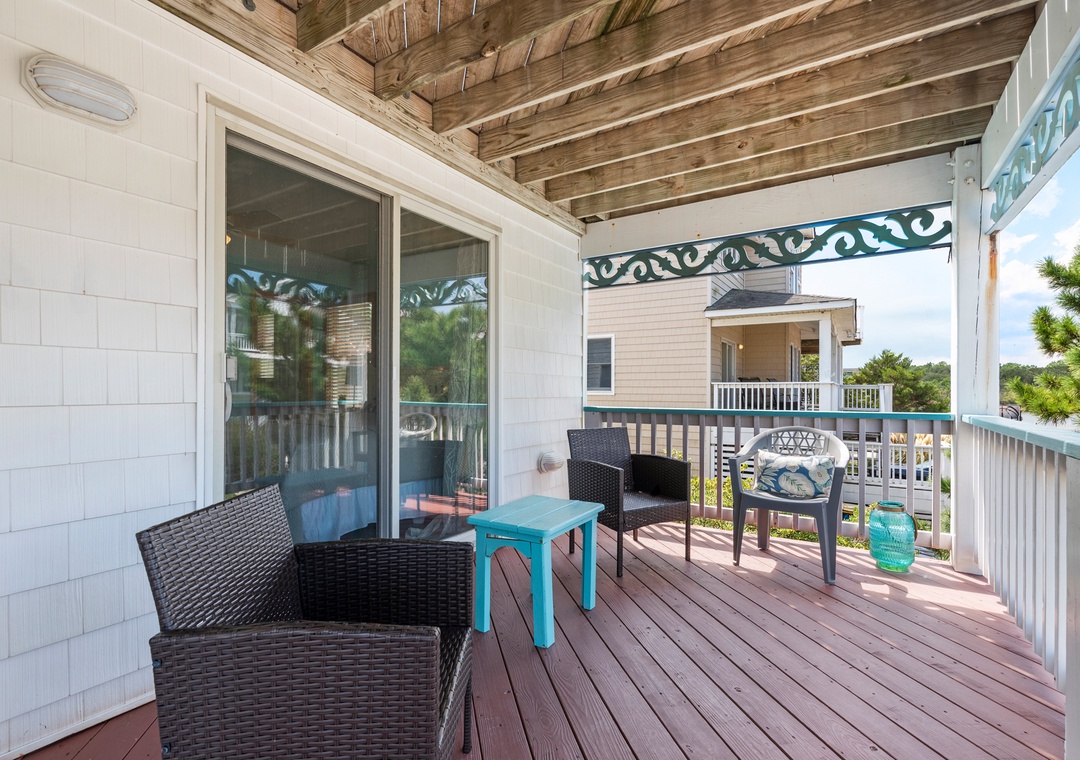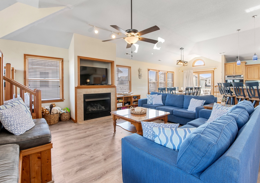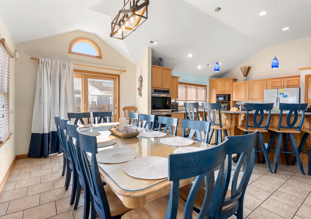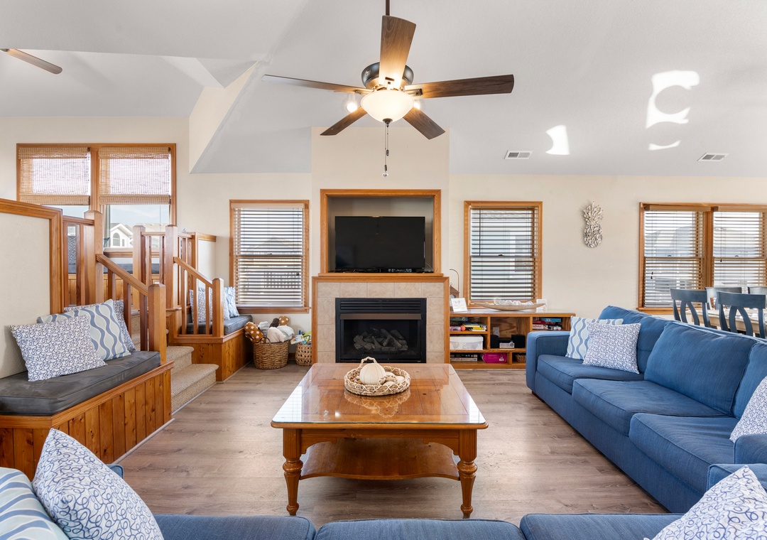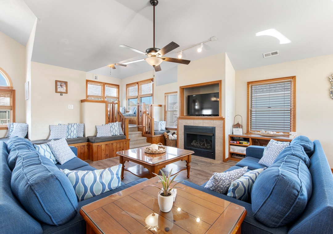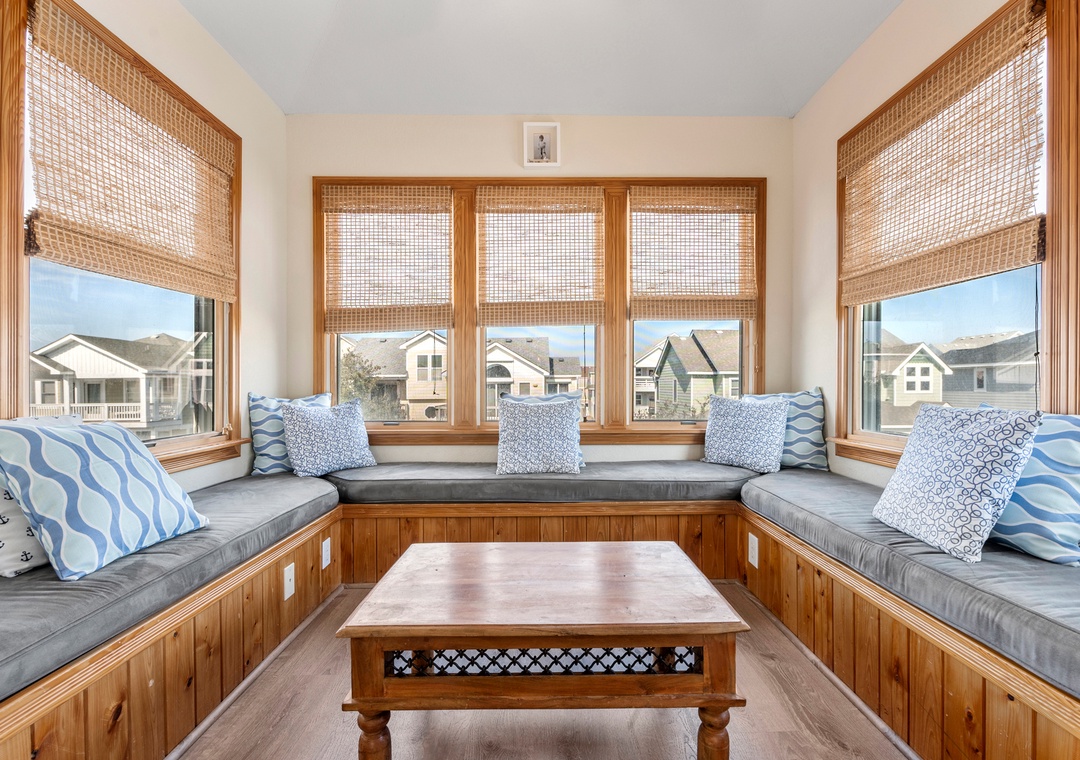 The top level features a spacious, open-concept layout with fantastic flow between the living, dining and kitchen areas. Vaulted ceilings and plenty of windows create a bright and airy space with abundant natural light. The Ships Watch with built-in bench seating overlooks the great room below and even offers a horizon view of the ocean. When you're not trying out one of Corolla's fantastic restaurants, you can prepare meals at home in the kitchen featuring granite countertops and stainless steel appliances. A double oven and two dishwashers will make cooking and cleaning up for large groups a breeze. The top-level primary suite includes deck access and a spacious private bath with soaking tub and walk-in shower.