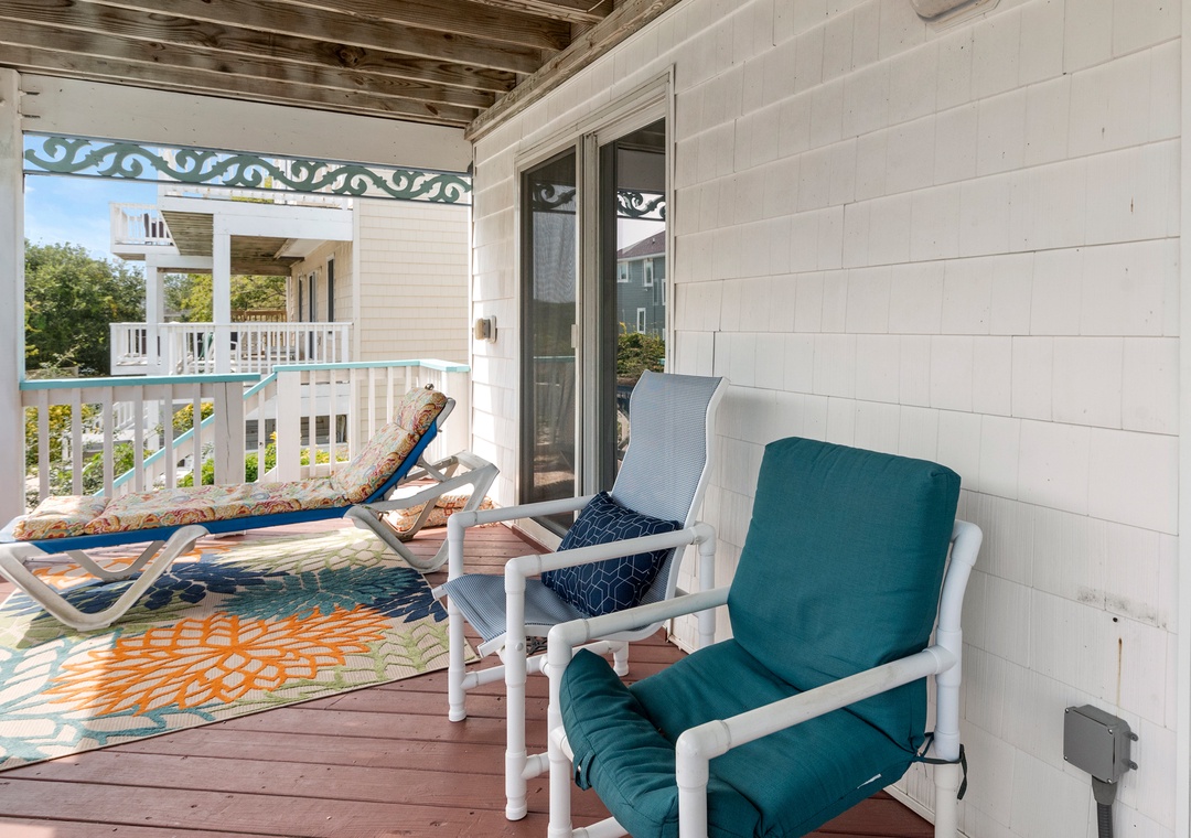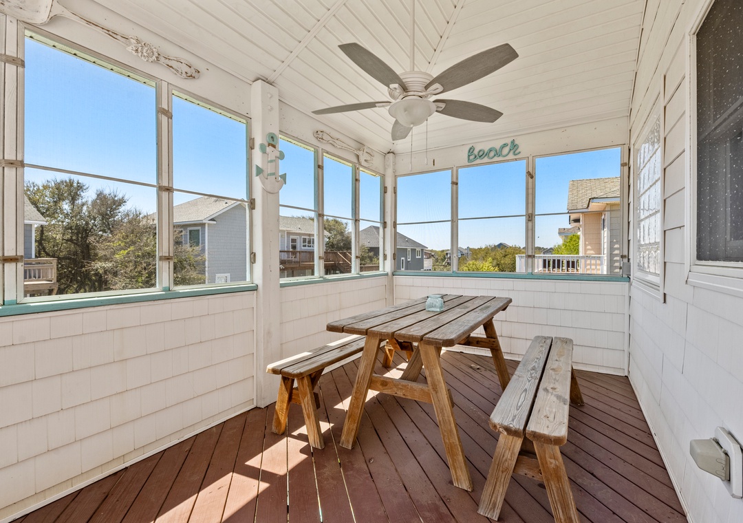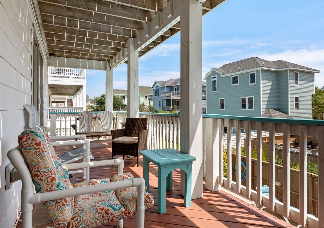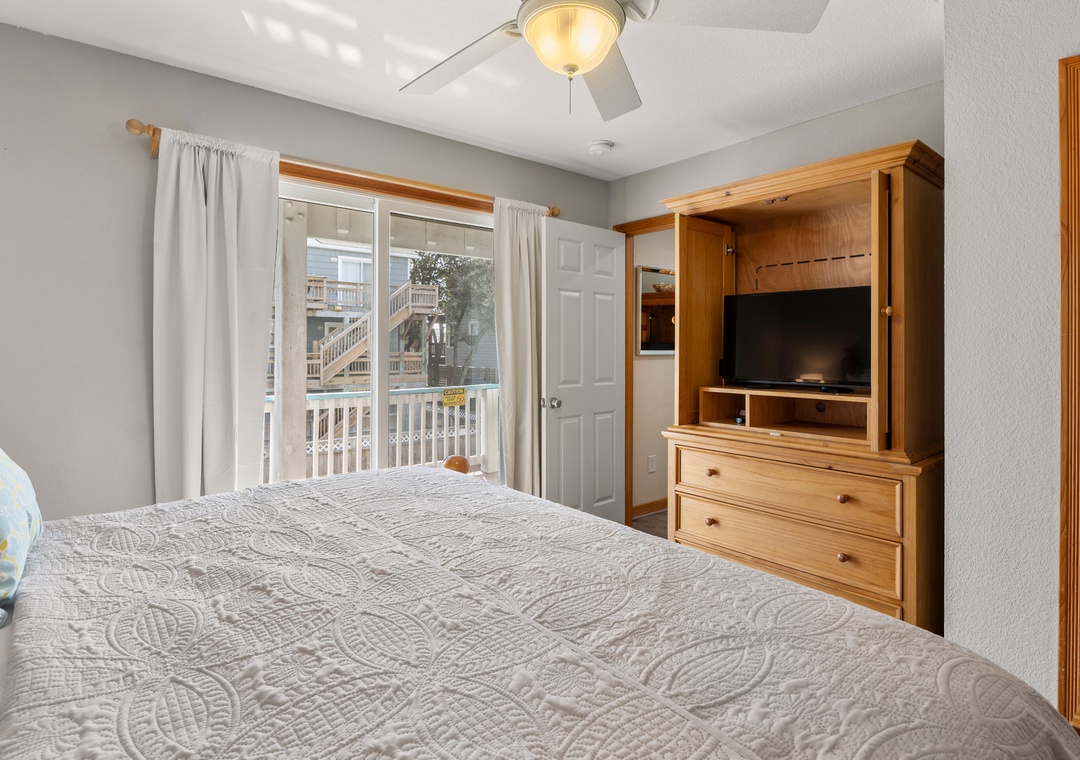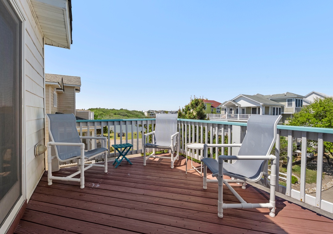 The top level features a spacious, open-concept layout with fantastic flow between the living, dining and kitchen areas. Vaulted ceilings and plenty of windows create a bright and airy space with abundant natural light. The Ships Watch with built-in bench seating overlooks the great room below and even offers a horizon view of the ocean. When you're not trying out one of Corolla's fantastic restaurants, you can prepare meals at home in the kitchen featuring granite countertops and stainless steel appliances. A double oven and two dishwashers will make cooking and cleaning up for large groups a breeze. The top-level primary suite includes deck access and a spacious private bath with soaking tub and walk-in shower.