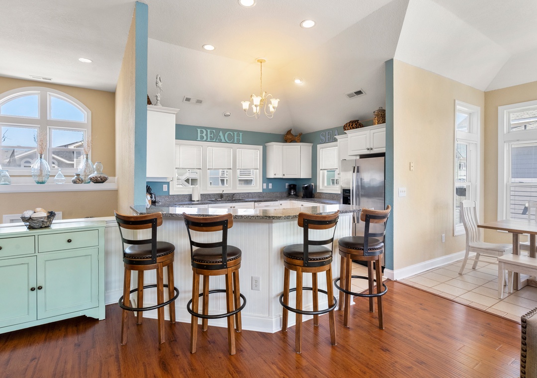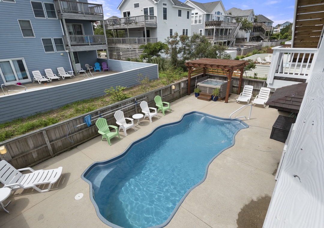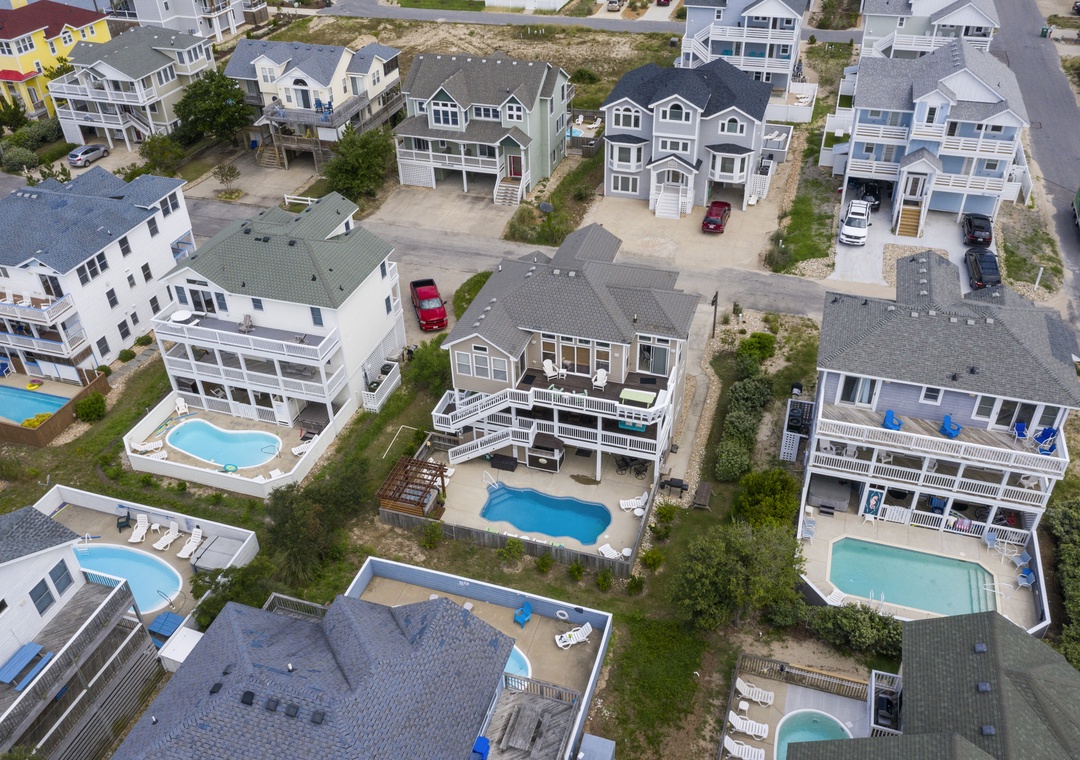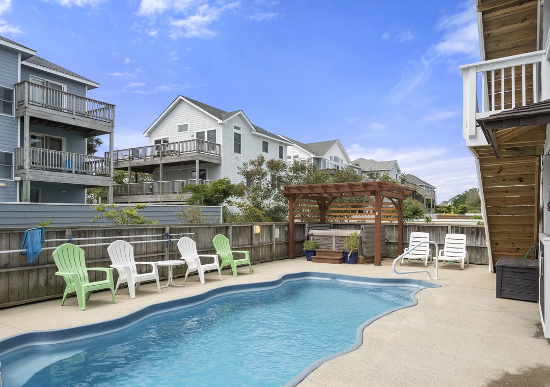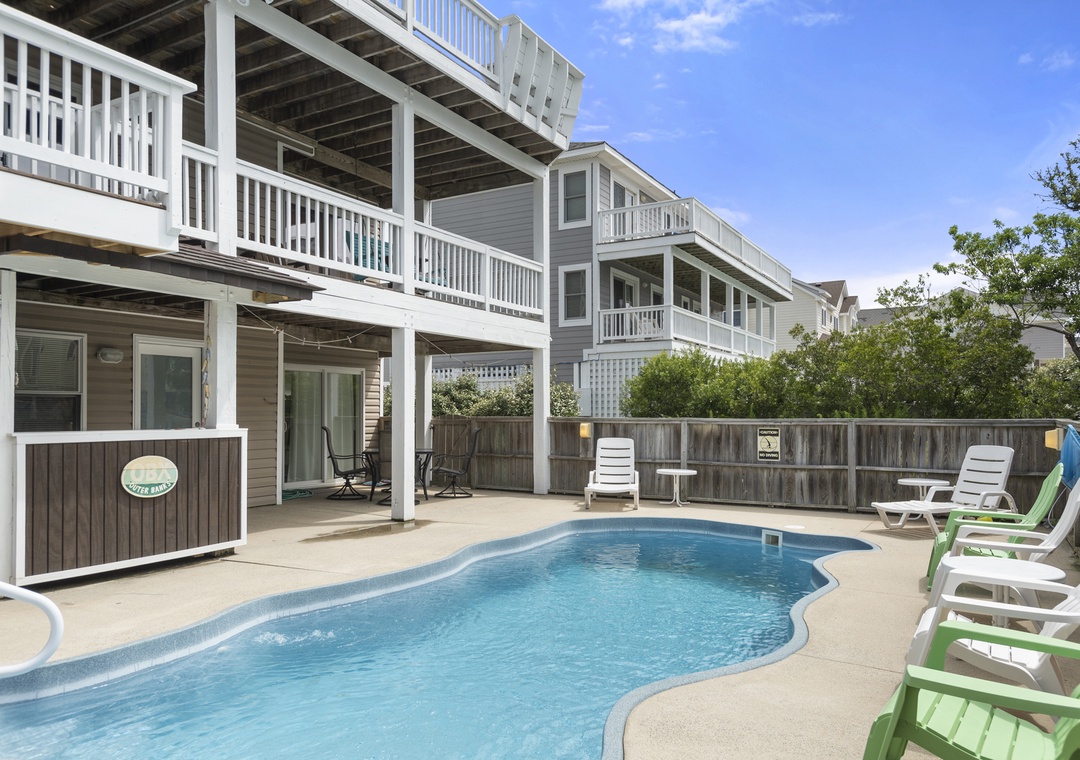 Amenities and Features at this OBX home include: a 10' x 20' Private Pool (not heated), Hot Tub, 4 Master Suites, WiFi, stereo w/ Bluetooth, wet bar, Basketball Hoop, 2- pack N plays, high chair, picnic table, two outside showers, charcoal grill, and smoker.