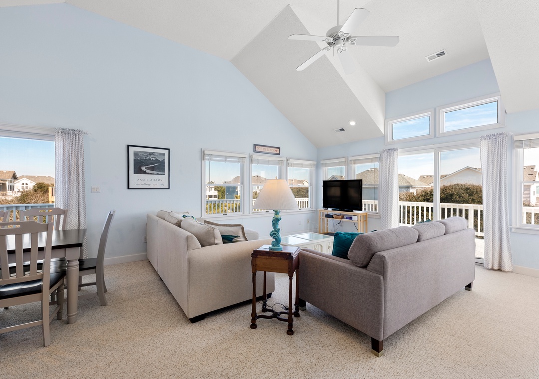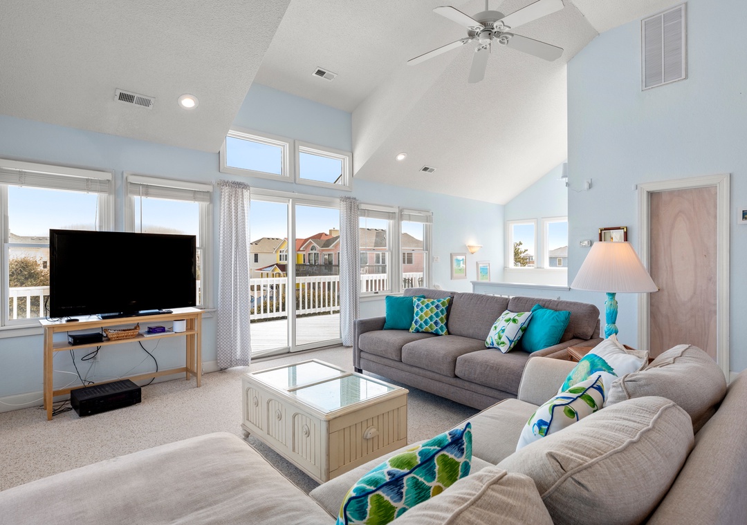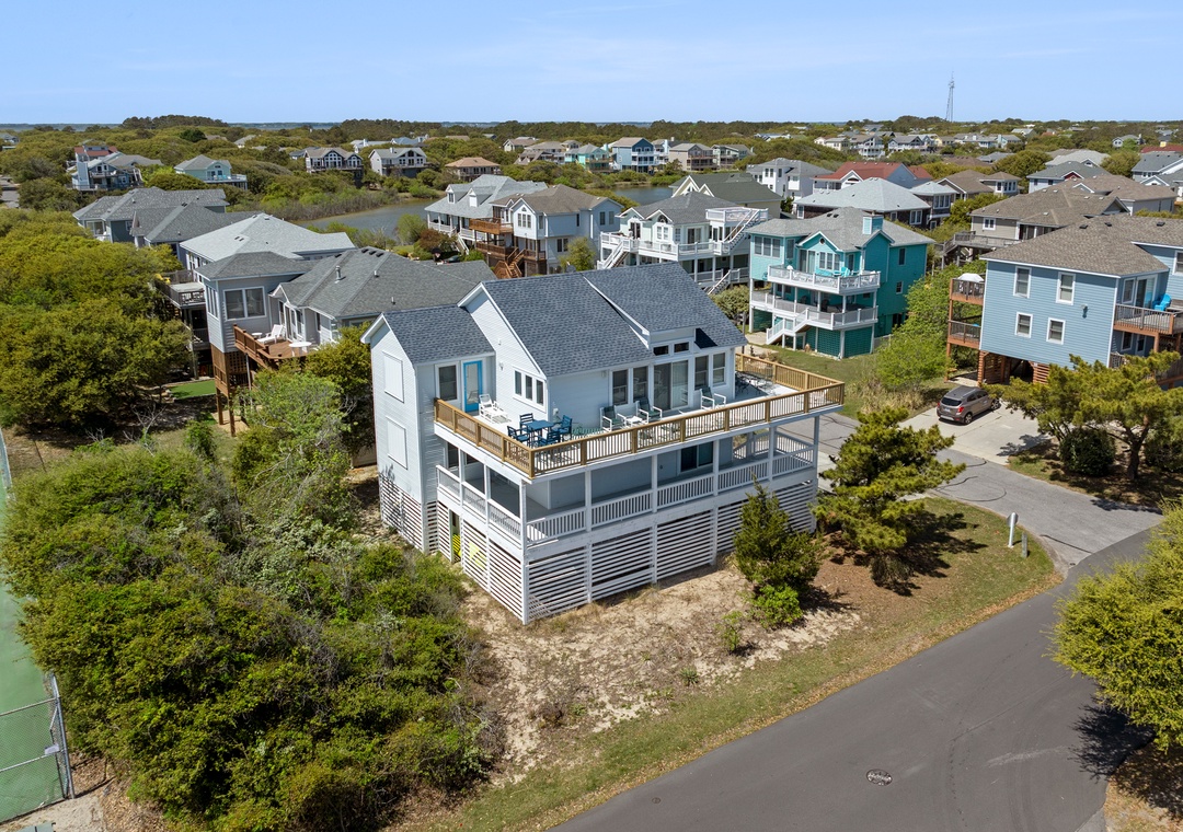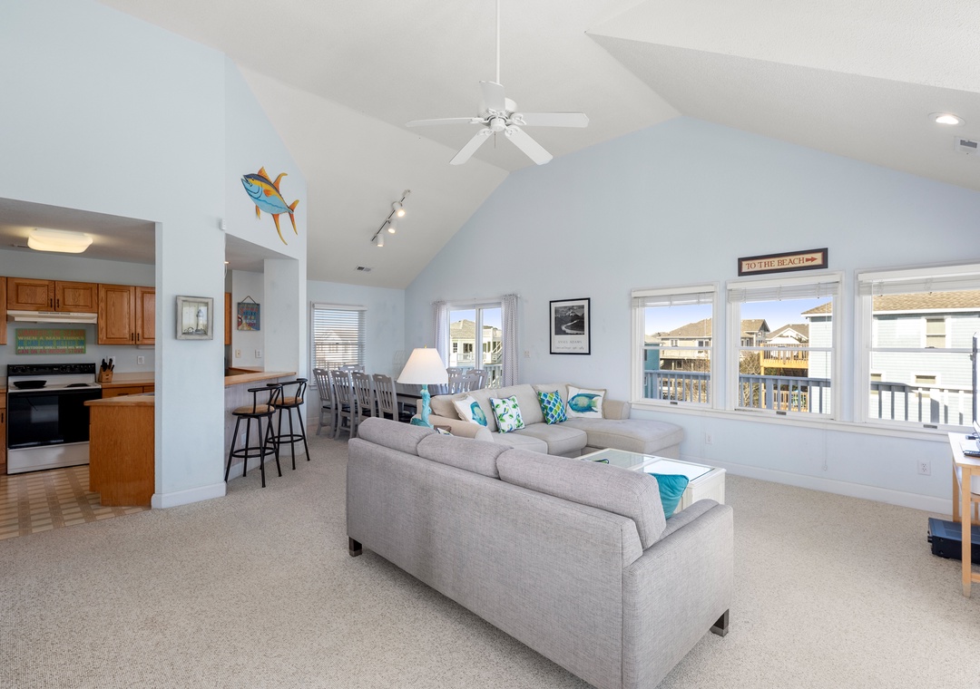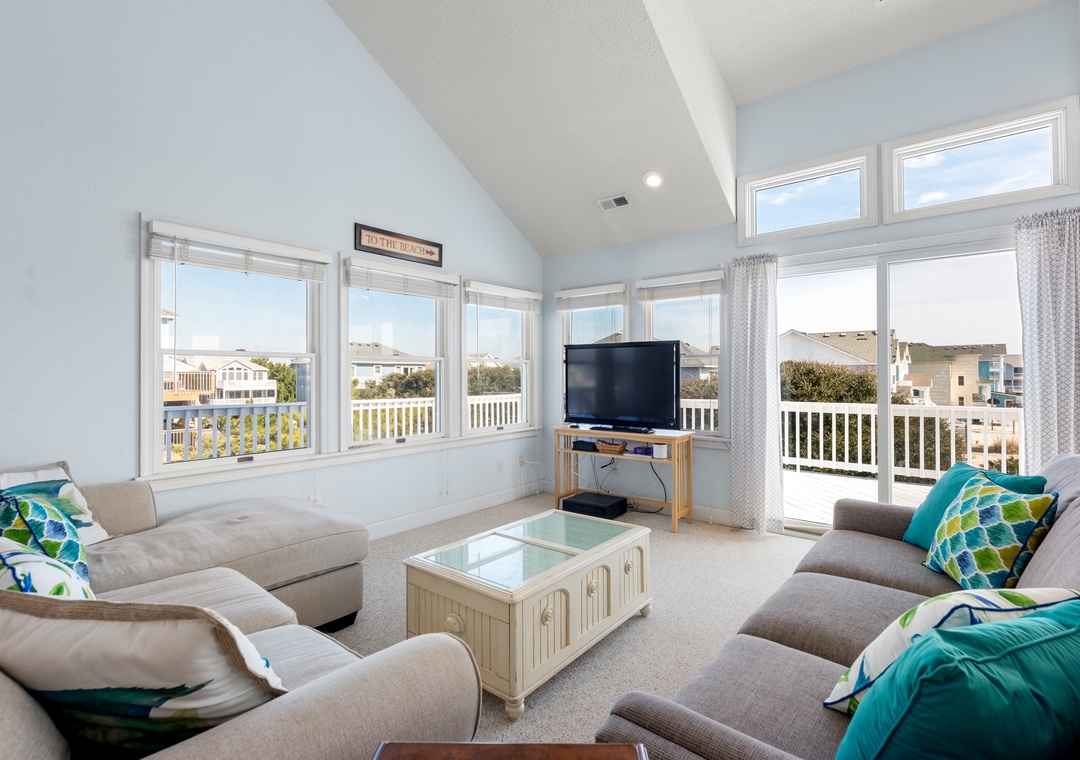 Back at the house, the top level features an open-concept layout with effortless flow between the living, dining and kitchen areas. Vaulted ceilings and plenty of windows create a bright and airy space with abundant natural light. The living area leads out to an expansive sun deck for your daily dose of Vitamin D. When you're not trying out one of Corolla's fantastic restaurants, prepare meals at home in the fully stocked and well-equipped kitchen. The spacious suite on the top-level is attached to a semi-private bath. Four more bedrooms on the mid-level will comfortably accommodate family and friends.