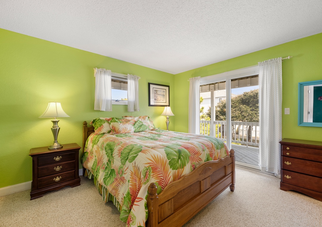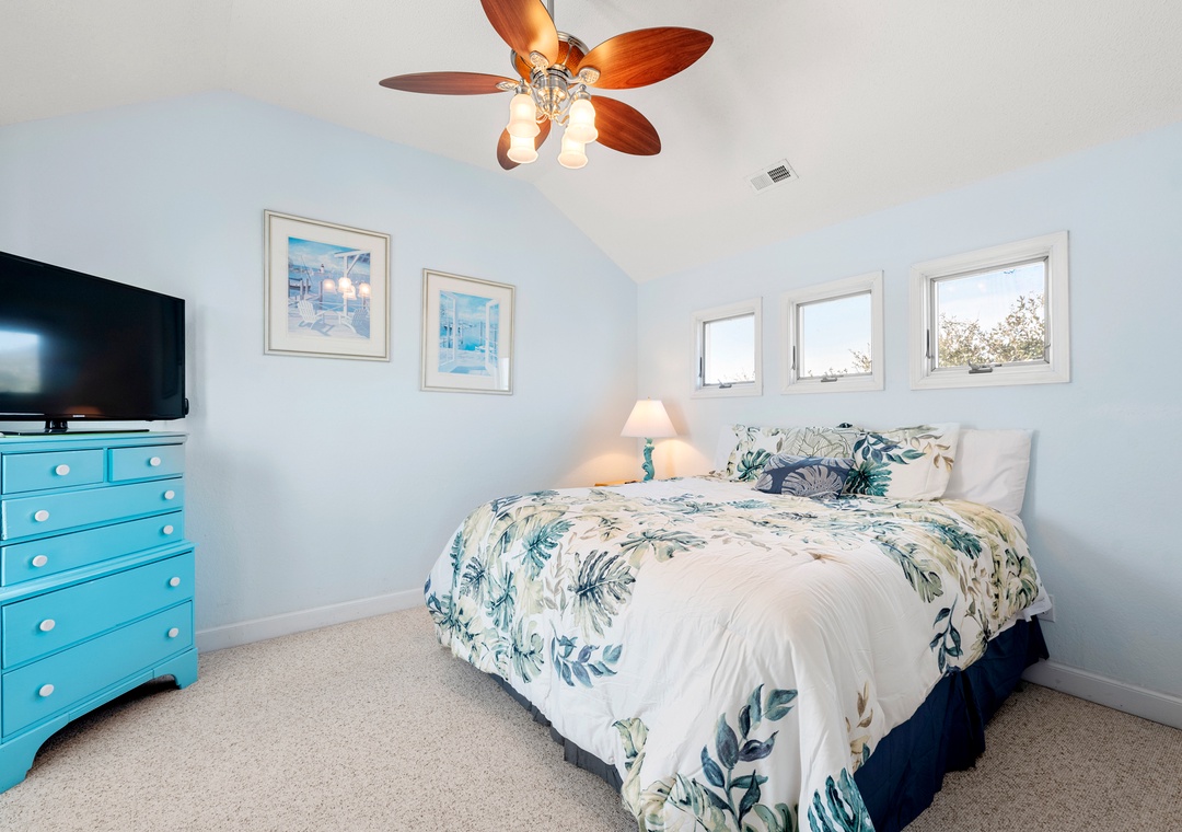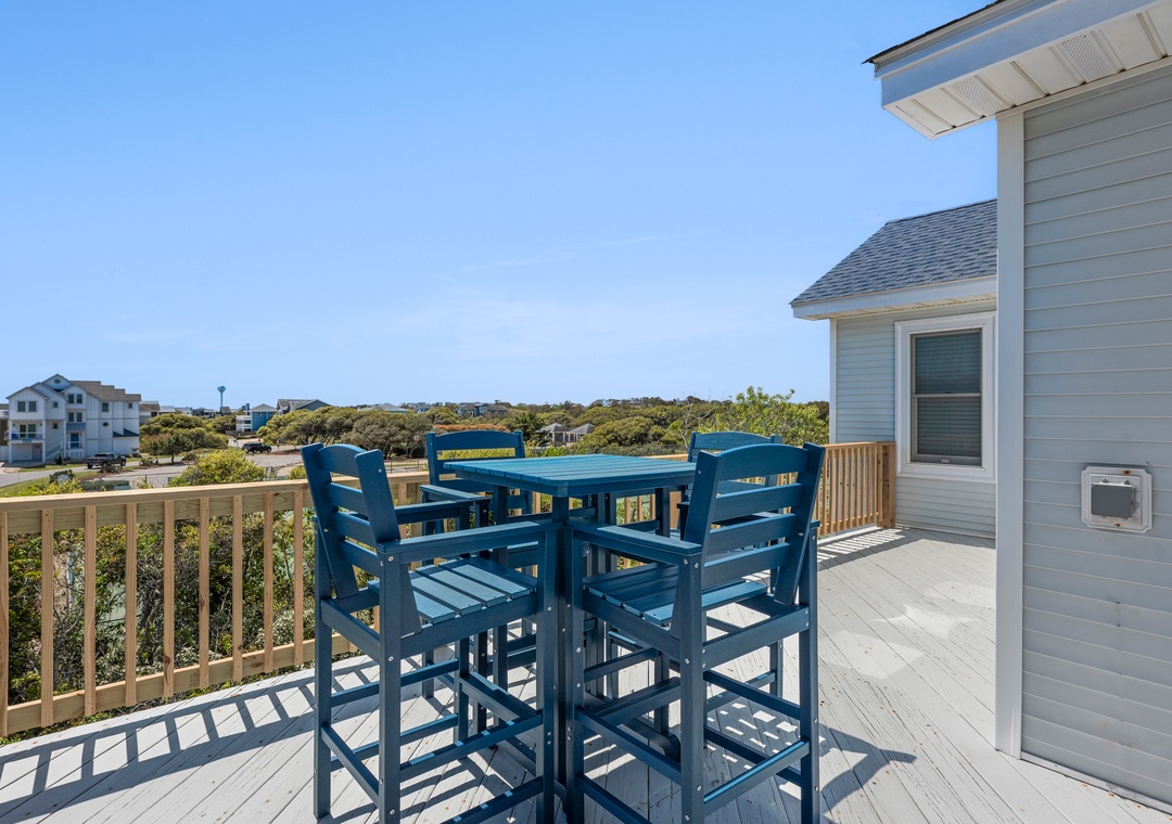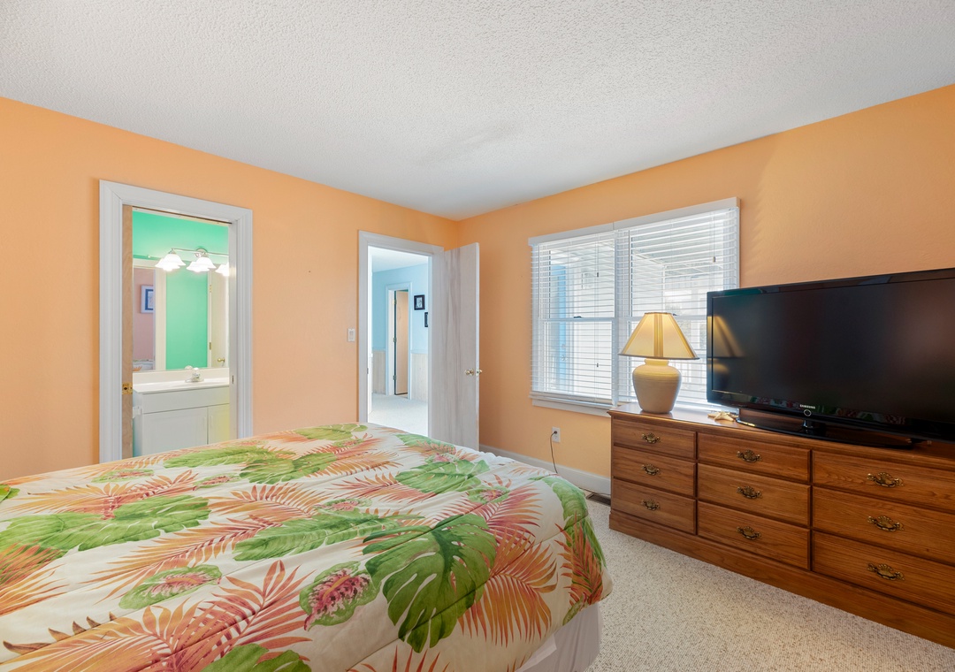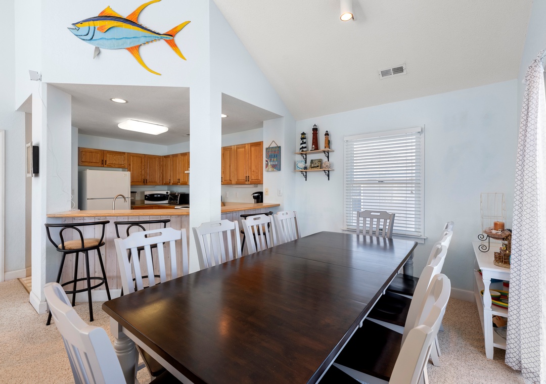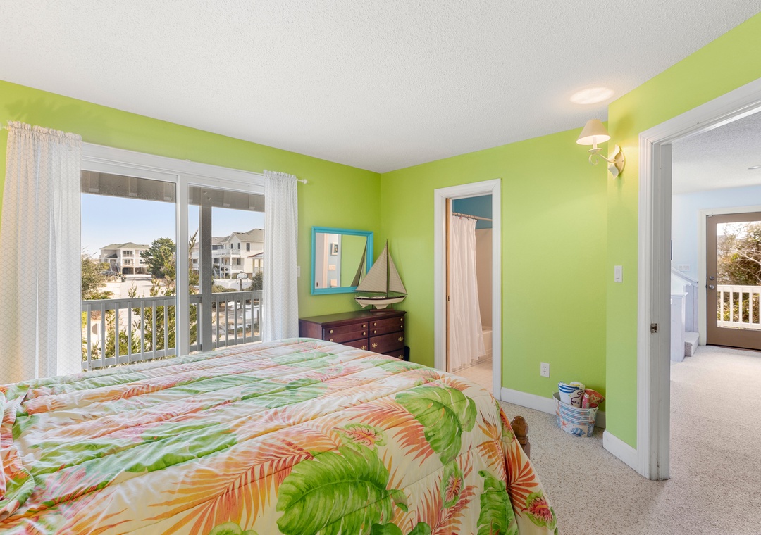 Back at the house, the top level features an open-concept layout with effortless flow between the living, dining and kitchen areas. Vaulted ceilings and plenty of windows create a bright and airy space with abundant natural light. The living area leads out to an expansive sun deck for your daily dose of Vitamin D. When you're not trying out one of Corolla's fantastic restaurants, prepare meals at home in the fully stocked and well-equipped kitchen. The spacious suite on the top-level is attached to a semi-private bath. Four more bedrooms on the mid-level will comfortably accommodate family and friends.