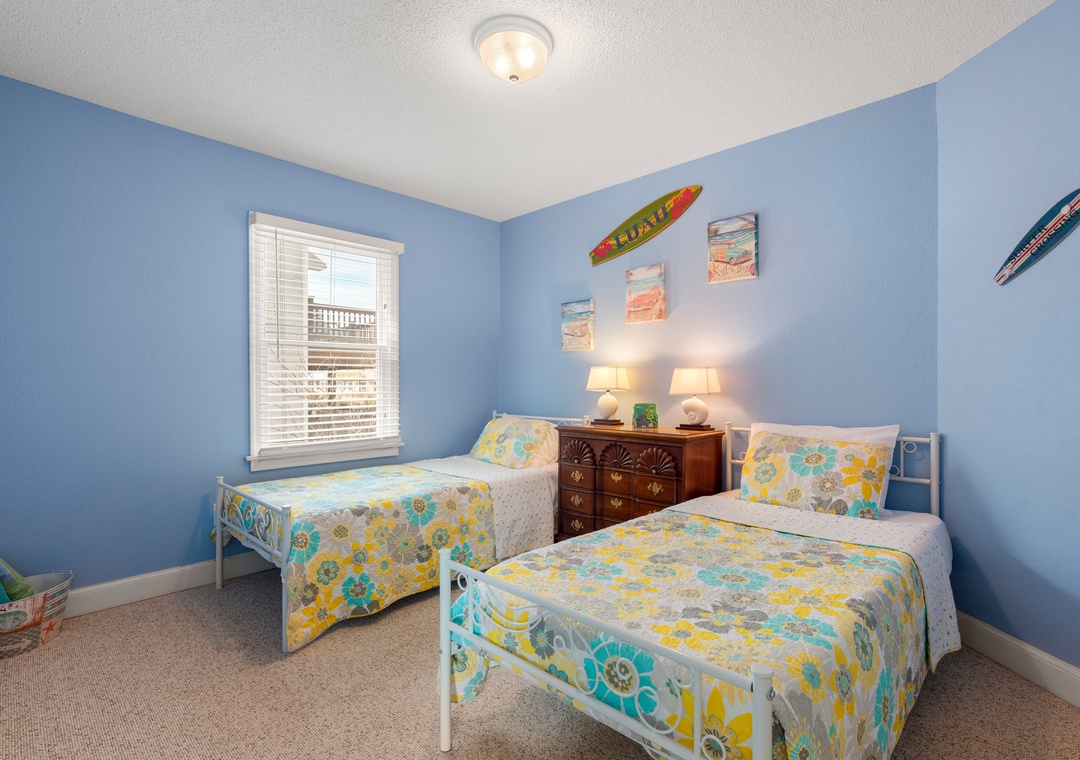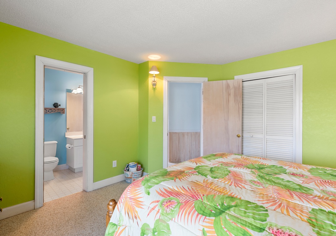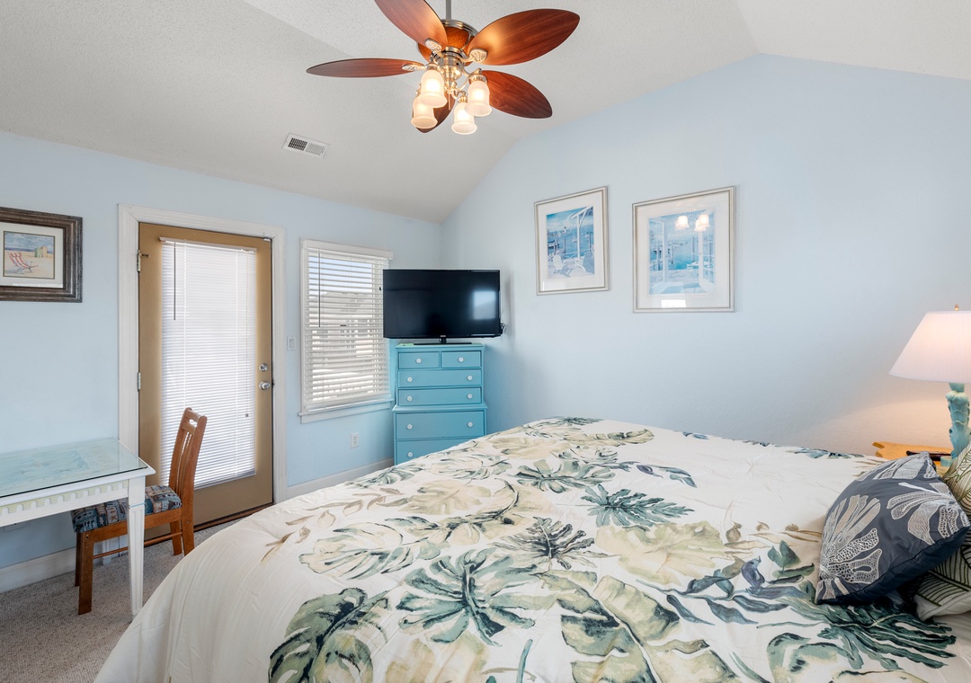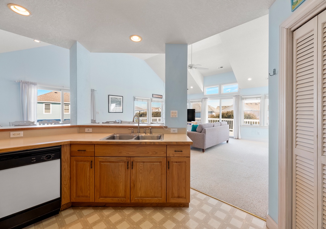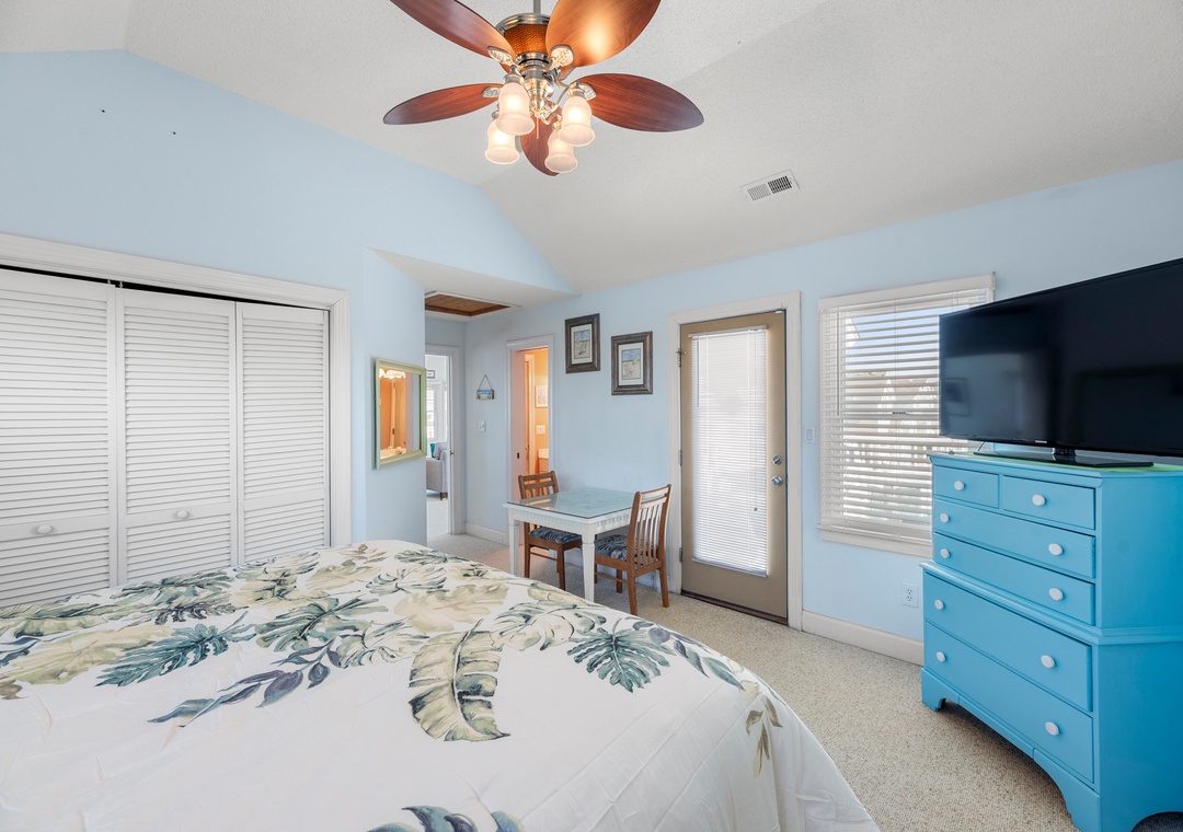 Back at the house, the top level features an open-concept layout with effortless flow between the living, dining and kitchen areas. Vaulted ceilings and plenty of windows create a bright and airy space with abundant natural light. The living area leads out to an expansive sun deck for your daily dose of Vitamin D. When you're not trying out one of Corolla's fantastic restaurants, prepare meals at home in the fully stocked and well-equipped kitchen. The spacious suite on the top-level is attached to a semi-private bath. Four more bedrooms on the mid-level will comfortably accommodate family and friends.