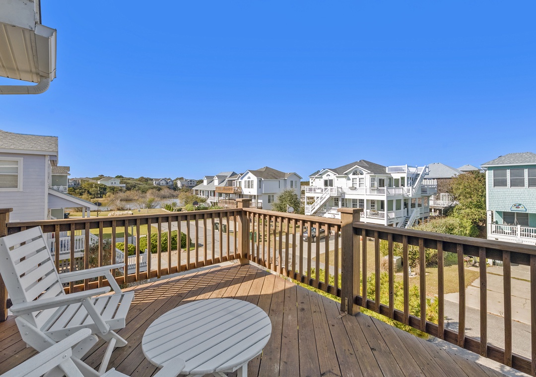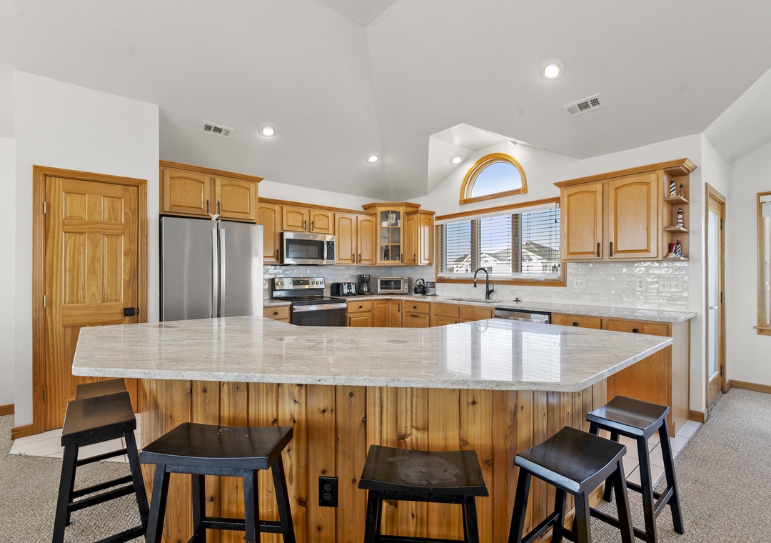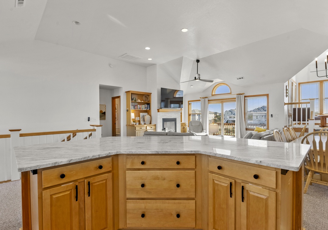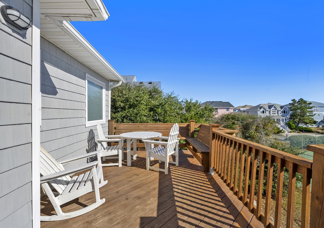 The top level features an open-concept layout with a well-equipped kitchen and bar, dining area with seating for six, a cozy captain’s nook, and a rear deck perfect for enjoying ocean breezes.