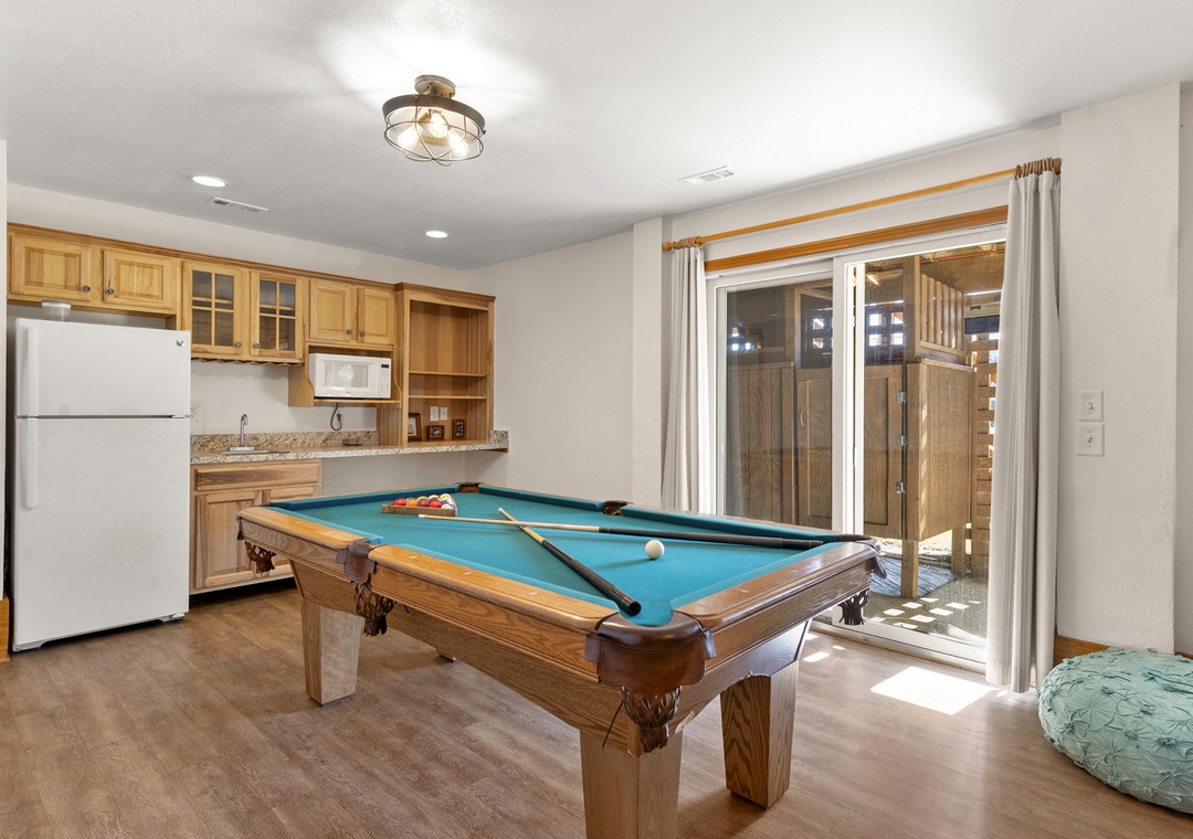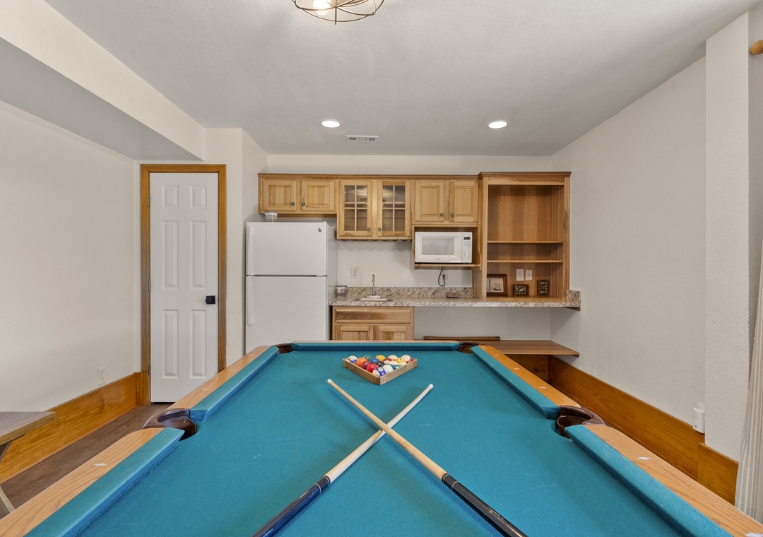 Step inside the ground level to find a king bedroom, a game room with a pool table and bar, a convenient kitchenette, an extra fridge, and a spacious storage closet.