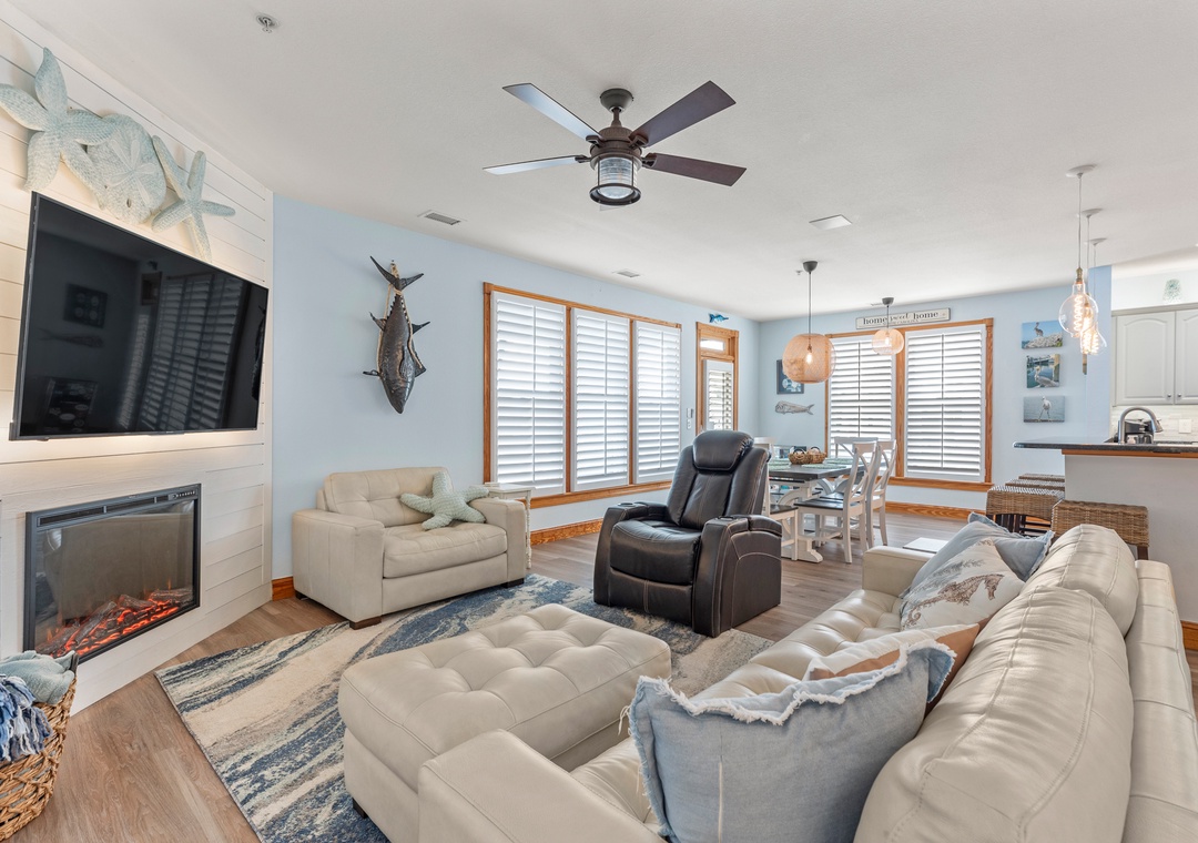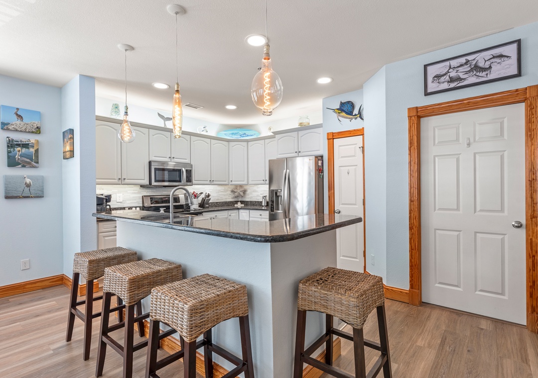 Inside you will find an open floor concept, with recently updated LVT floors this unit is great for entertaining or relaxing by the electric fireplace in the living area. Stepping into the kitchen there is a granite countertop bar and new appliances! Making your way into the king ensuite bedroom you will find your own sitting area and a bathroom with dual vanities. Other bedrooms include a bedroom with one queen and one double, and another bedroom with two double beds. There is an additional trundle mattress provided for extra sleeping arrangements.