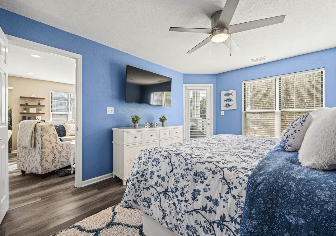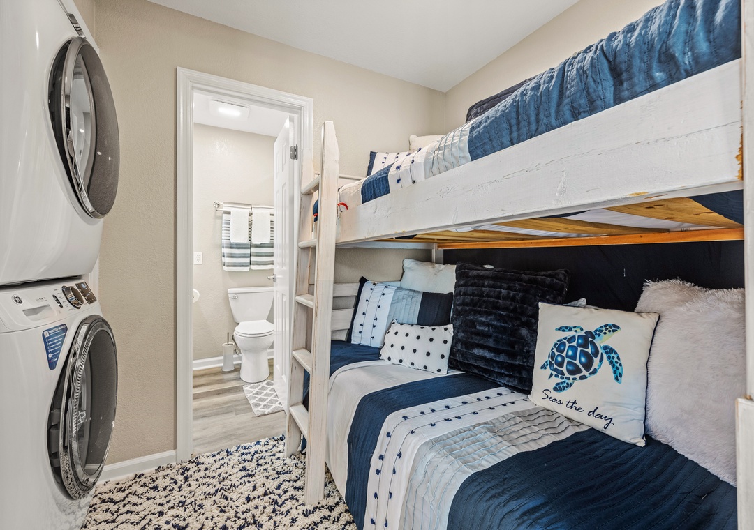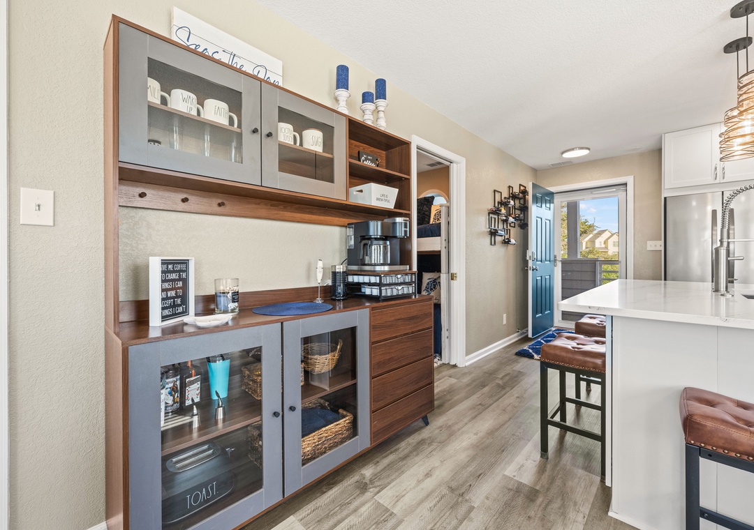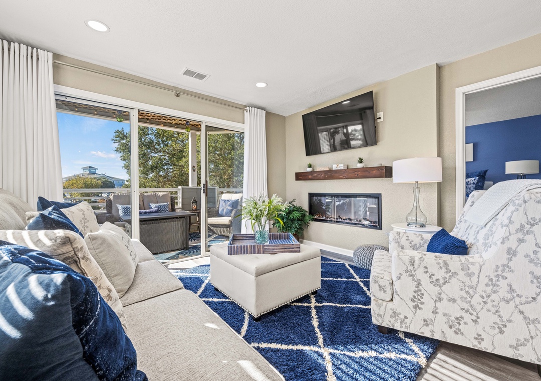 New to the Village Realty program for 2025! Located in the world-class boating community of Pirate's Cove, Seas the Day is a stunning condo that overlooks the canal and provides direct access to the waterfront boardwalk. Bring your boat and dock it at the condo's nearby private slip. The interior has been recently remodeled from top to bottom, with new flooring, fixtures and furniture throughout. After a day at the beach or enjoying the resort amenities, come home and relax in the elegantly decorated, open-concept living area with cozy electric fireplace. Sliding doors open up to the comfortably furnished covered deck where you can admire the canal views and evening sunsets. Back inside, embrace your inner chef in the remodeled kitchen with stainless steel appliances and island with bar seating. Start each day making your favorite morning brew using the fabulous built-in coffee bar. The primary suite includes a king bed along with convenient access to the deck, and a bonus room is furnished with a bunkbed for additional sleeping arrangements. Both rooms share access to a beautifully remodeled bathroom complete with luxurious rainfall showerhead for a spa-like experience.