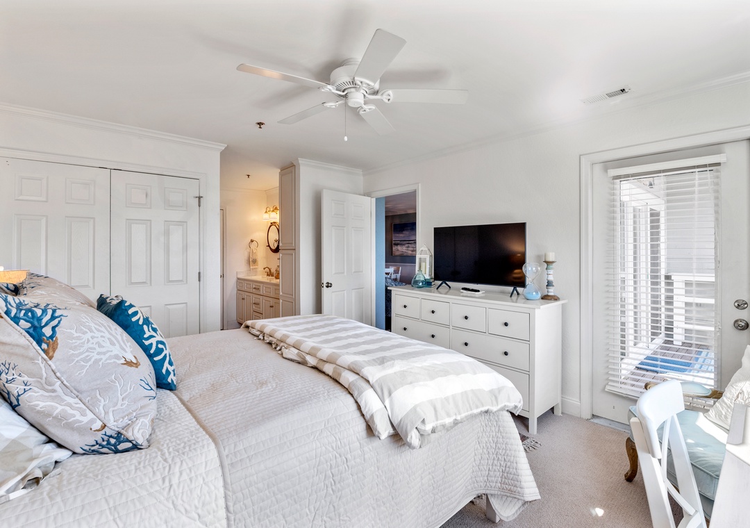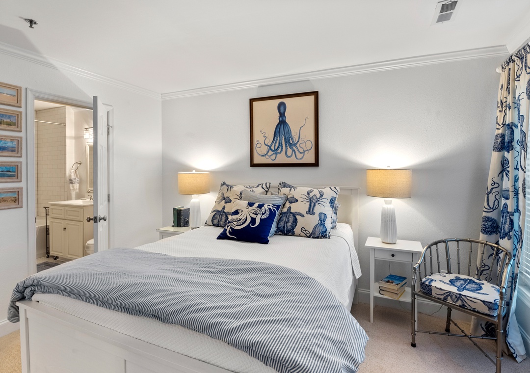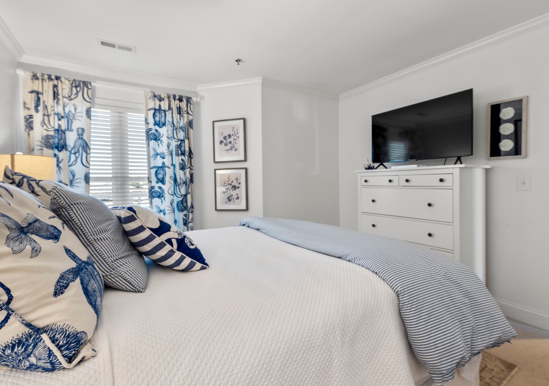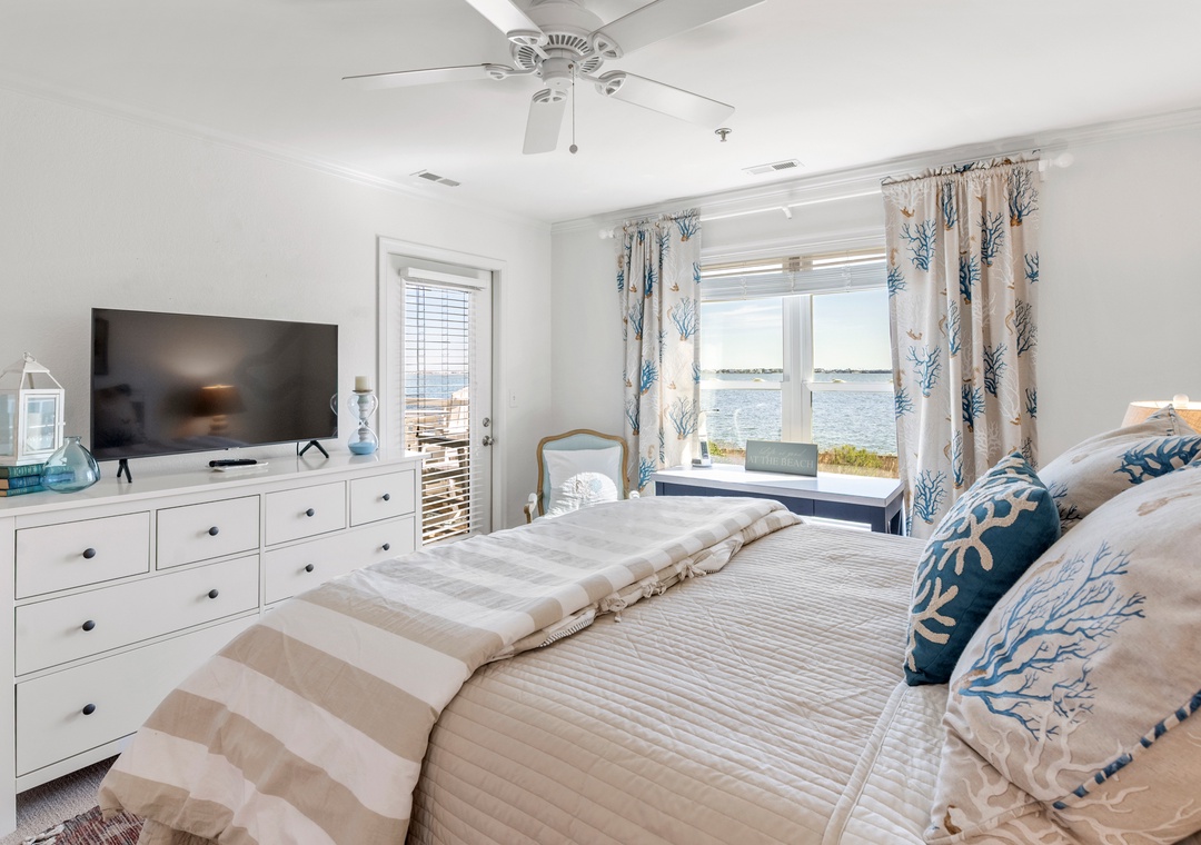A primary bedroom overlooks the sound with a queen bed, ensuite bath, private porch access, desk, and a 43” TV (check the closet for sports equipment!). The second bedroom has a Queen bed, 43” TV, and direct access to the second bath. The family room features a sleeper sofa, 50” TV, and a book & game collection.