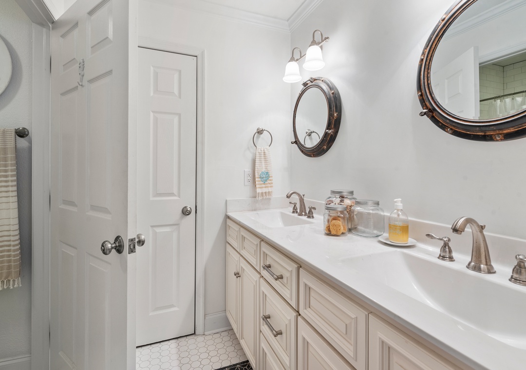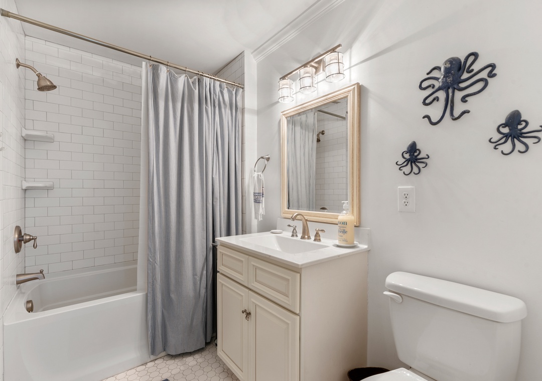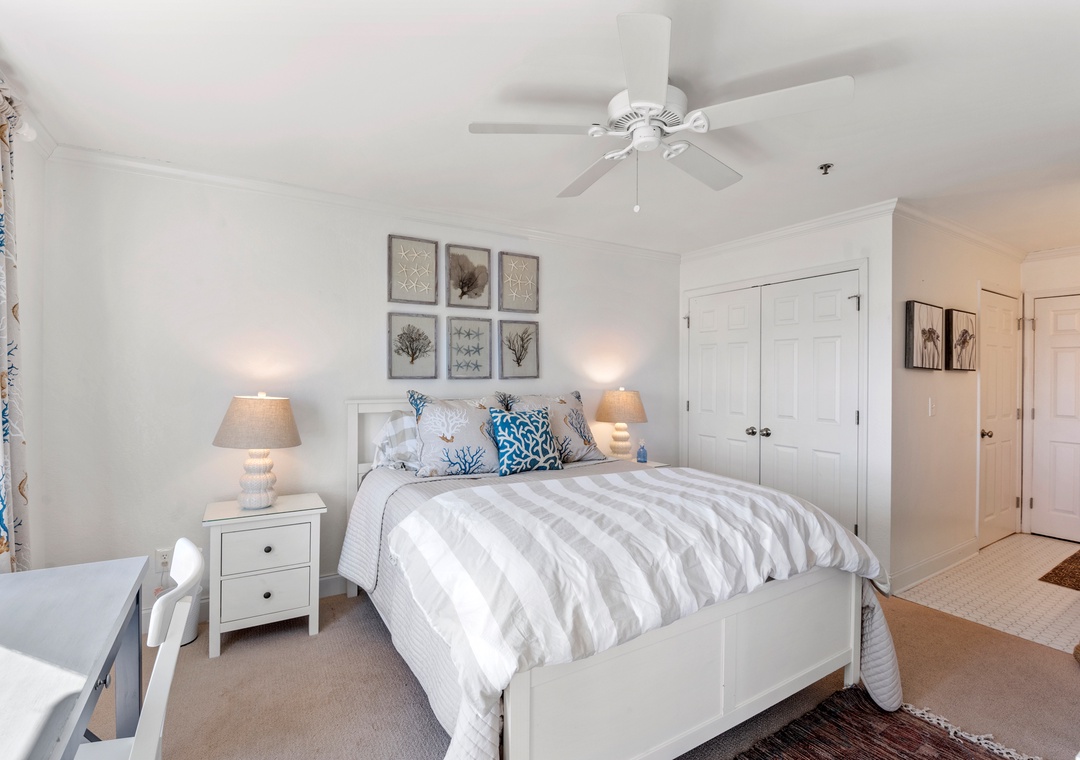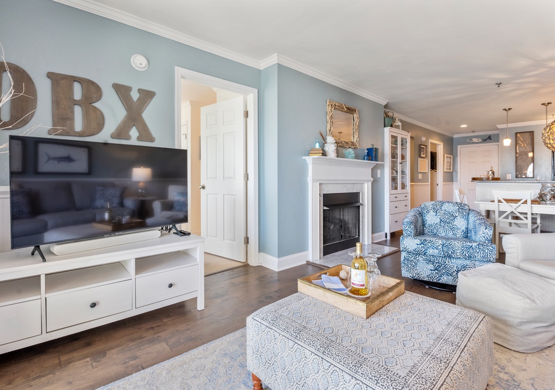 A primary bedroom overlooks the sound with a queen bed, ensuite bath, private porch access, desk, and a 43” TV (check the closet for sports equipment!). The second bedroom has a Queen bed, 43” TV, and direct access to the second bath. The family room features a sleeper sofa, 50” TV, and a book & game collection.