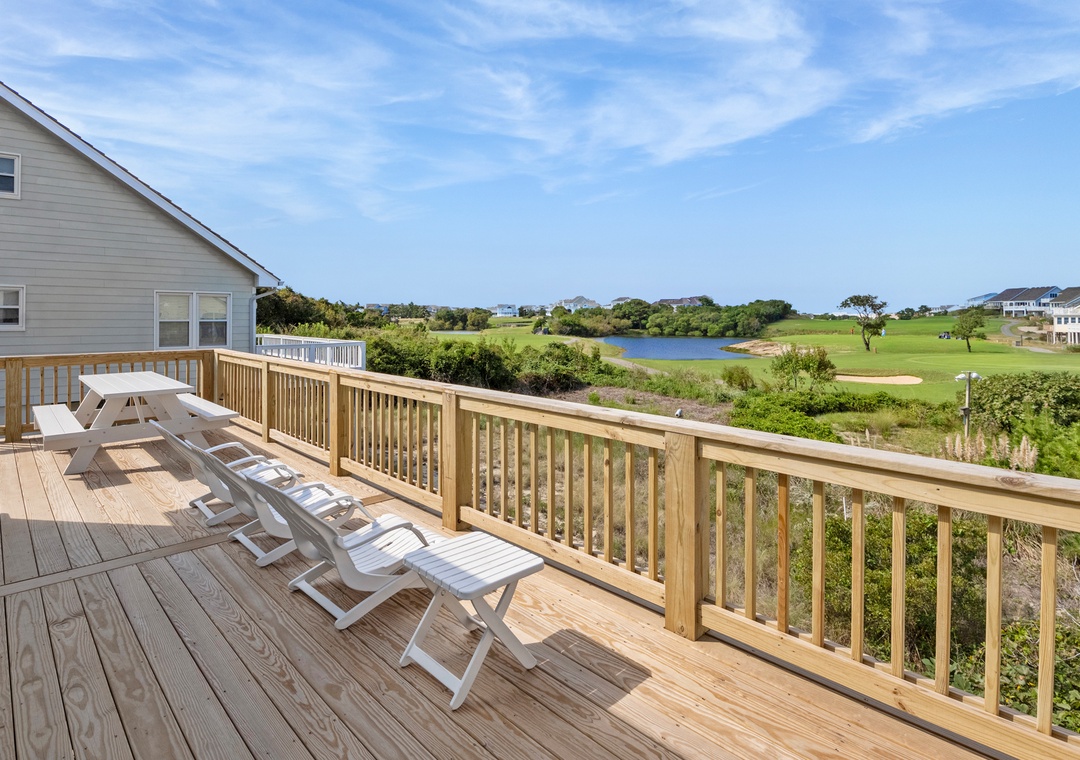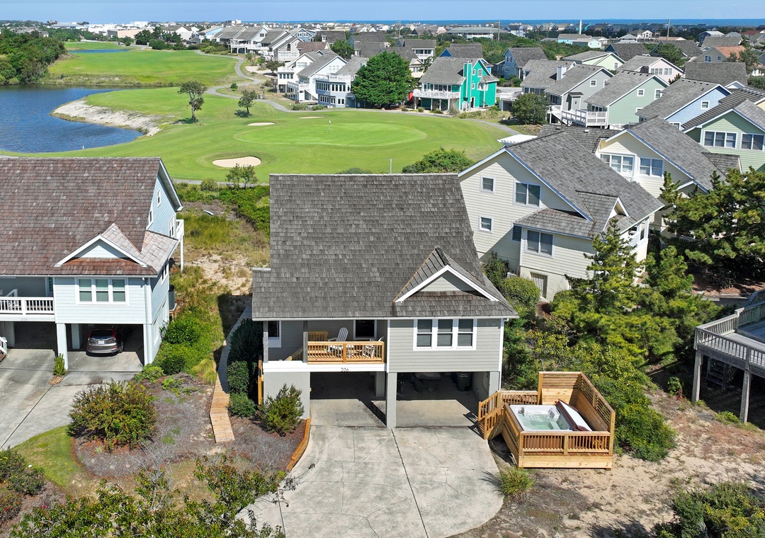 A relaxing OBX vacation starts with a deep breath in, and then... Exhale. This soundside cottage in the sought-after Village at Nags Head has been completely renovated from top to bottom, making Exhale look and feel like a brand new construction. Situated right along the Nags Head Links golf course, Exhale offers panoramic vistas of the fairway and views of the Roanoke Sound from the top floor and front porch. The ground level is equipped with a hot tub for a relaxing soak after a day at the beach.