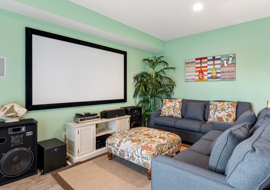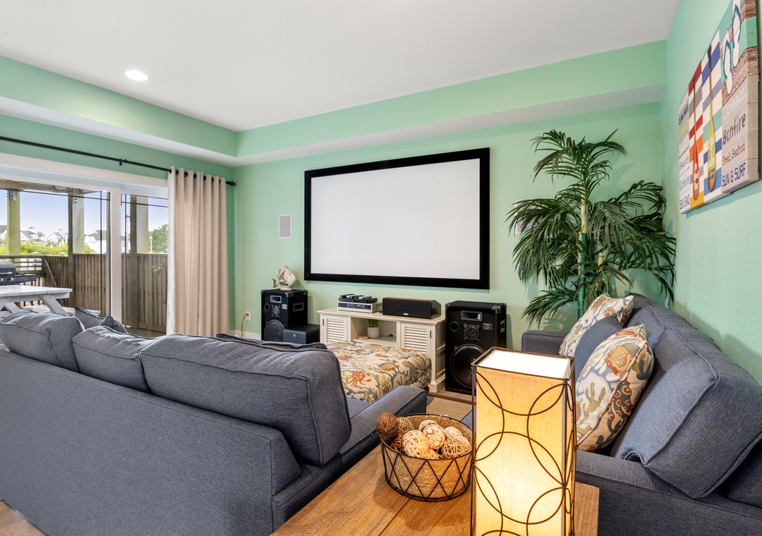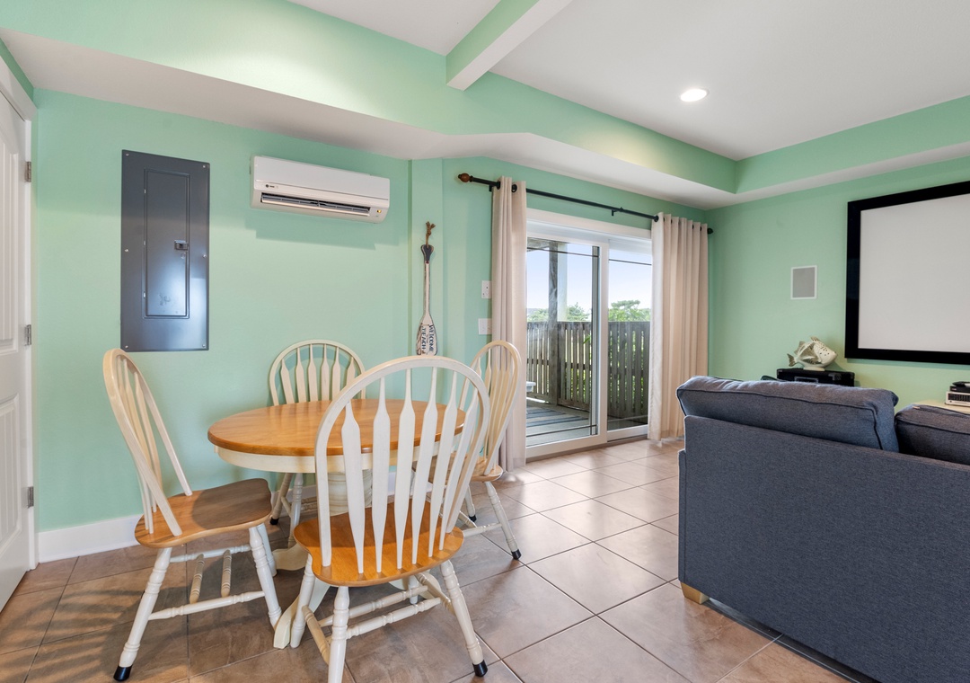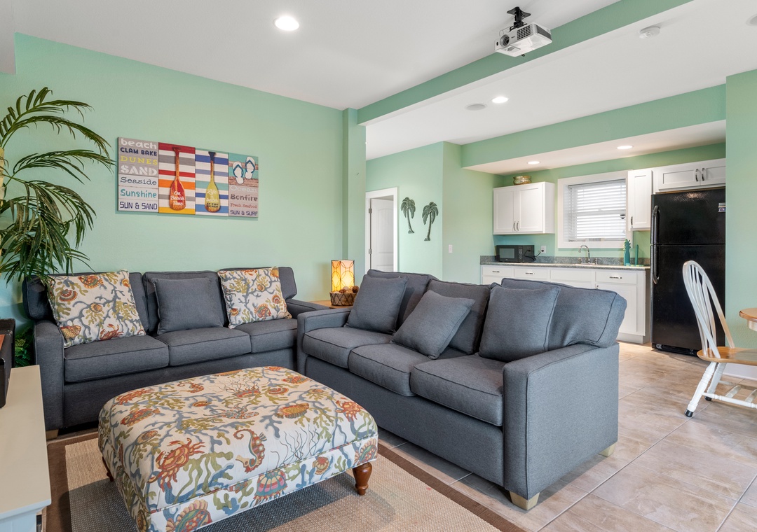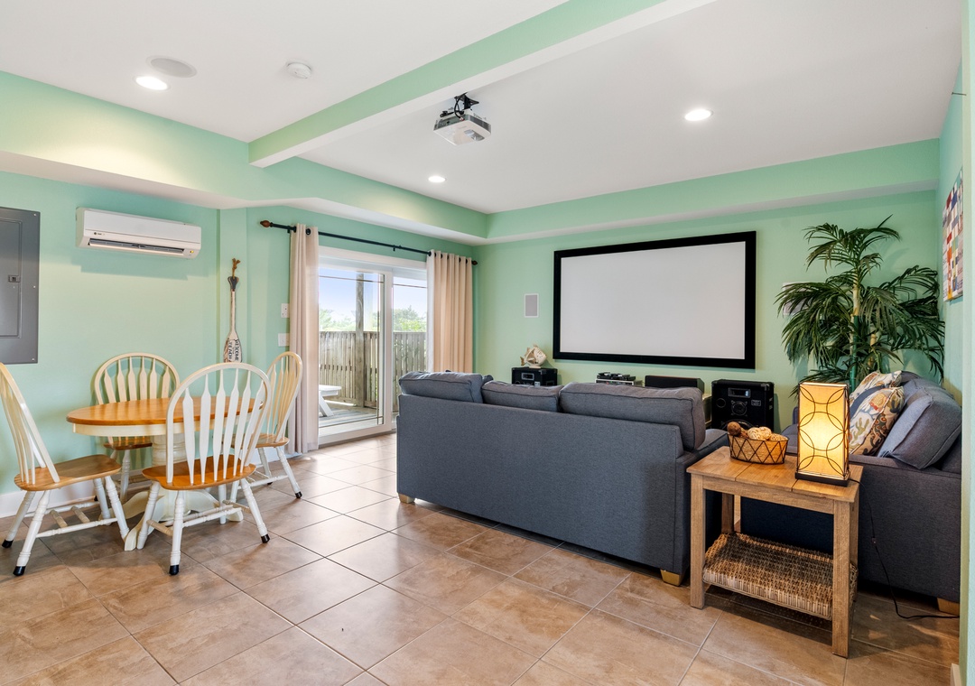 The other three bedrooms are located on the mid-level, and a media room downstairs serves as an additional common space with direct access to the private saltwater pool. After a day at the beach or exploring Nags Head, gather the family for Movie Night using the BenQ-Projector and 95-inch screen. The ground level also provides all the conveniences you'll need for fun and relaxation by the pool, including a kitchenette with full-size refrigerator and microwave for drinks and snacks, along with access to a half bath.