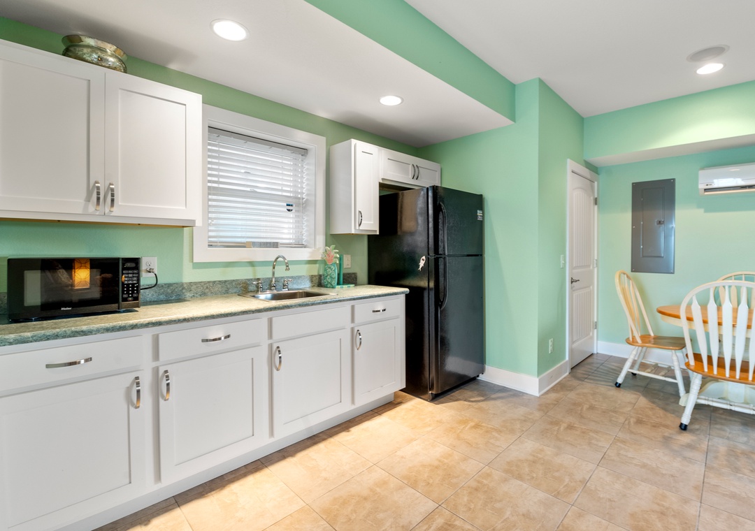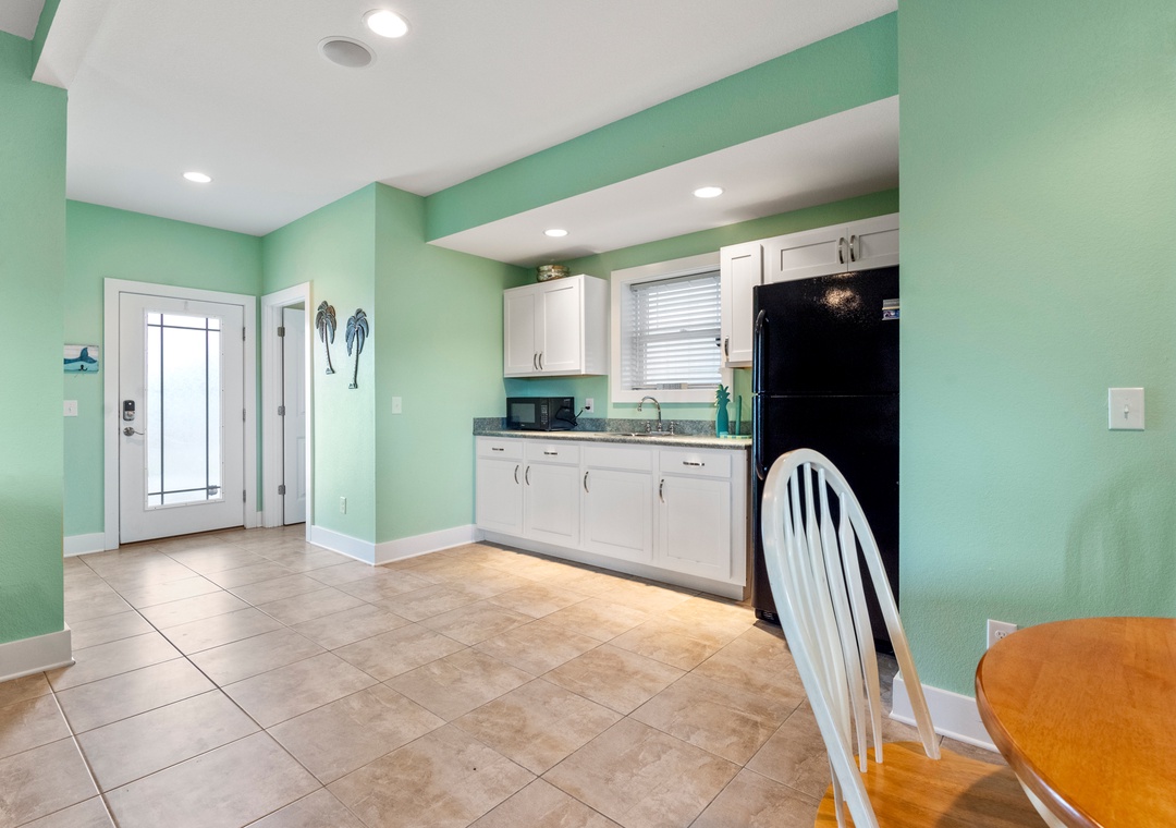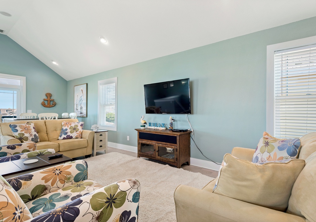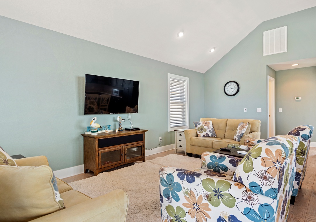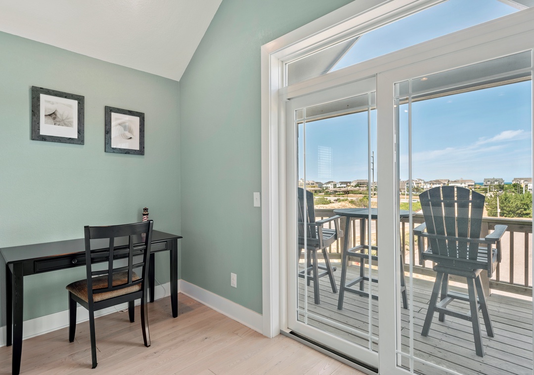 The other three bedrooms are located on the mid-level, and a media room downstairs serves as an additional common space with direct access to the private saltwater pool. After a day at the beach or exploring Nags Head, gather the family for Movie Night using the BenQ-Projector and 95-inch screen. The ground level also provides all the conveniences you'll need for fun and relaxation by the pool, including a kitchenette with full-size refrigerator and microwave for drinks and snacks, along with access to a half bath.