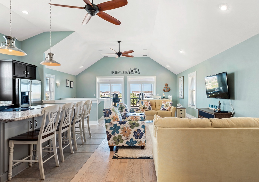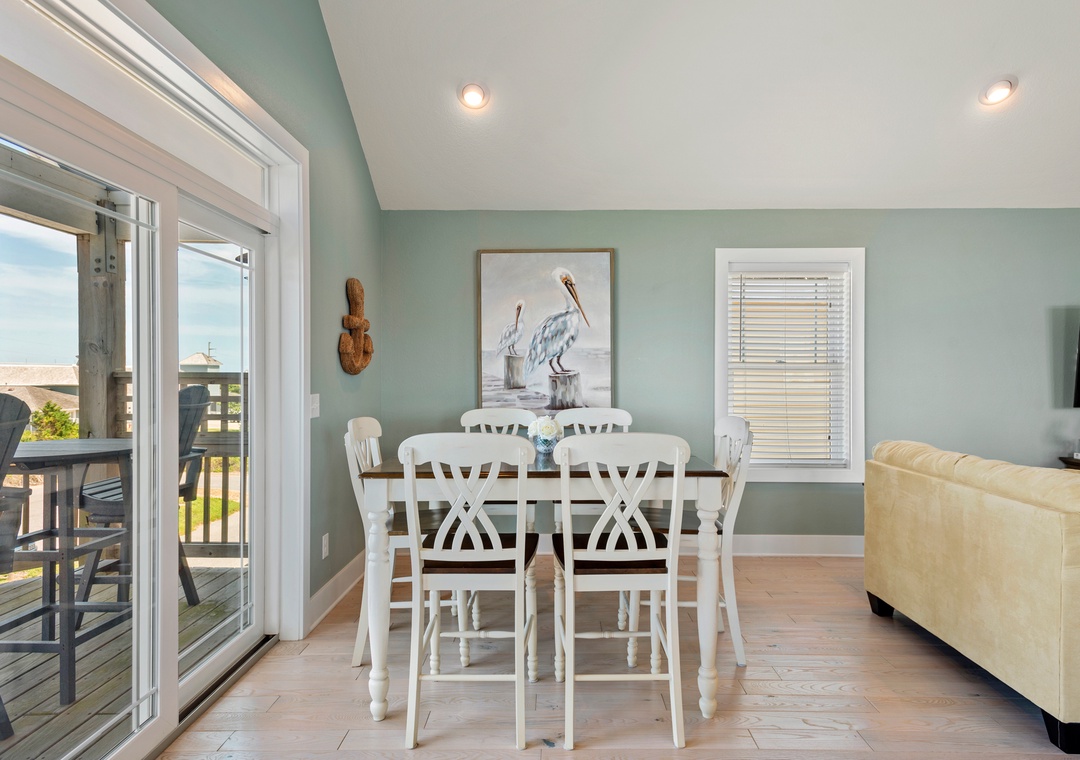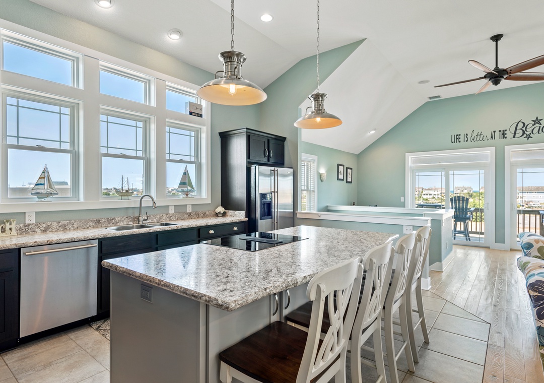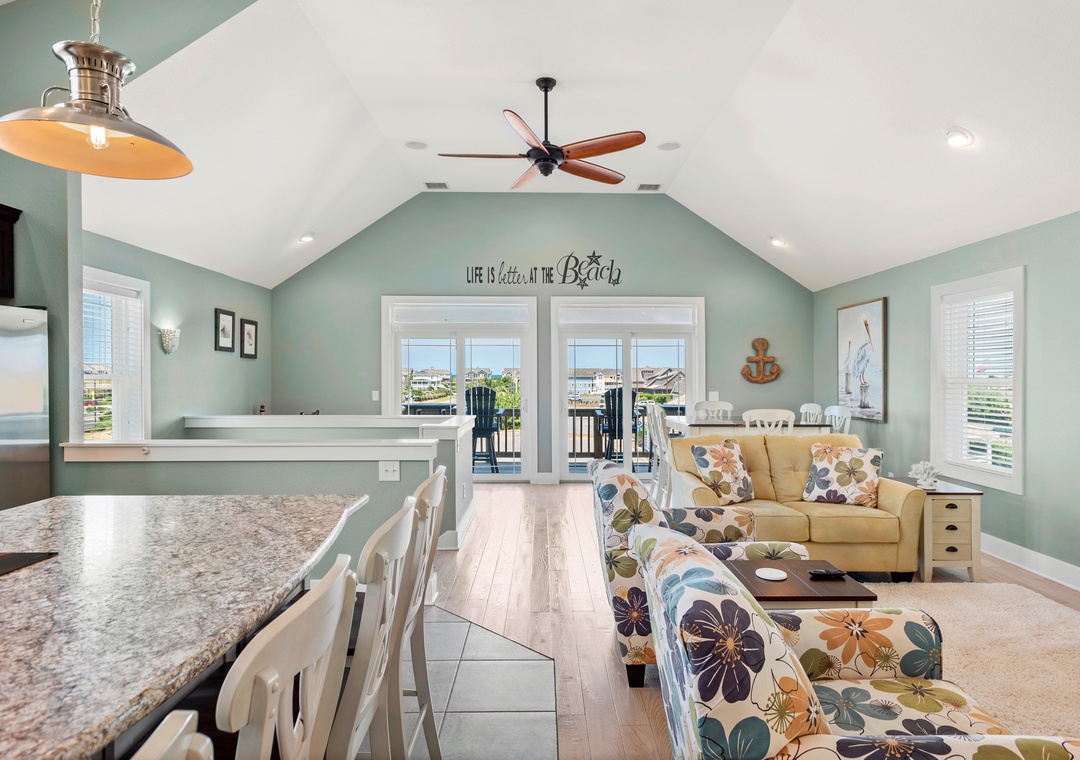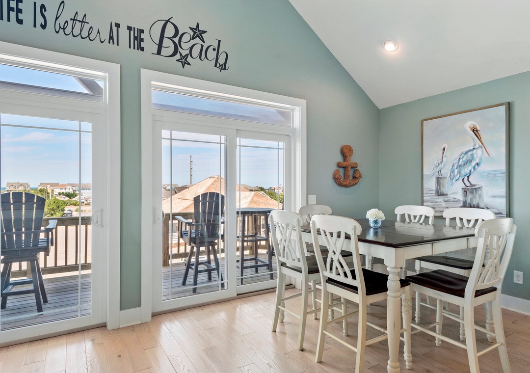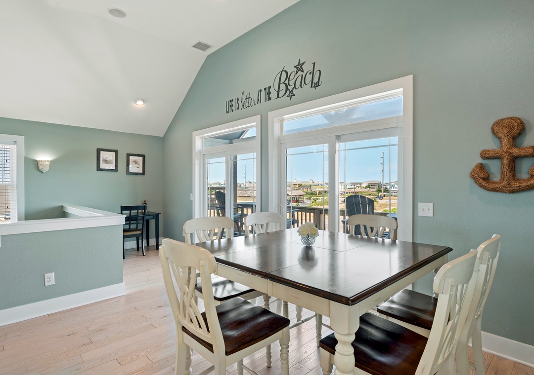 Look forward to summer vibes and a lifetime of memories when you reserve Endless Summer, a four-bedroom custom-built home situated along the Village at Nags Head golf course. The reverse floor plan provides the top level great room with vaulted ceilings and a horizon ocean view. Two sliding doors let in an abundance of natural light and open onto the front deck for effortless indoor/outdoor living. The living and dining areas feature practical and beach-friendly hardwood floors, and an open-concept layout encourages quality time spent together. The chef in your family will appreciate the updated kitchen with stainless steel appliances and a large island overlooking the great room. The primary bedroom on the top floor includes an ensuite bath as well as direct access to a second covered deck overlooking the golf course and pool below.