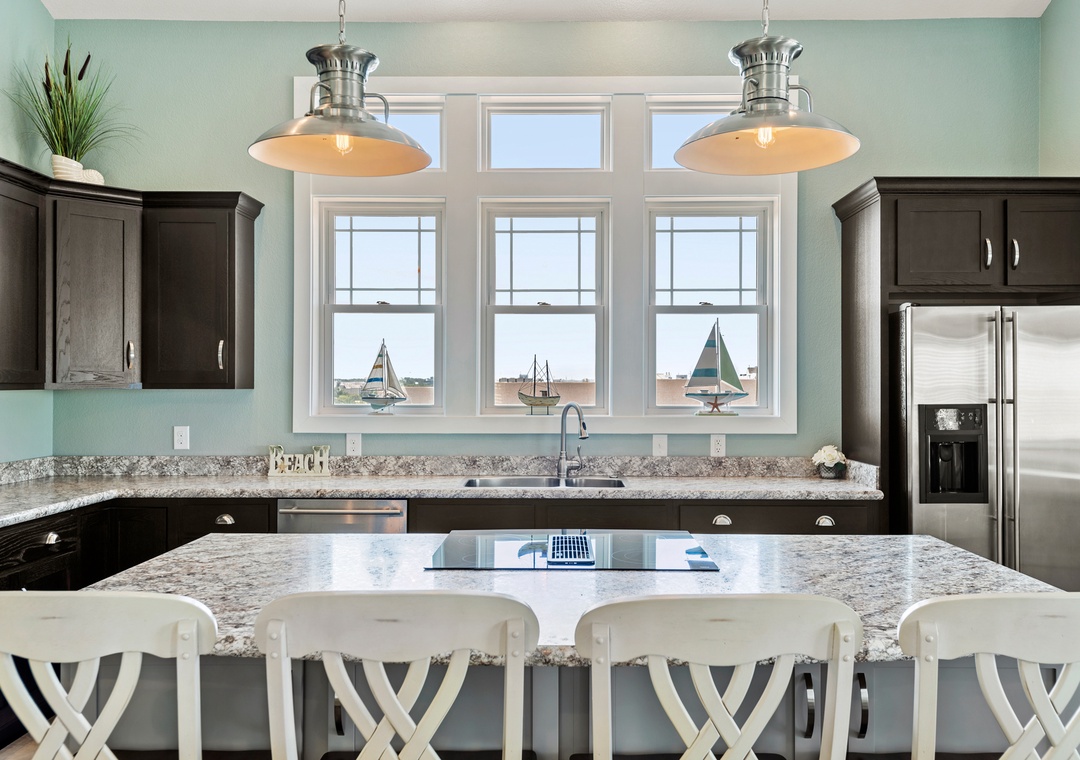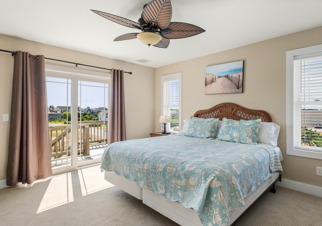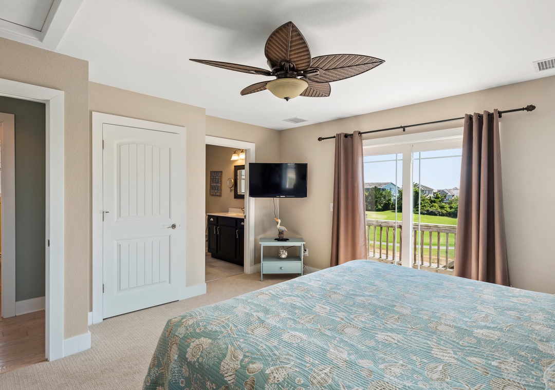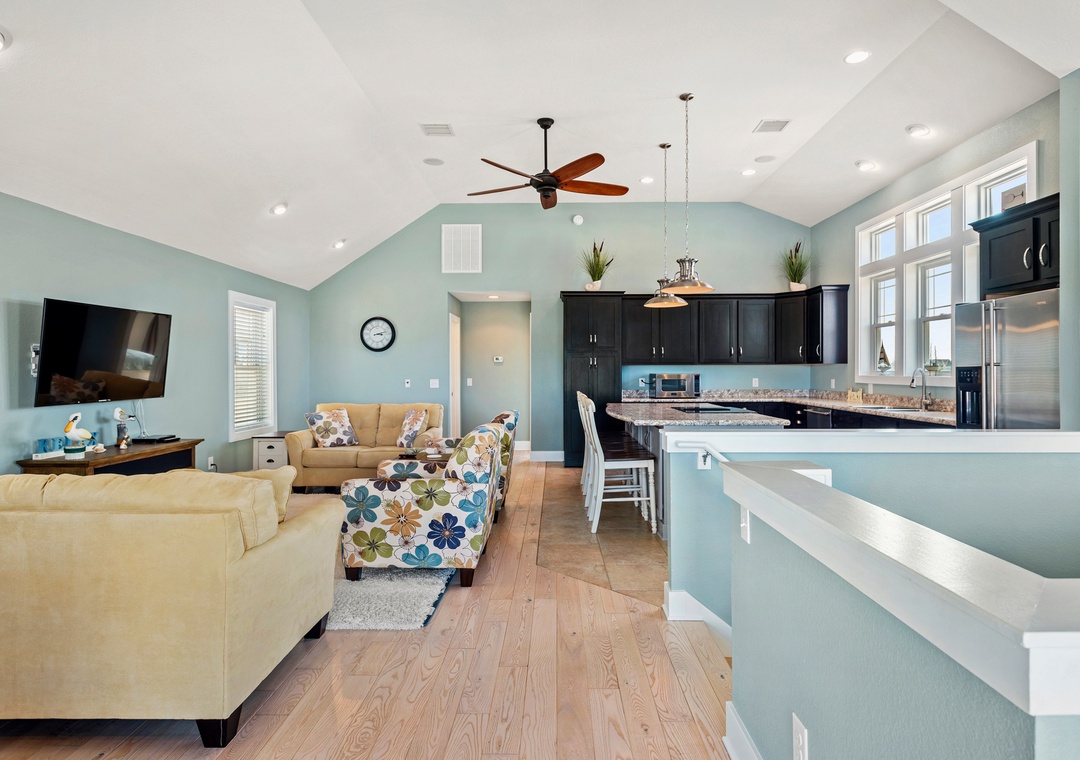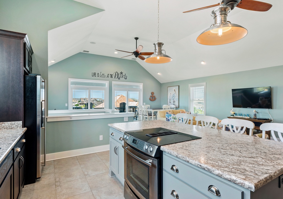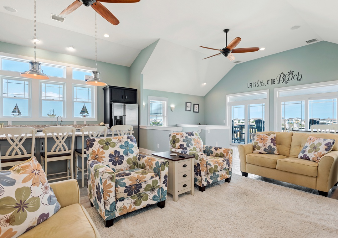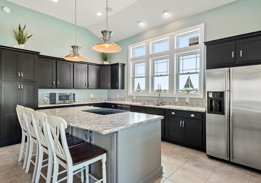 Look forward to summer vibes and a lifetime of memories when you reserve Endless Summer, a four-bedroom custom-built home situated along the Village at Nags Head golf course. The reverse floor plan provides the top level great room with vaulted ceilings and a horizon ocean view. Two sliding doors let in an abundance of natural light and open onto the front deck for effortless indoor/outdoor living. The living and dining areas feature practical and beach-friendly hardwood floors, and an open-concept layout encourages quality time spent together. The chef in your family will appreciate the updated kitchen with stainless steel appliances and a large island overlooking the great room. The primary bedroom on the top floor includes an ensuite bath as well as direct access to a second covered deck overlooking the golf course and pool below.