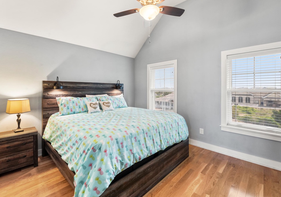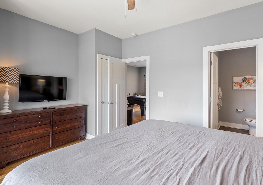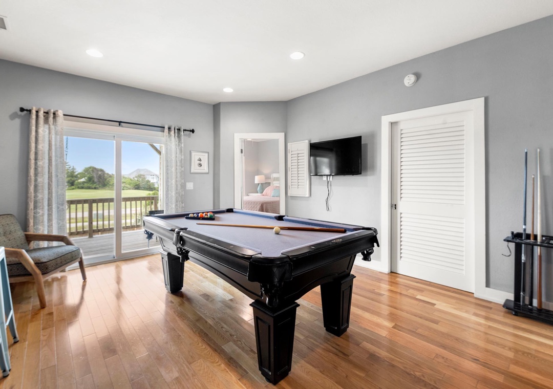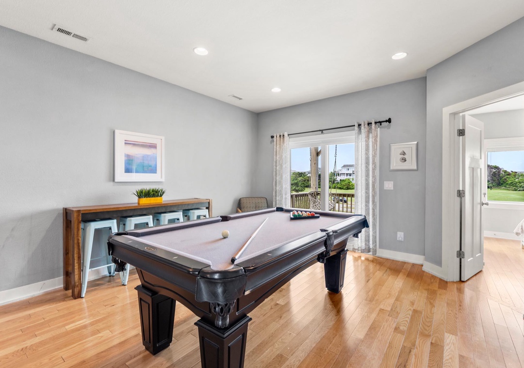 On the mid-level, the game room with pool table will provide hours of indoor entertainment. Two additional king suites with private baths will comfortably accommodate family and friends. Downstairs, you'll find two more guest bedrooms and a fourth full bath. There's also a den that can serve as an additional hangout space, with direct access to the pool area. Use the wet bar with full-size fridge for convenient poolside drinks and snacks without having to go upstairs.