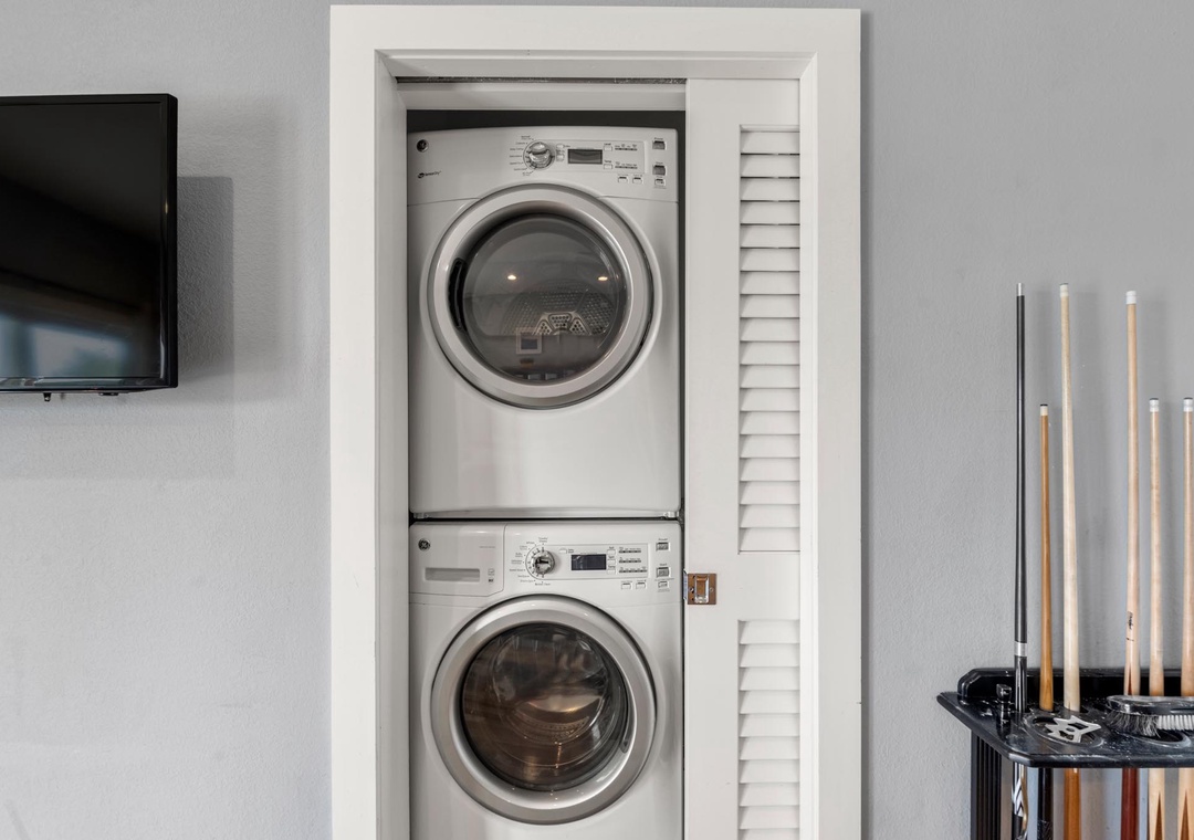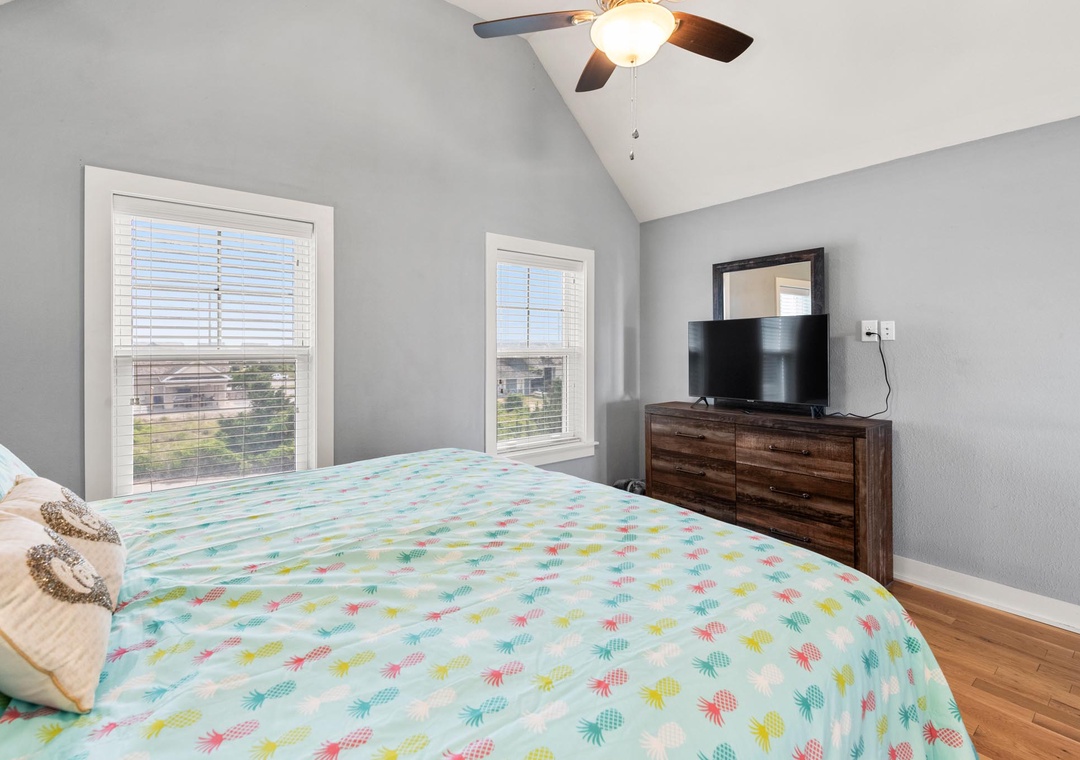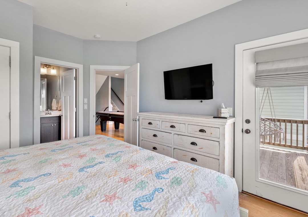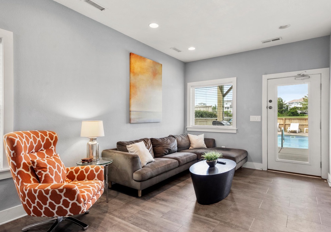 On the mid-level, the game room with pool table will provide hours of indoor entertainment. Two additional king suites with private baths will comfortably accommodate family and friends. Downstairs, you'll find two more guest bedrooms and a fourth full bath. There's also a den that can serve as an additional hangout space, with direct access to the pool area. Use the wet bar with full-size fridge for convenient poolside drinks and snacks without having to go upstairs.