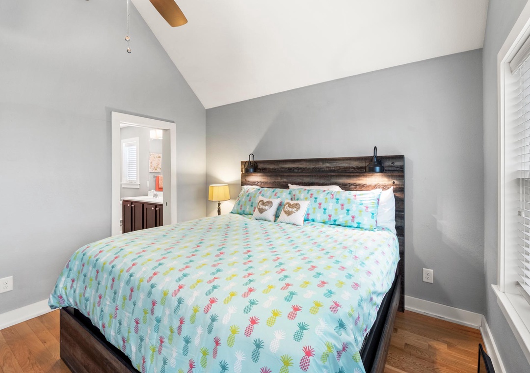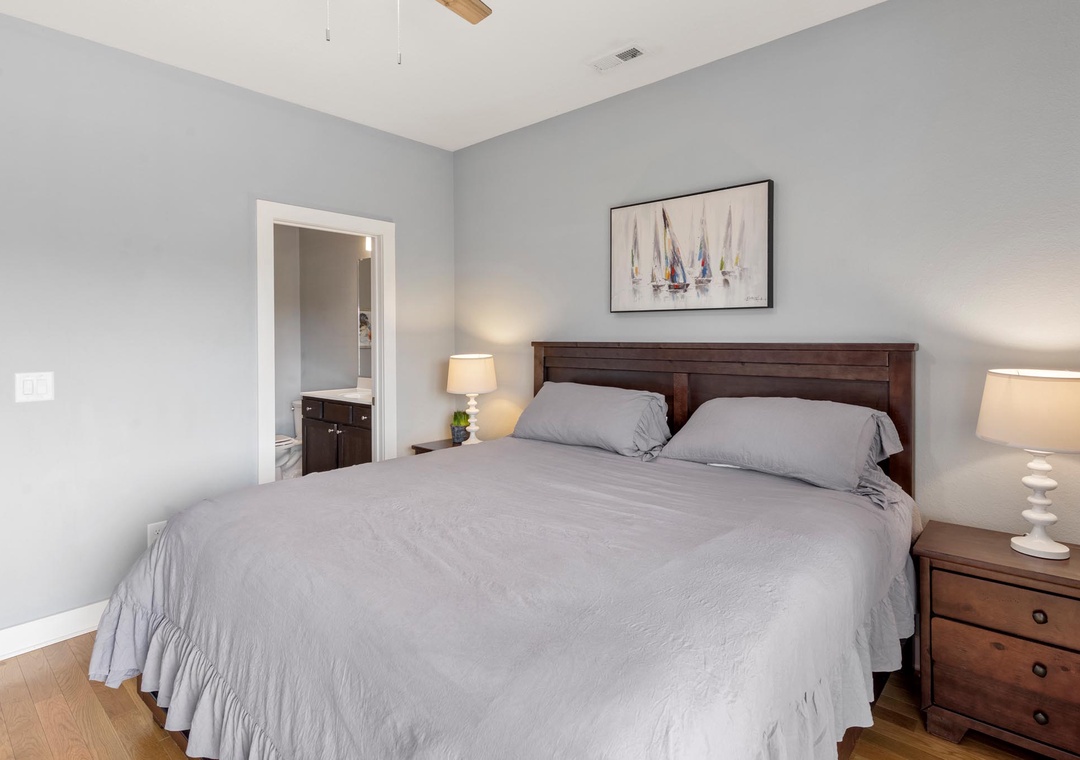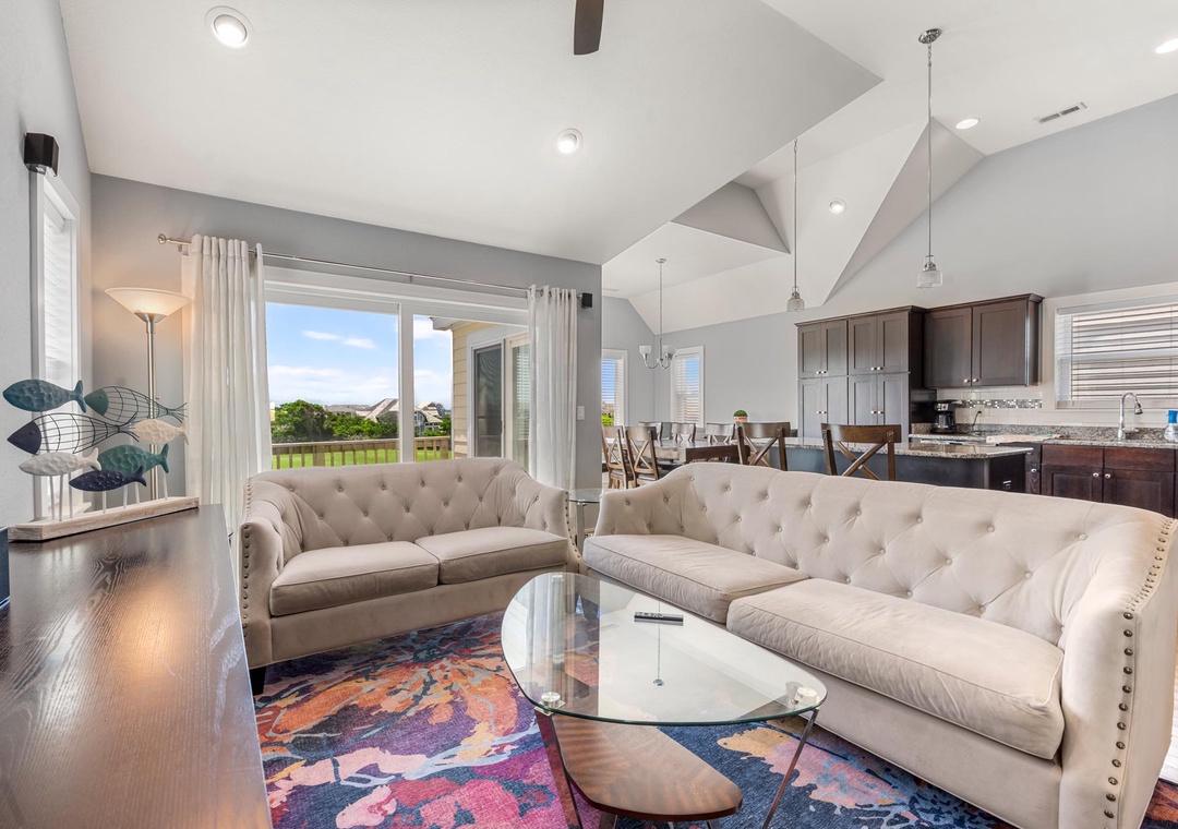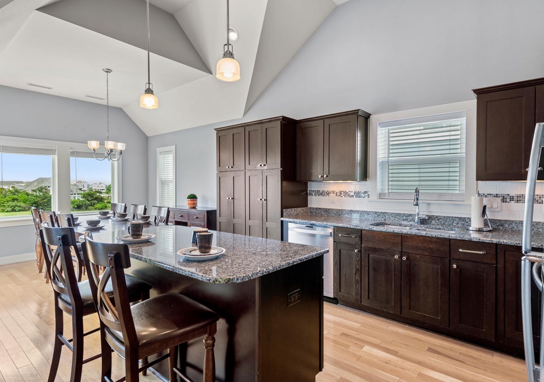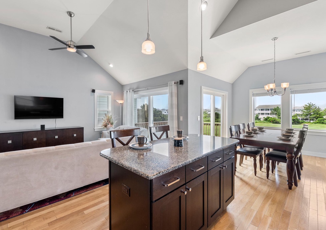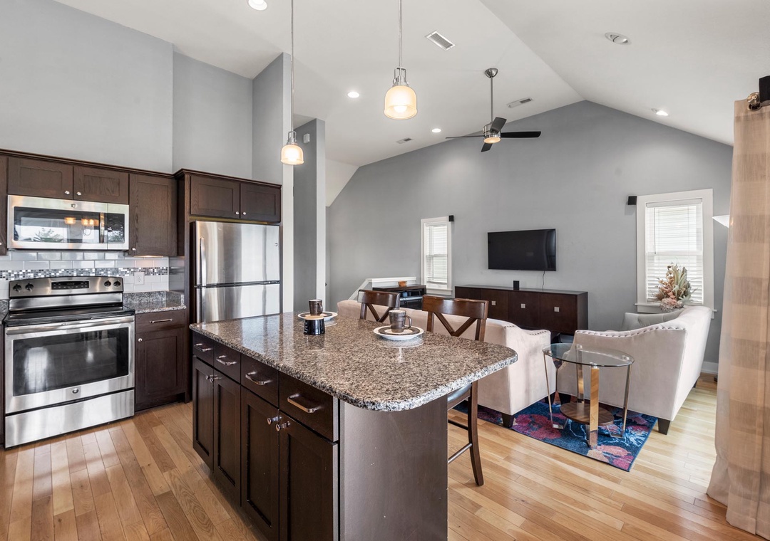 A comfortably furnished great room features vaulted ceilings and hardwood flooring throughout. This open-concept space leads out to a sun deck overlooking the golf course and pool below. It's the perfect place to enjoy an evening cocktail during sunset. When you're not dining out, prepare meals at home in the well-equipped kitchen with granite countertops and stainless steel appliances. The primary bedroom is conveniently located just off the great room and includes a private bath with double vanity and spacious walk-in shower.