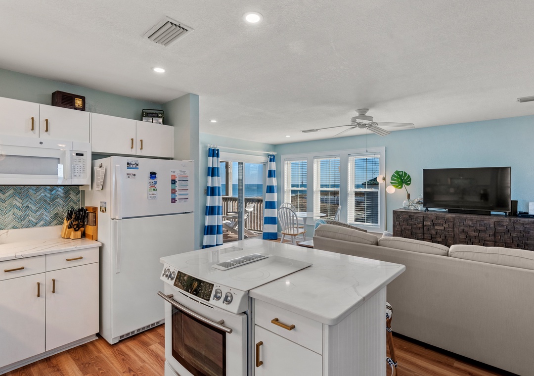 Thank you for your review, Valerie! We're glad you found the condo beautiful and well-located near shopping and restaurants. It's great to hear the kitchen and thoughtful amenities, like the laundry basket and beach gear, added to your comfort. We're happy you enjoyed the balcony views and hope to host you again for another lovely stay.Village Realty staff