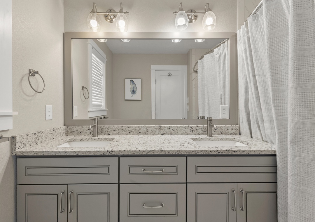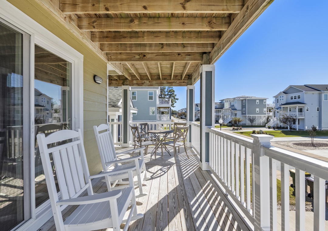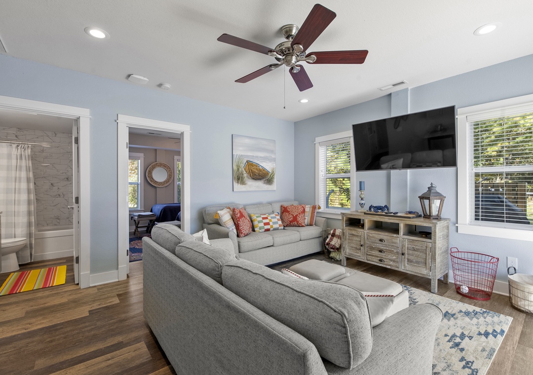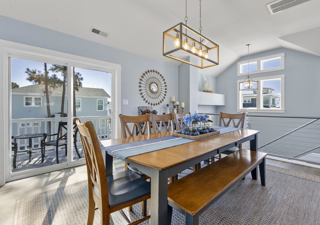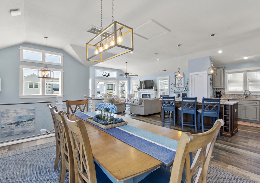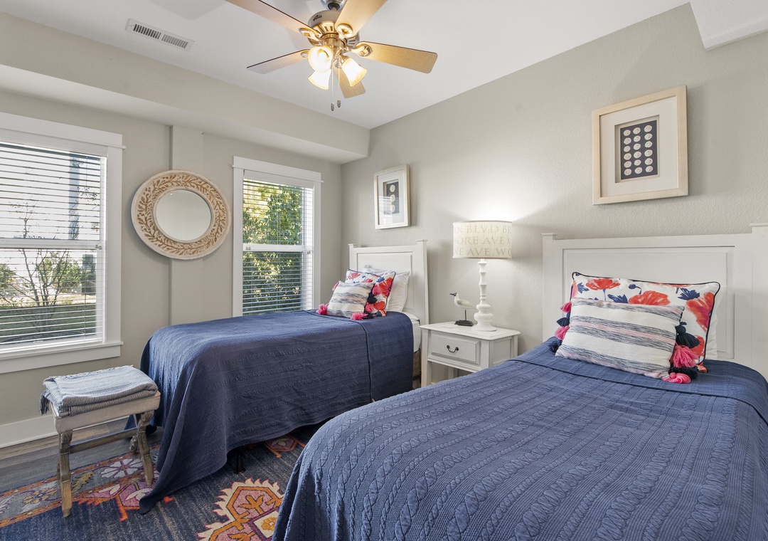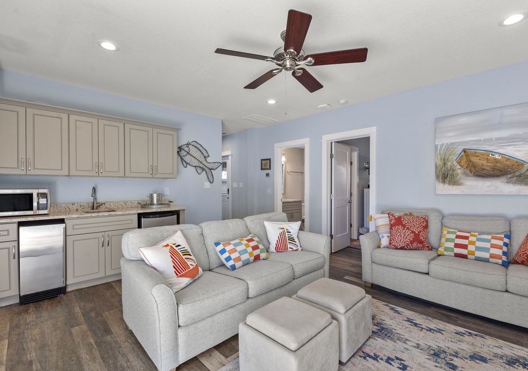 The ground level is all about fun and relaxation, with a game room complete with a wet bar, mini-fridge, and ice maker, plus a TV and plenty of games. On this level there is also a room with two twin beds connected to a semi-private bath. Step outside to your private oasis featuring a 10-by-24-foot pool, hot tub, and a fully fenced outdoor area with dining and lounge seating for everyone to enjoy.
