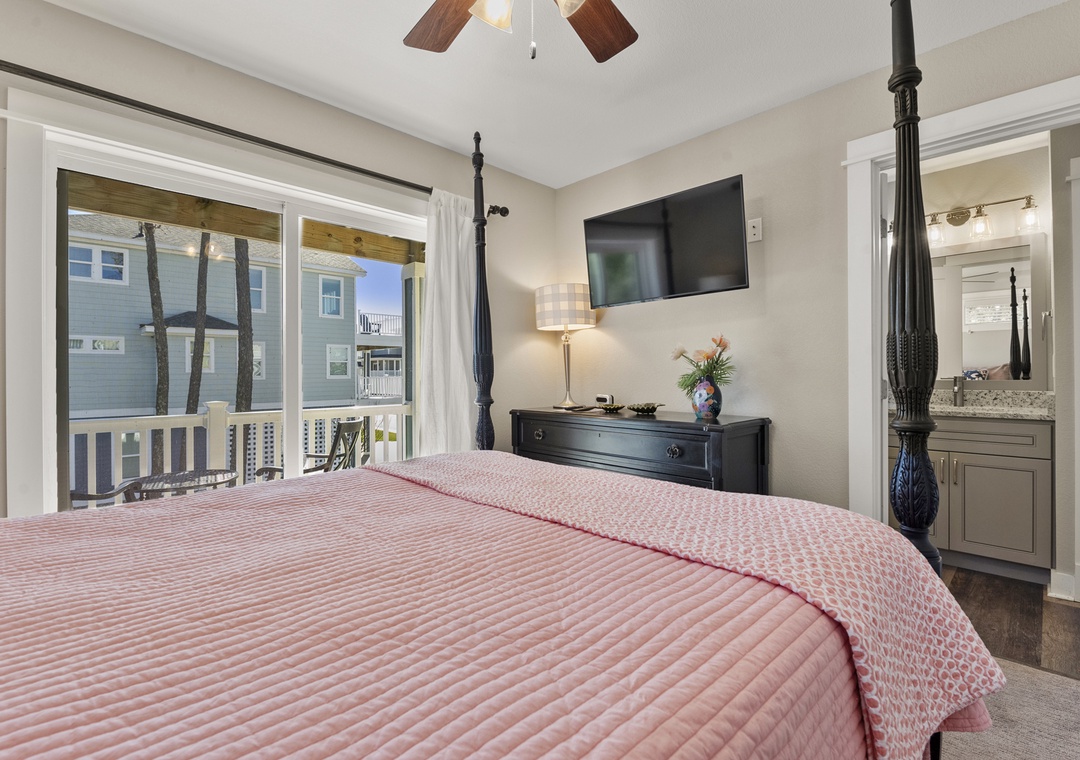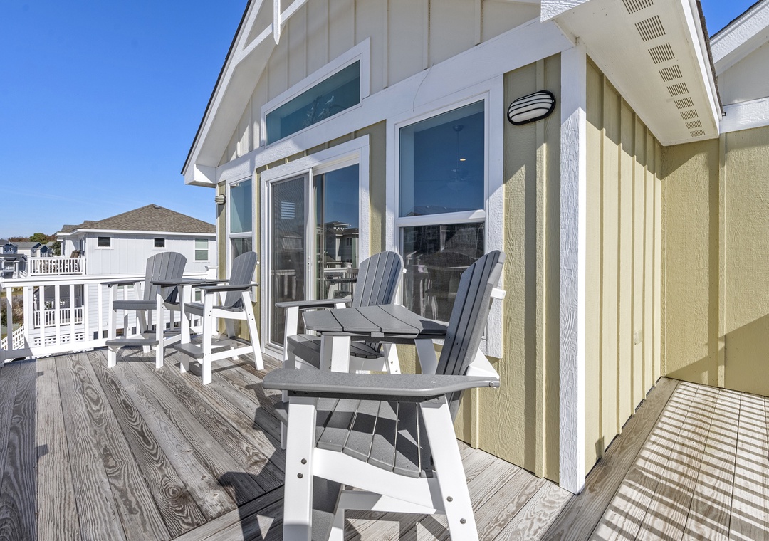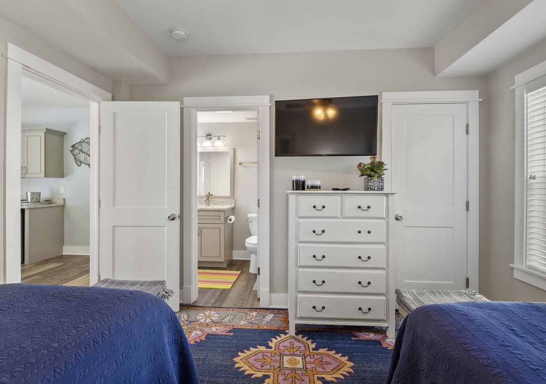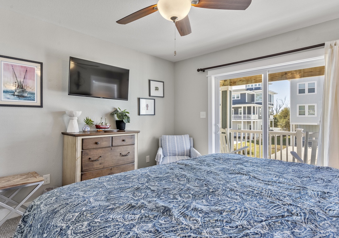 Back inside on the middle level, you’ll find a luxurious king bedroom with an ensuite bathroom featuring a tiled shower and soaking tub, plus direct access to a deck overlooking the sound. On this level you will also find a queen bedroom and a bedroom with a pyramid bunk and trundle.