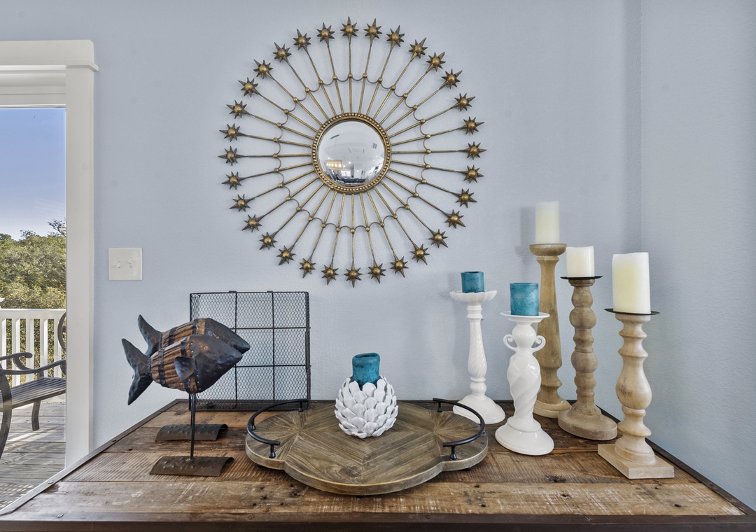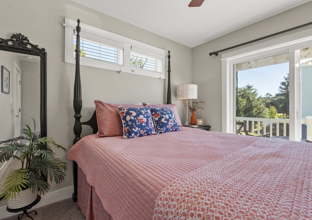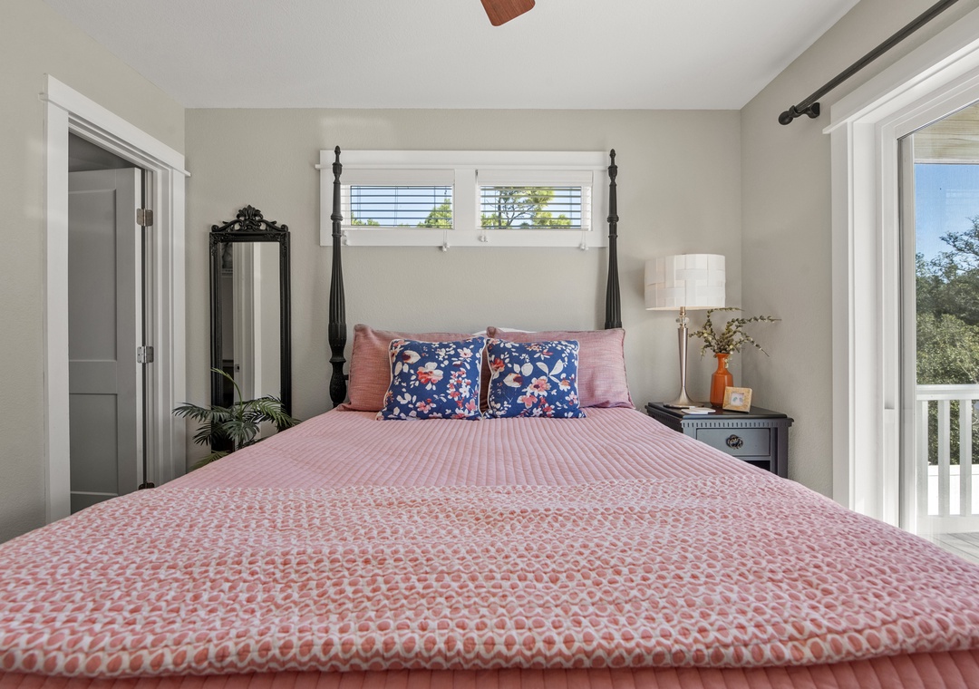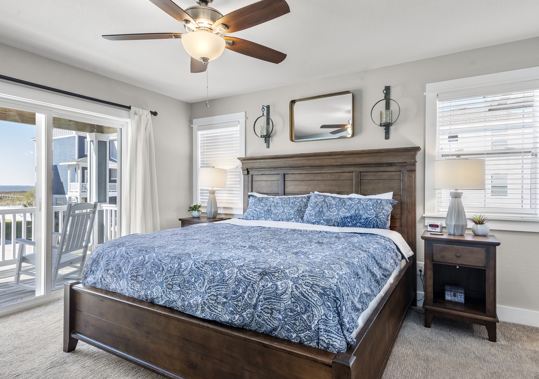 Back inside on the middle level, you’ll find a luxurious king bedroom with an ensuite bathroom featuring a tiled shower and soaking tub, plus direct access to a deck overlooking the sound. On this level you will also find a queen bedroom and a bedroom with a pyramid bunk and trundle.