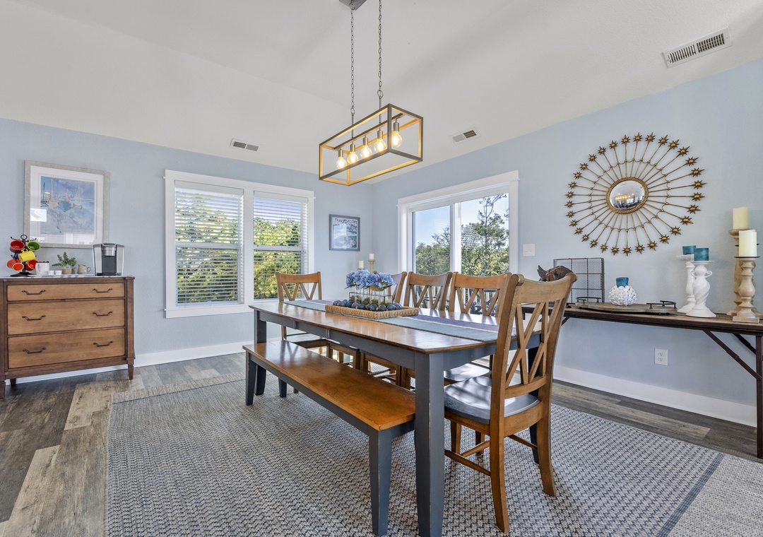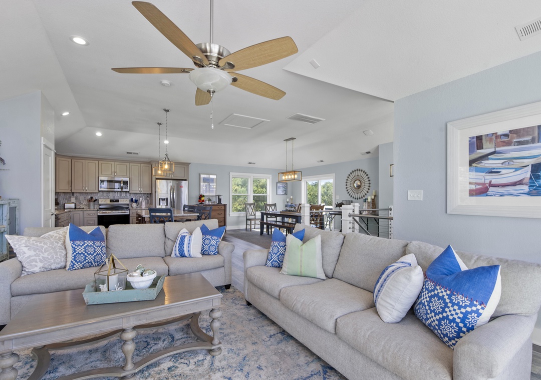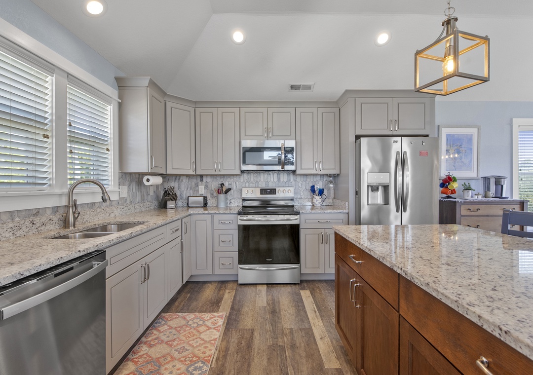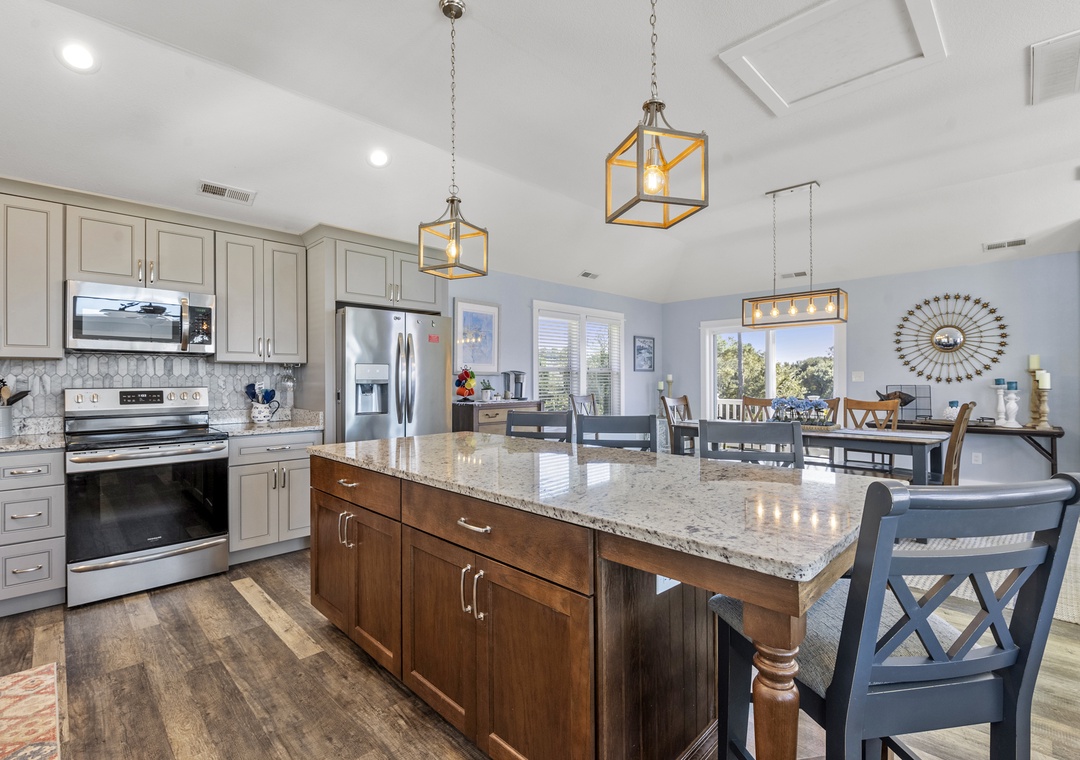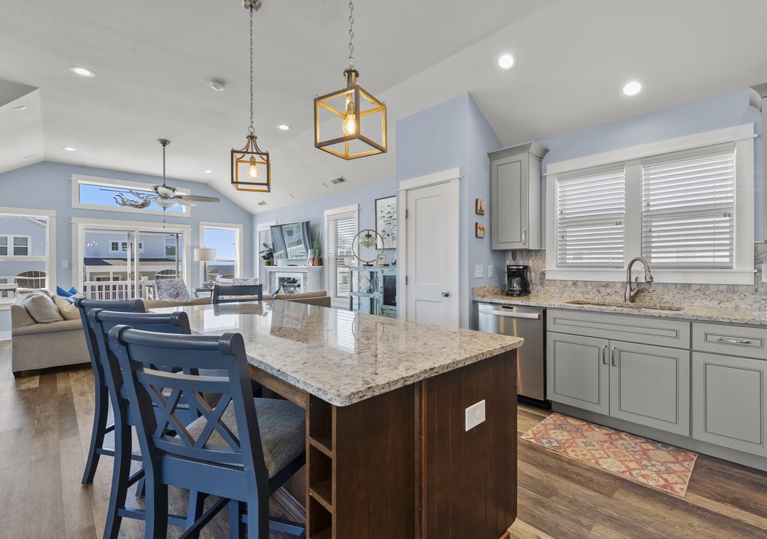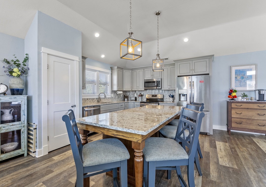 The top level features an airy great room with soaring ceilings, beautiful flooring, and a cozy electric fireplace, creating the ideal space to gather. A 55” TV and open-concept design make it perfect for entertaining, while the expansive windows and deck provide spectacular sunset views. The gourmet kitchen is a chef’s dream with stainless steel appliances, granite countertops, a large island with seating, and a coffee station, all flowing into a spacious dining area.