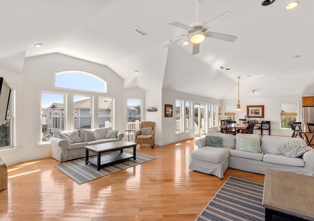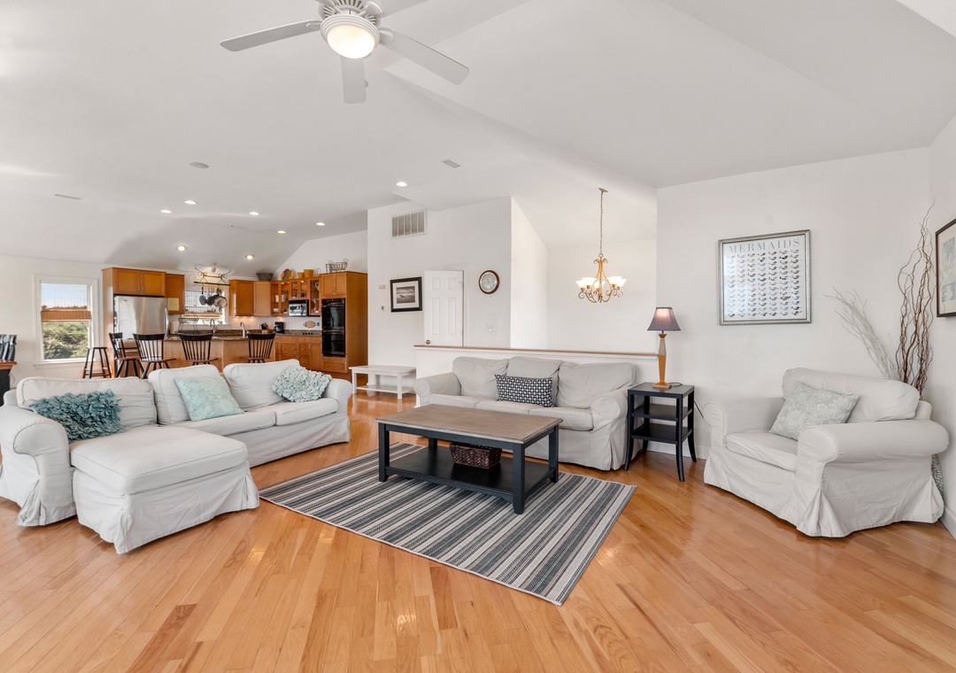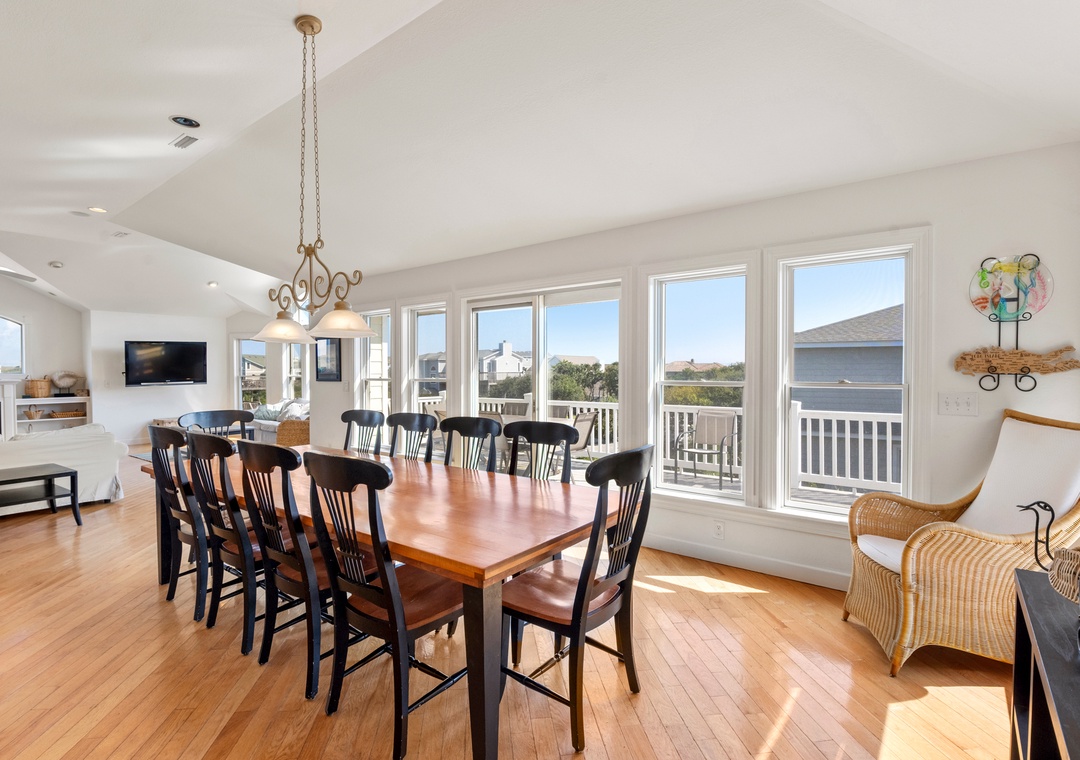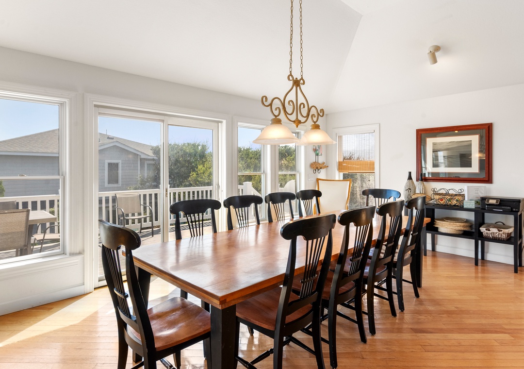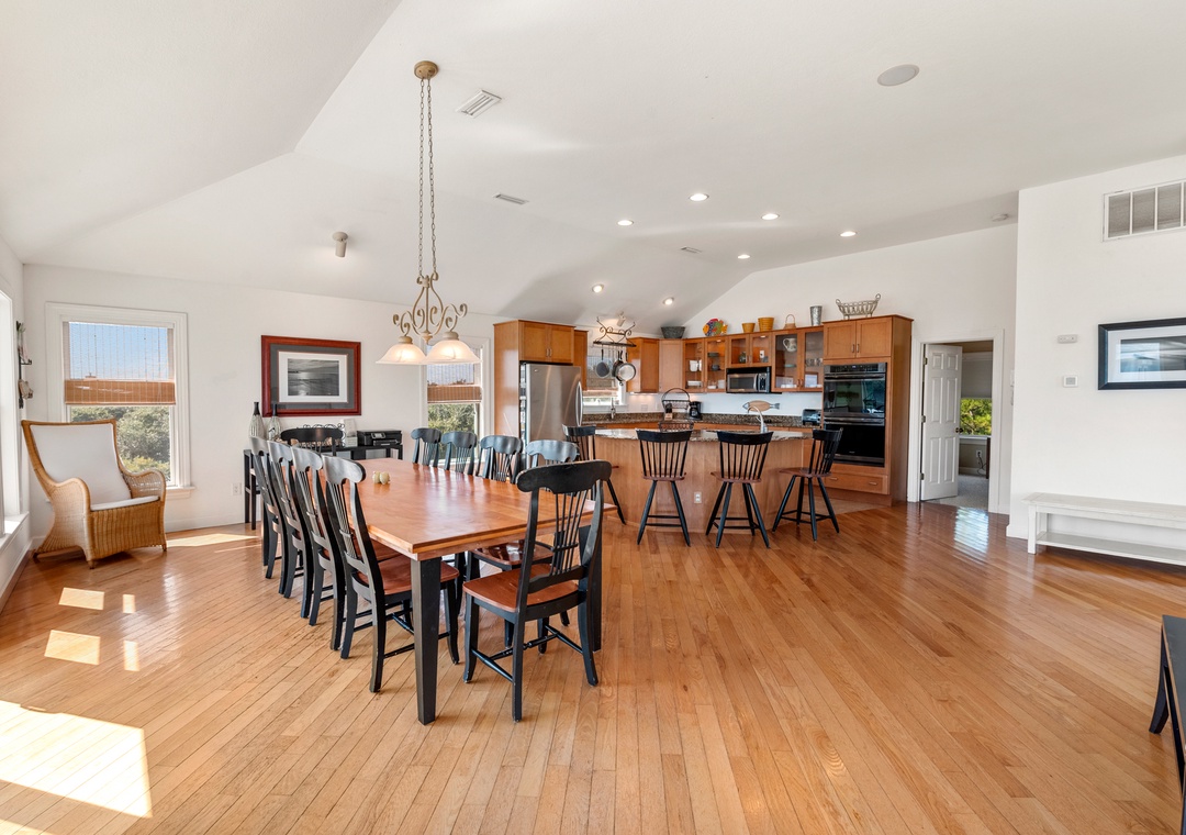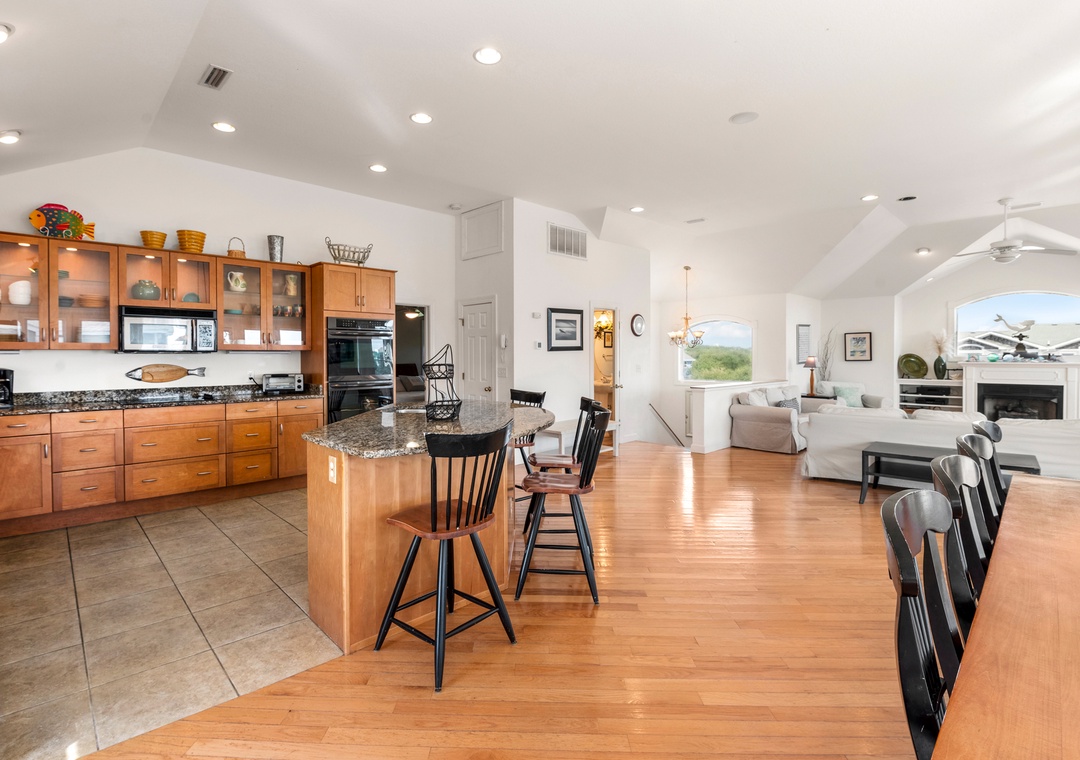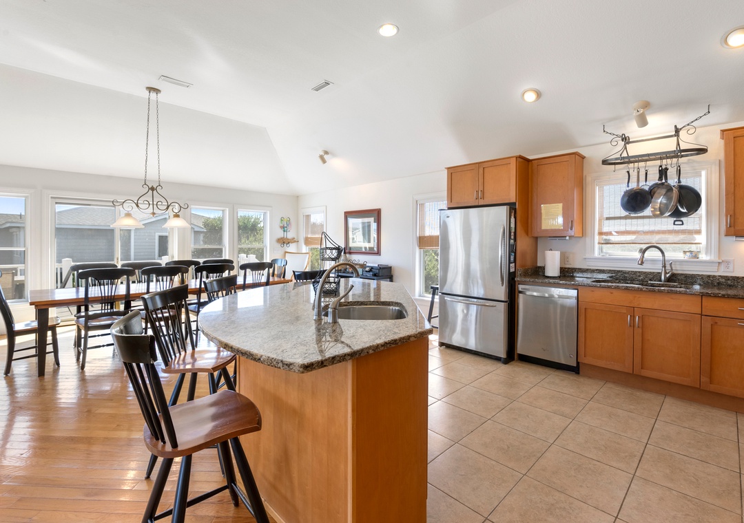 After a day at the beach, everyone can gather and socialize in the open-concept great room with vaulted ceilings and hardwood floors. The chef in your family will appreciate the updated kitchen with granite countertops and plenty of prep space. Cooking and clean-up for large groups will be a breeze with a double oven and two sinks. Serve meals at the dining table, kitchen bar, or al fresco on the sun deck while enjoying a horizon view of the ocean. A king suite is conveniently located on the top floor, just off the kitchen. Five more bedrooms make up the mid-level, three of which include ensuite baths for plenty of privacy. There's also a den/bonus room that can serve as an additional hangout space or alternative sleeping arrangements.
