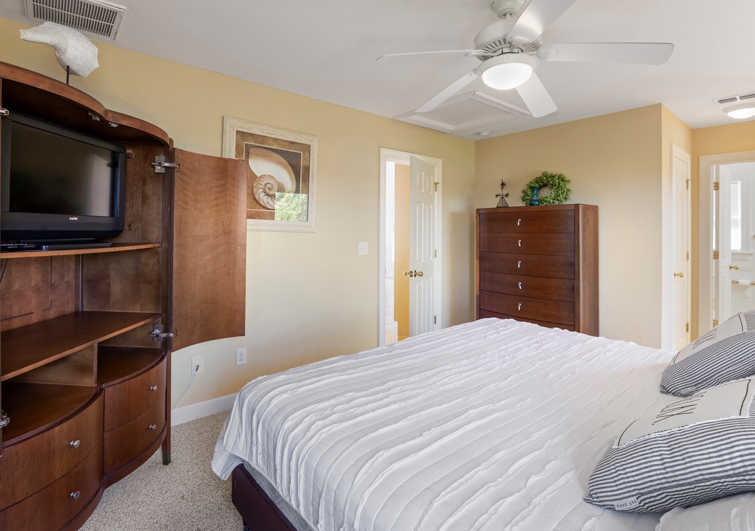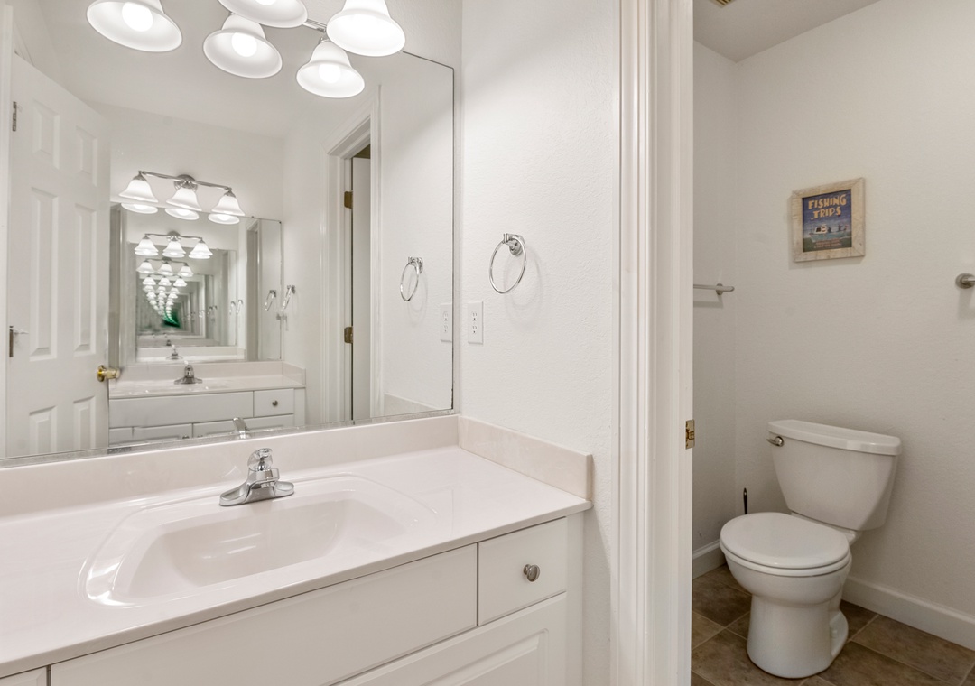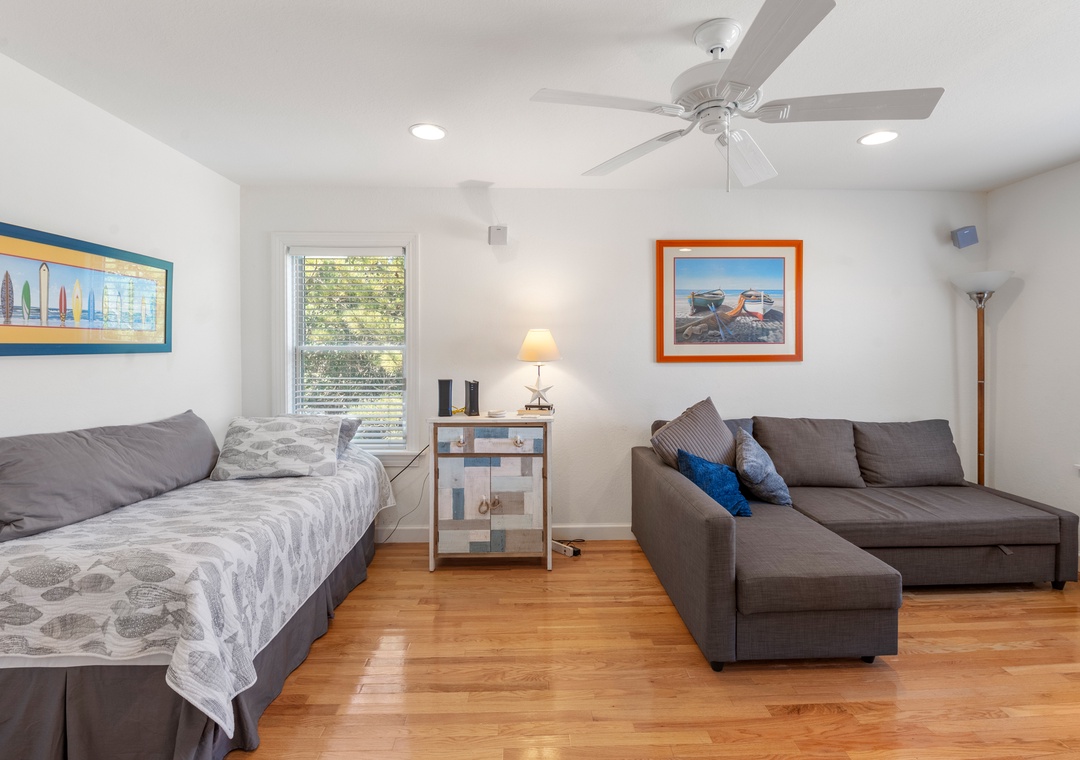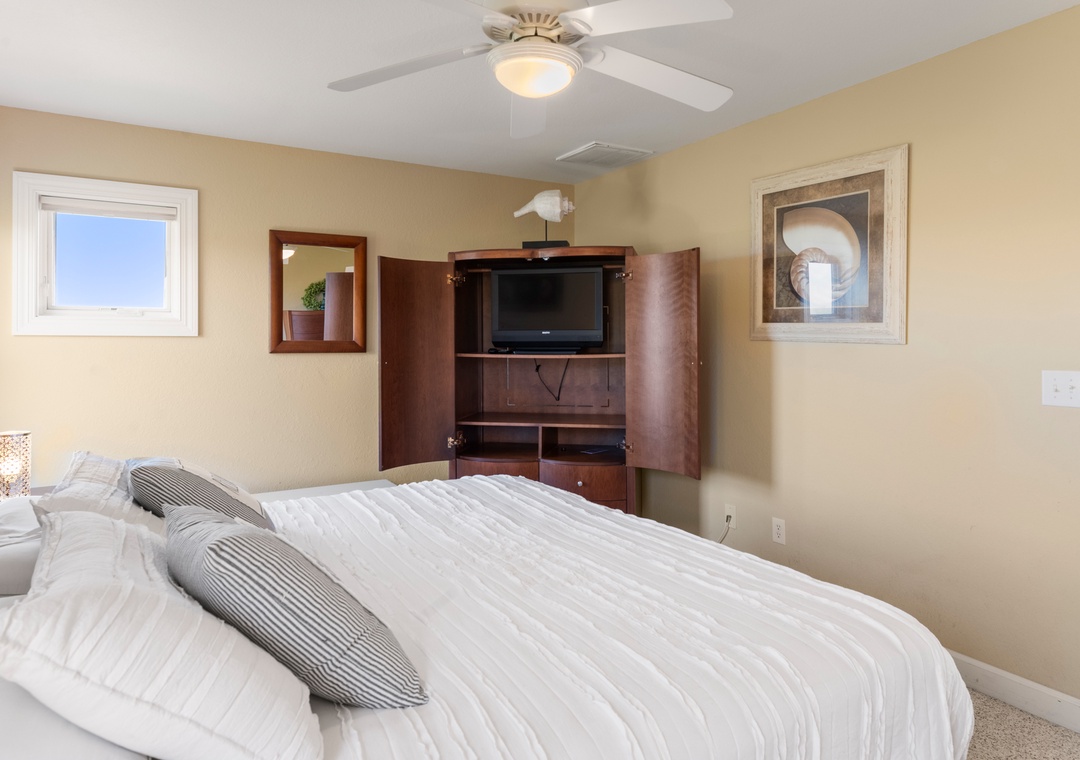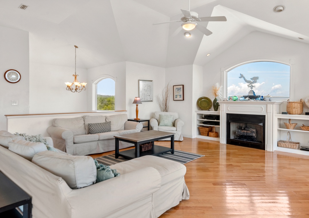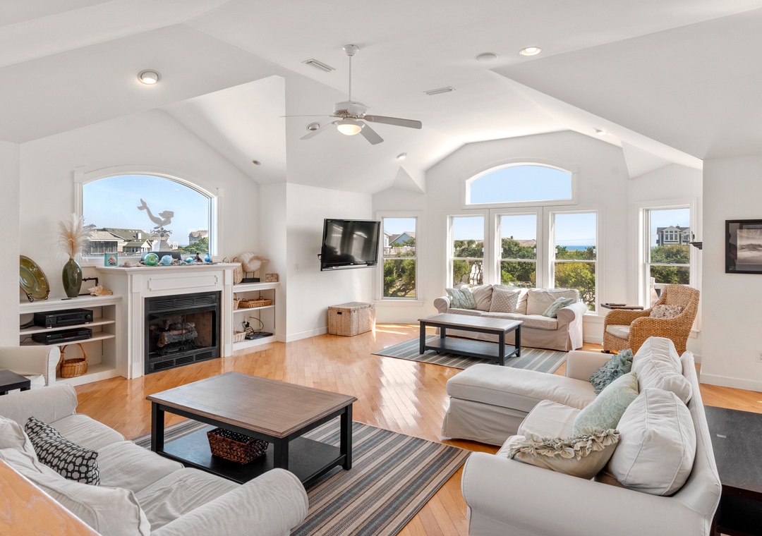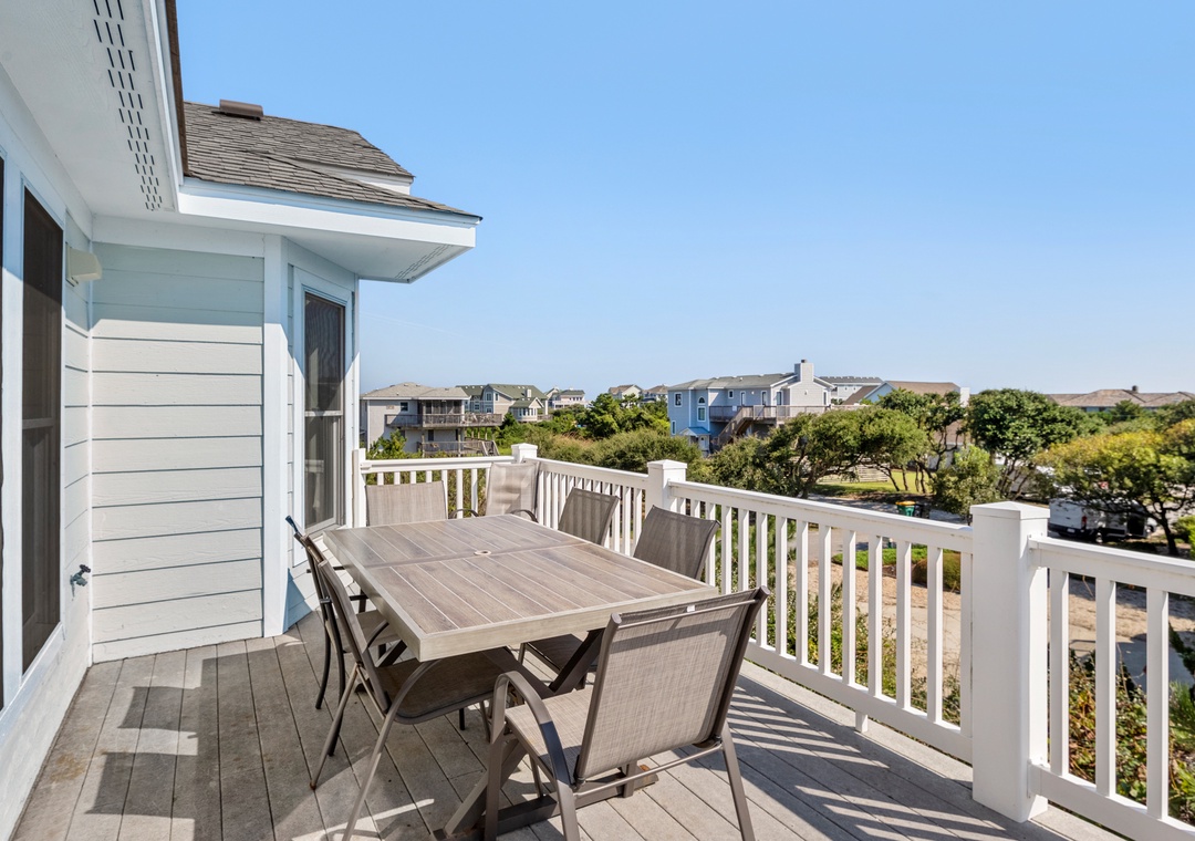 After a day at the beach, everyone can gather and socialize in the open-concept great room with vaulted ceilings and hardwood floors. The chef in your family will appreciate the updated kitchen with granite countertops and plenty of prep space. Cooking and clean-up for large groups will be a breeze with a double oven and two sinks. Serve meals at the dining table, kitchen bar, or al fresco on the sun deck while enjoying a horizon view of the ocean. A king suite is conveniently located on the top floor, just off the kitchen. Five more bedrooms make up the mid-level, three of which include ensuite baths for plenty of privacy. There's also a den/bonus room that can serve as an additional hangout space or alternative sleeping arrangements.