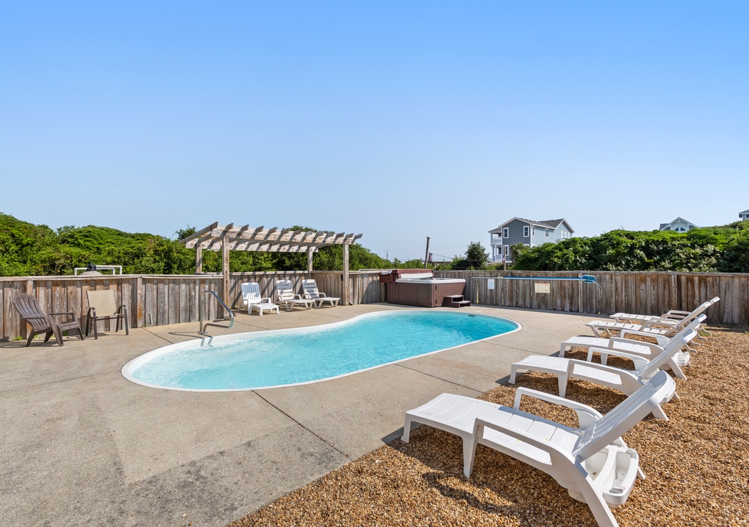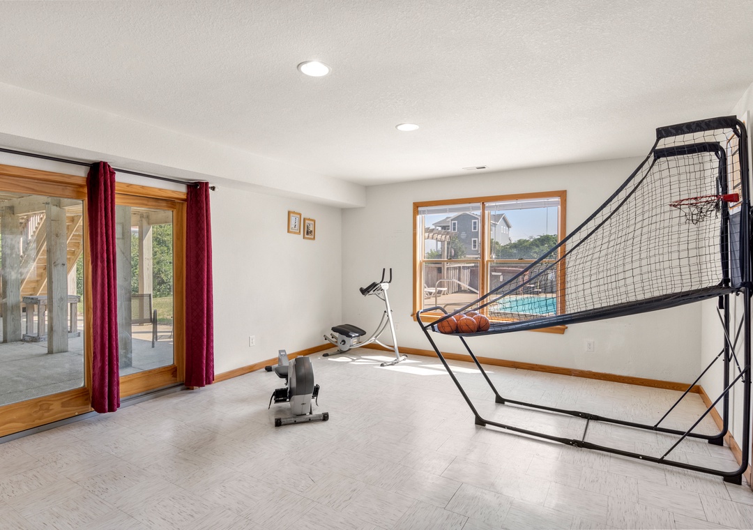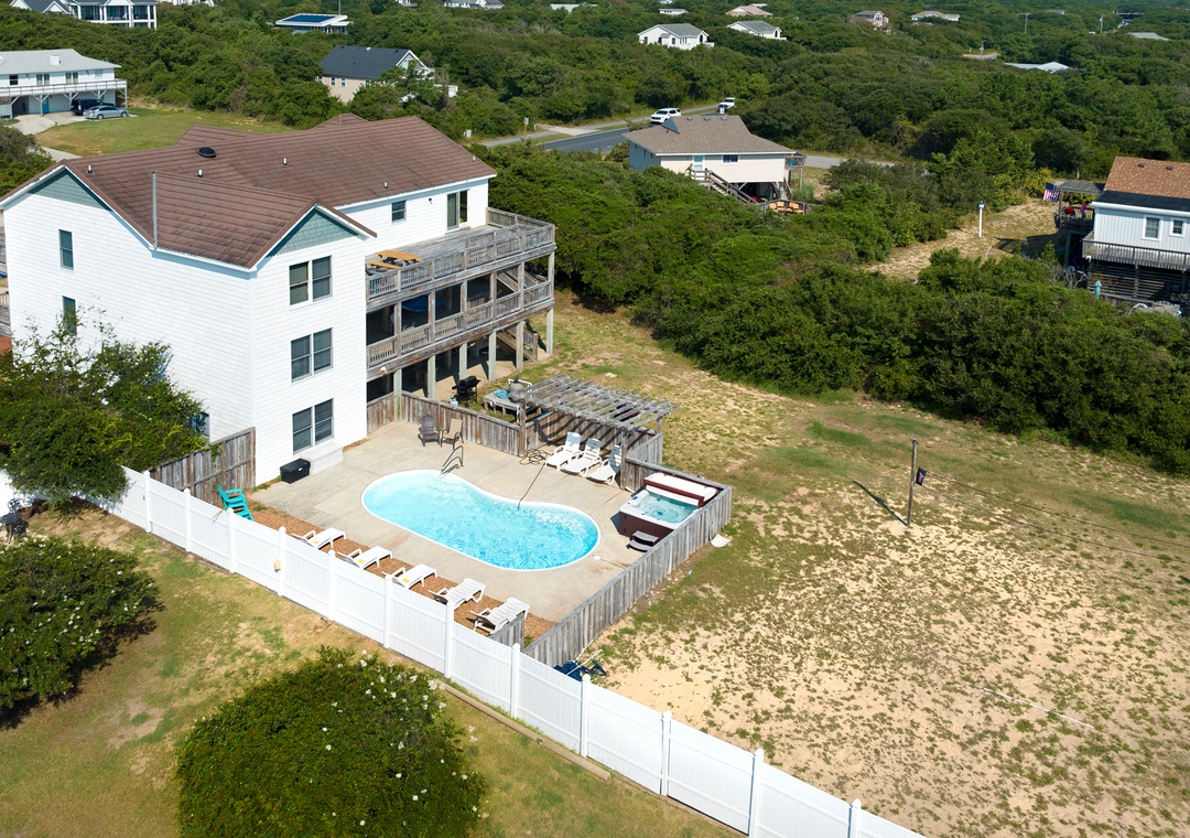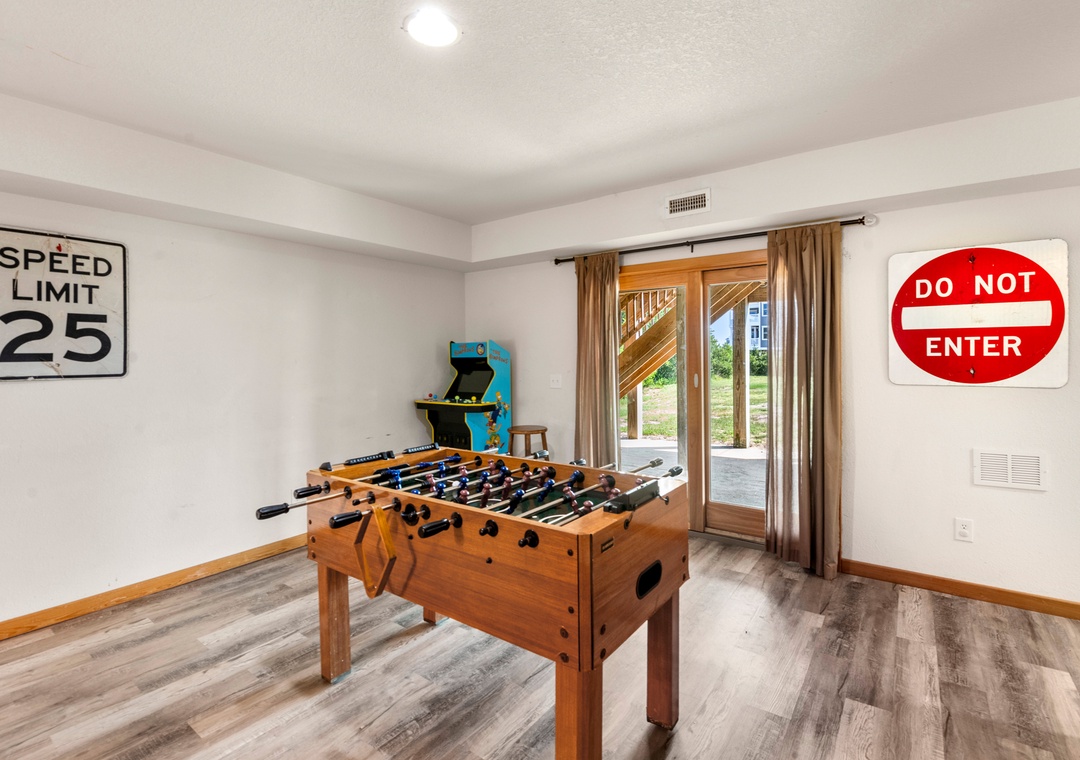 With over 6,300 square feet of indoor living space, there's room for the whole family to stay under one roof at Bohemian Breeze. Even the four-legged members of your tribe can join you at this dog-friendly retreat. The mid-level includes four additional ensuite bedrooms, all of which have deck access for effortless indoor/outdoor flow. There's also a den with diner-style booth seating and a wet bar with additional full-size fridge. Downstairs, the ground level is dedicated to fun and recreation. Host a movie night in the media room with tiered seating and a massive screen for an authentic theater experience without leaving the house. A large game room is furnished with a pool table and foosball table for hours of indoor entertainment. Keep up your fitness routine in the adjoining room with exercise equipment. Just outside, the backyard will be the hub of your family vacation. After a day at the beach, come home and splash in the 26' x 13' private pool, or challenge family and friends to a tournament on the volleyball court. If you've had enough action for one day and just need to unwind, take a relaxing soak in the bubbly hot tub.