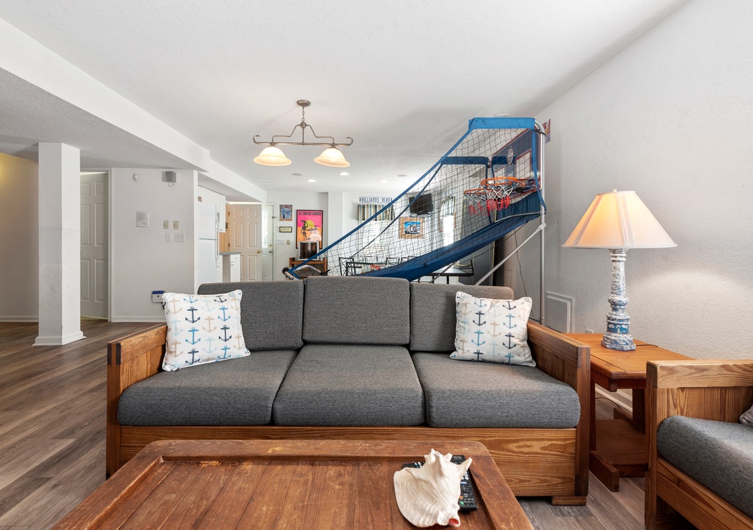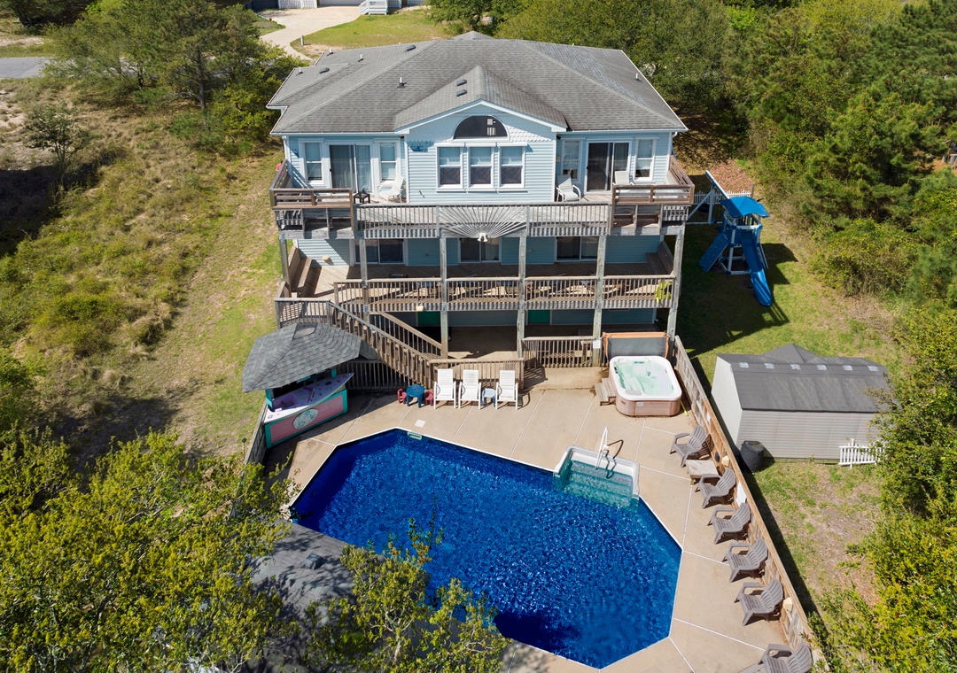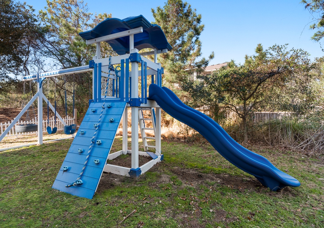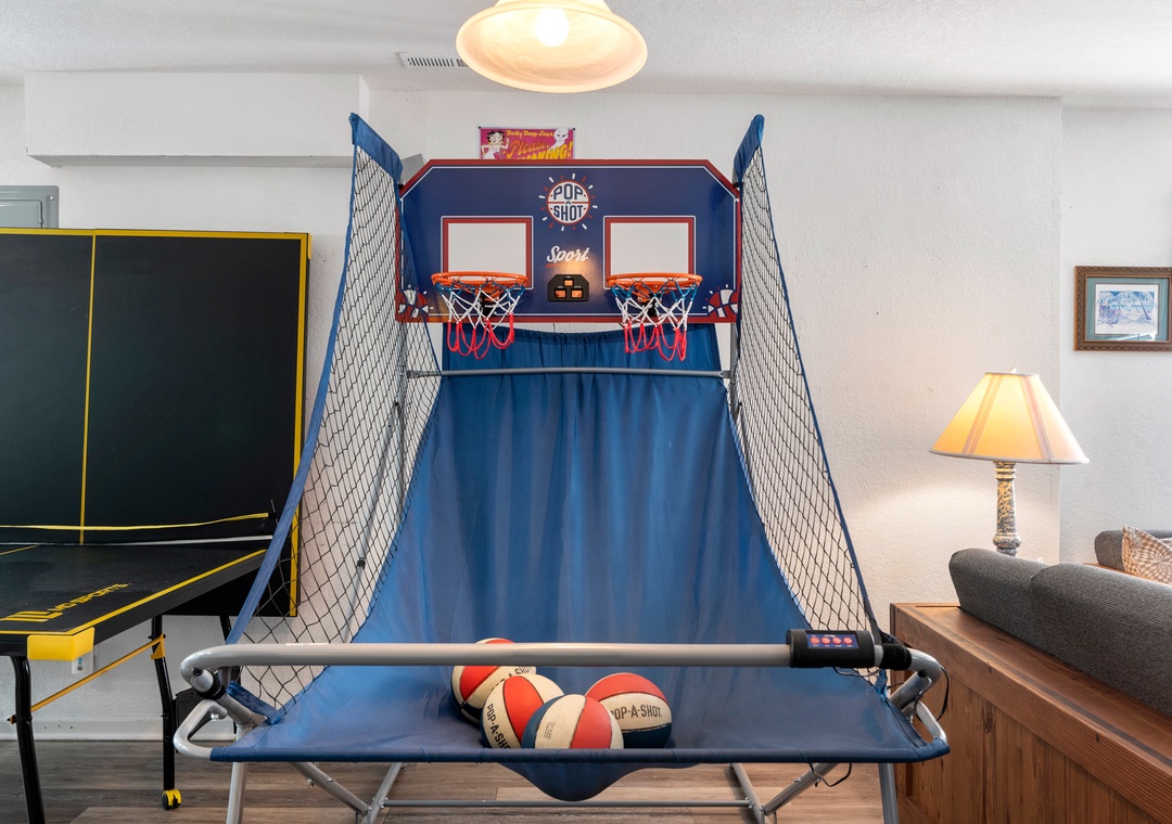 Downstairs is where the real fun happens, because families that play together stay together! Go one-on-one and flex your skills on the ping pong table or two-player arcade-style basketball game. A table with seating for six can be used for card games, board games and puzzles. Comfortable sofas and a TV allow this room to also serve as a second living area or kid's hangout space. Outside, take a dip in the private pool or a relaxing soak in the hot tub before enjoying a refreshing beverage at the tiki bar. Kids will love having their own outdoor play space with swings and a slide, right in the backyard.
