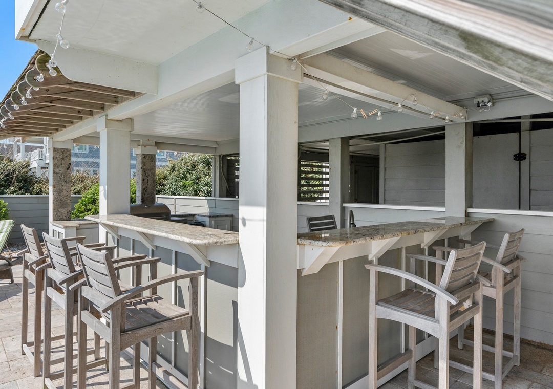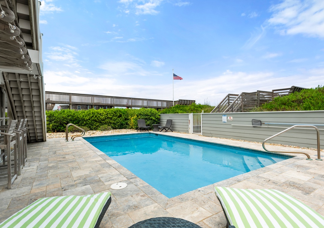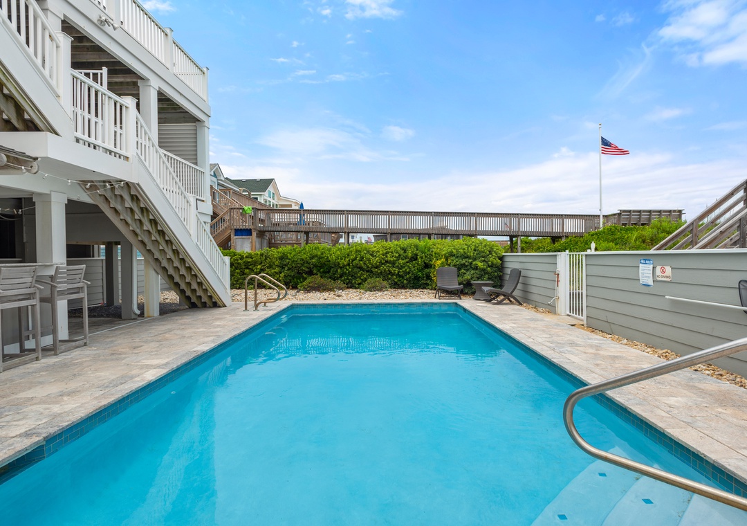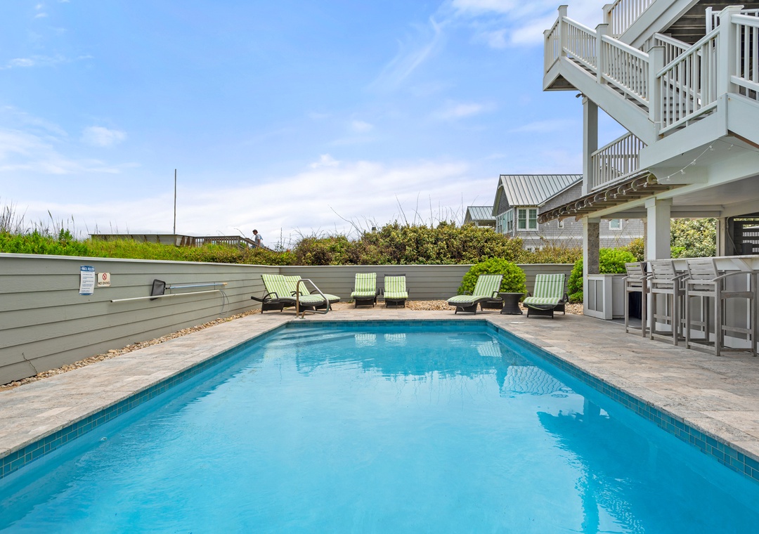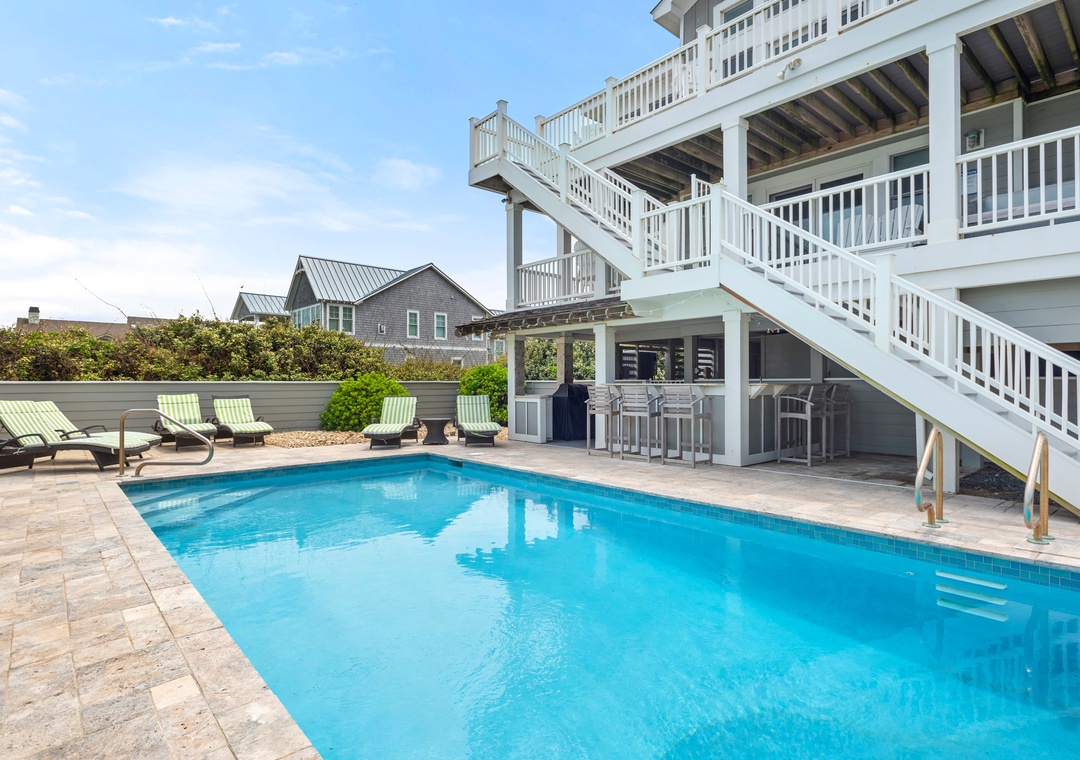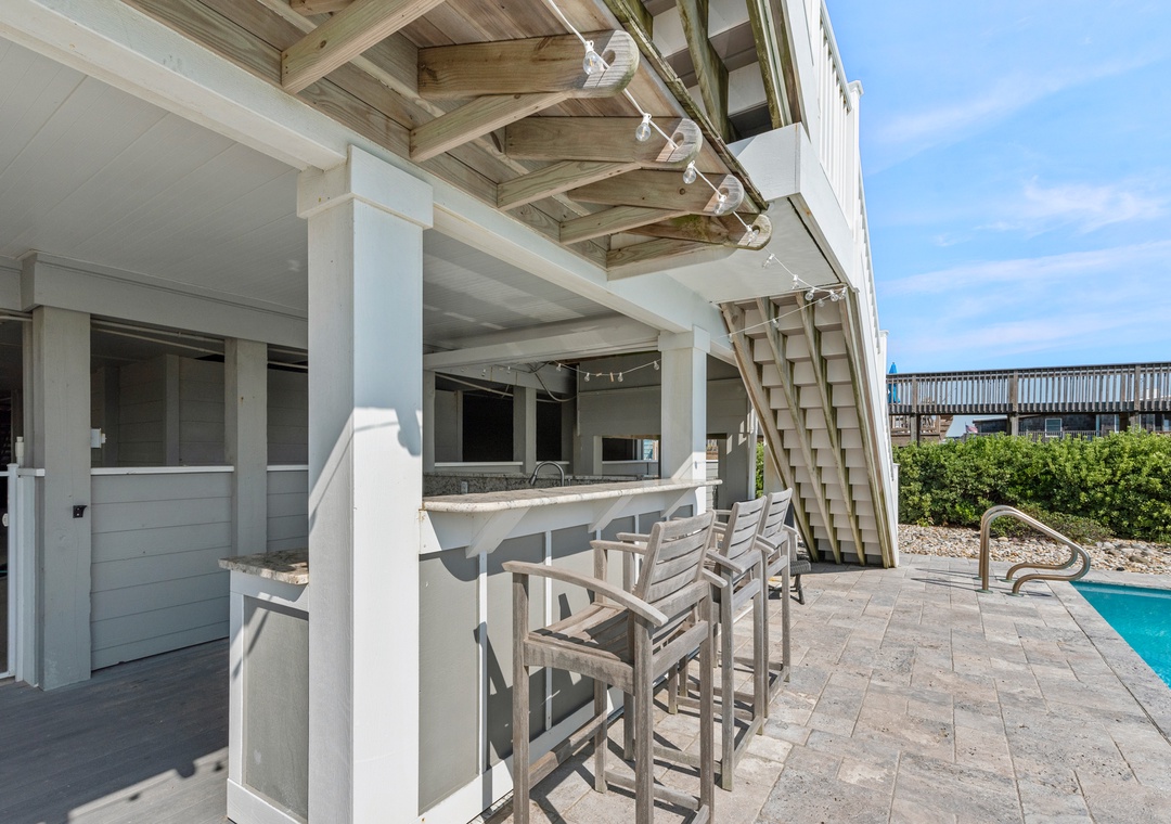 Downstairs by the pool will be the hub of your family vacation, providing everything you need for outdoor fun and relaxation. The tiki bar is equipped with an icemaker for cold drinks and a grill for cooking the catch of the day. The saltwater pool can be heated certain times of the year, ideal for Spring and Fall getaways. An outdoor half bath on the ground level provides convenient access from the pool or beach.