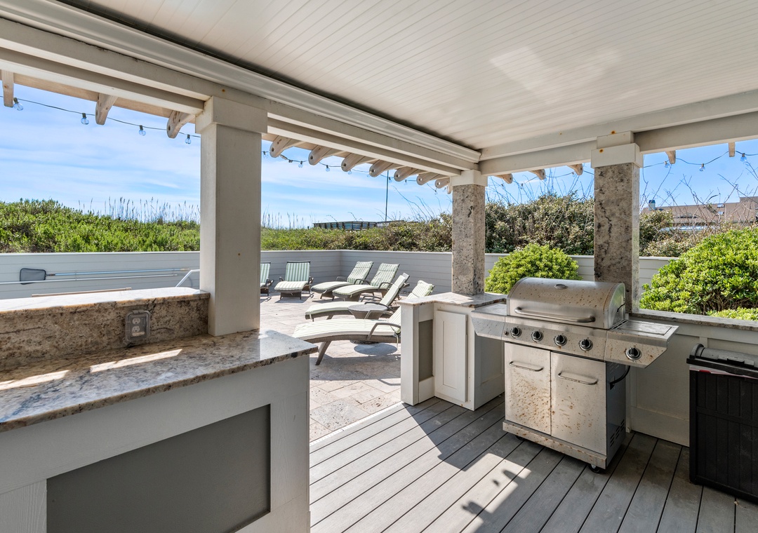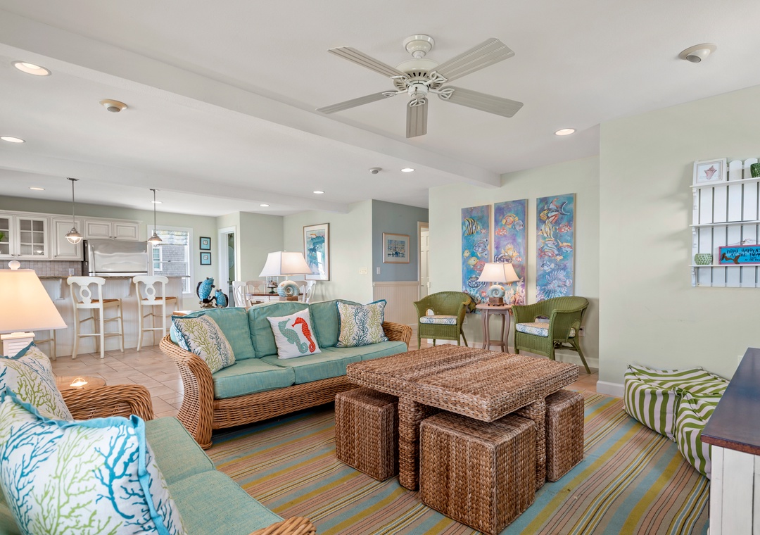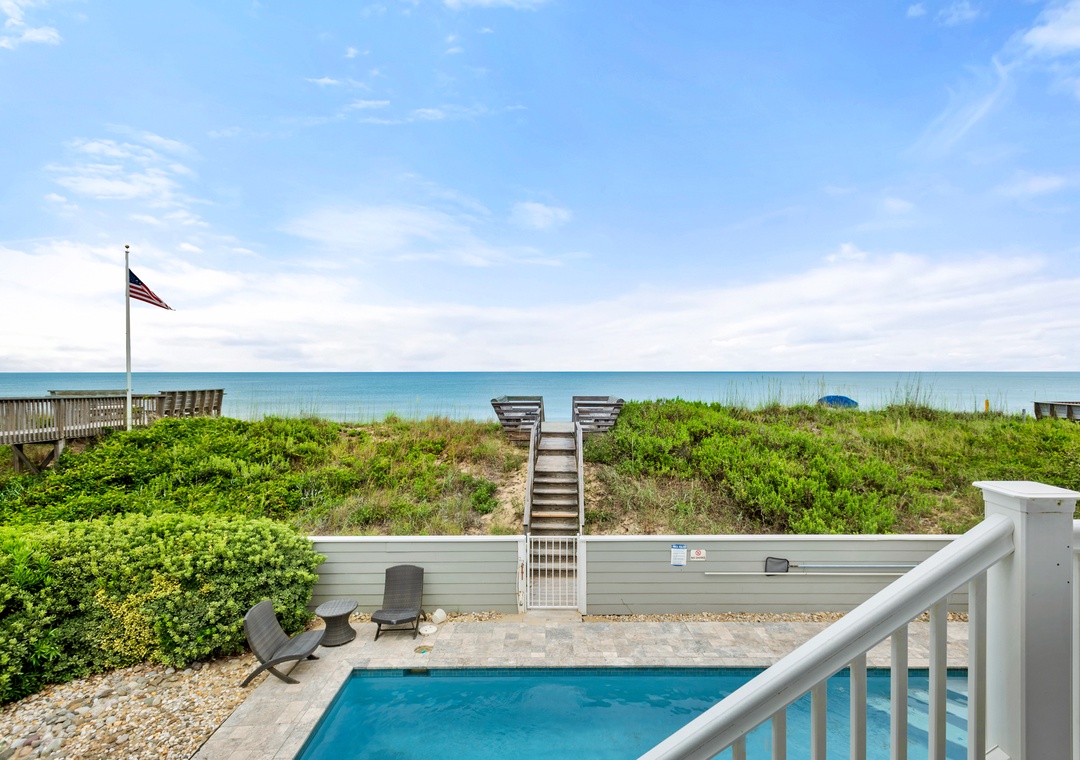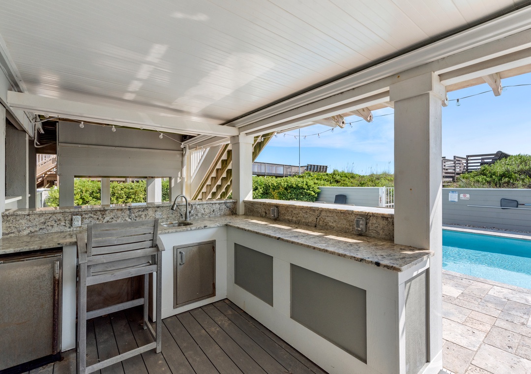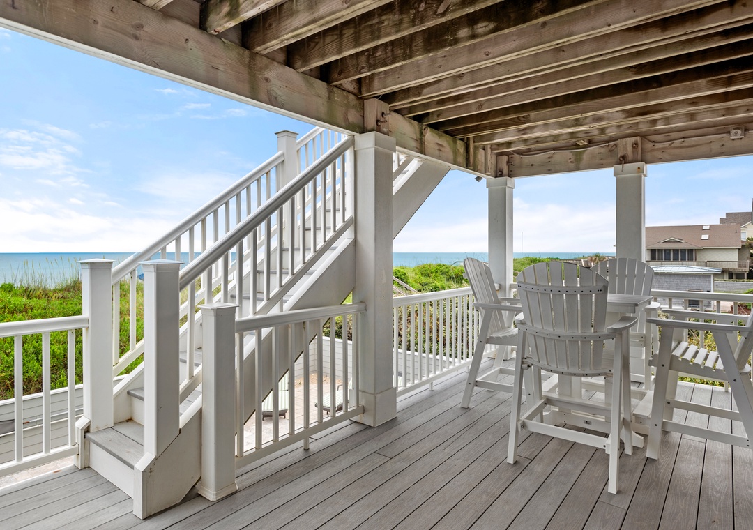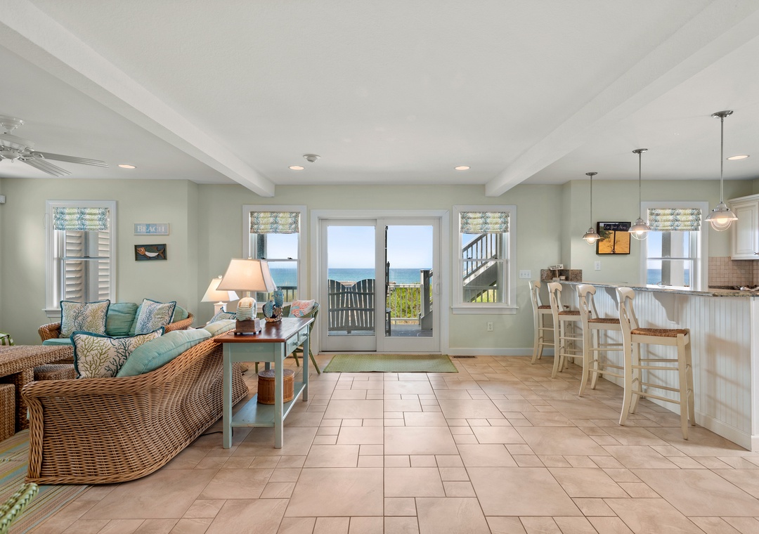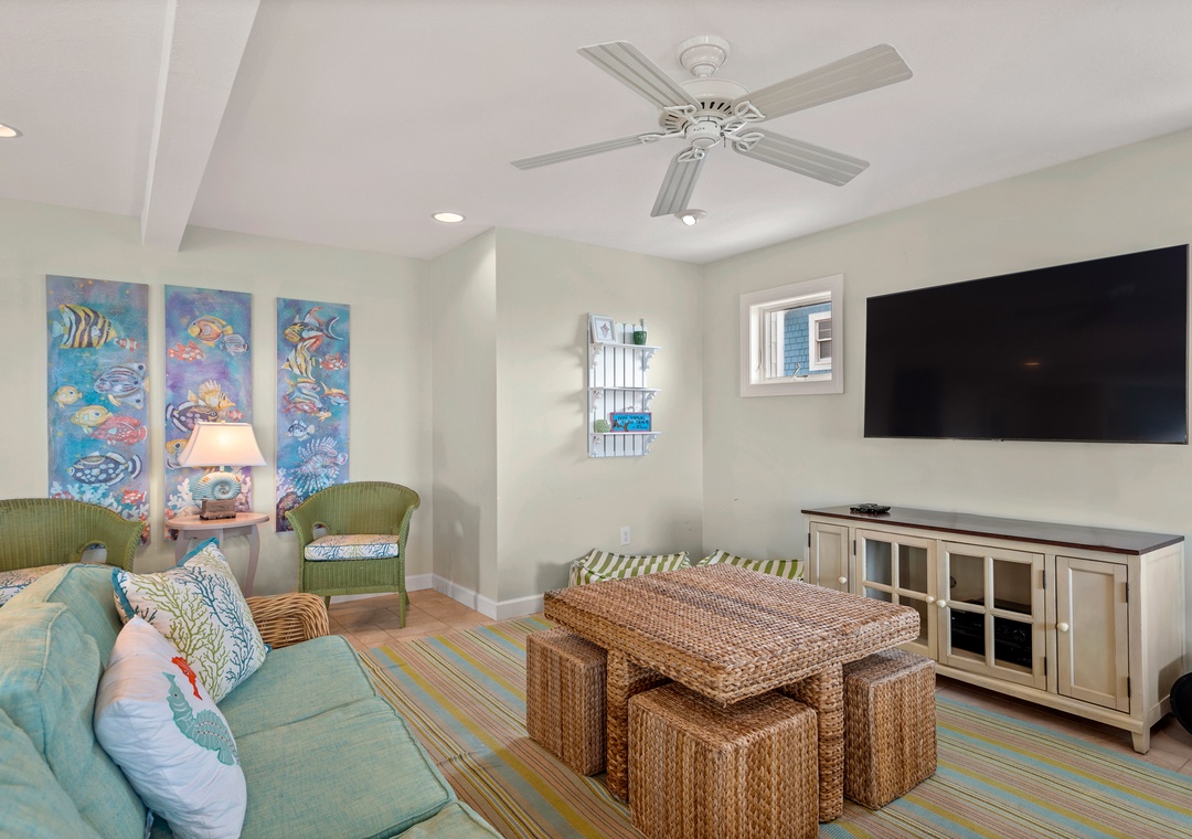 Downstairs by the pool will be the hub of your family vacation, providing everything you need for outdoor fun and relaxation. The tiki bar is equipped with an icemaker for cold drinks and a grill for cooking the catch of the day. The saltwater pool can be heated certain times of the year, ideal for Spring and Fall getaways. An outdoor half bath on the ground level provides convenient access from the pool or beach.
