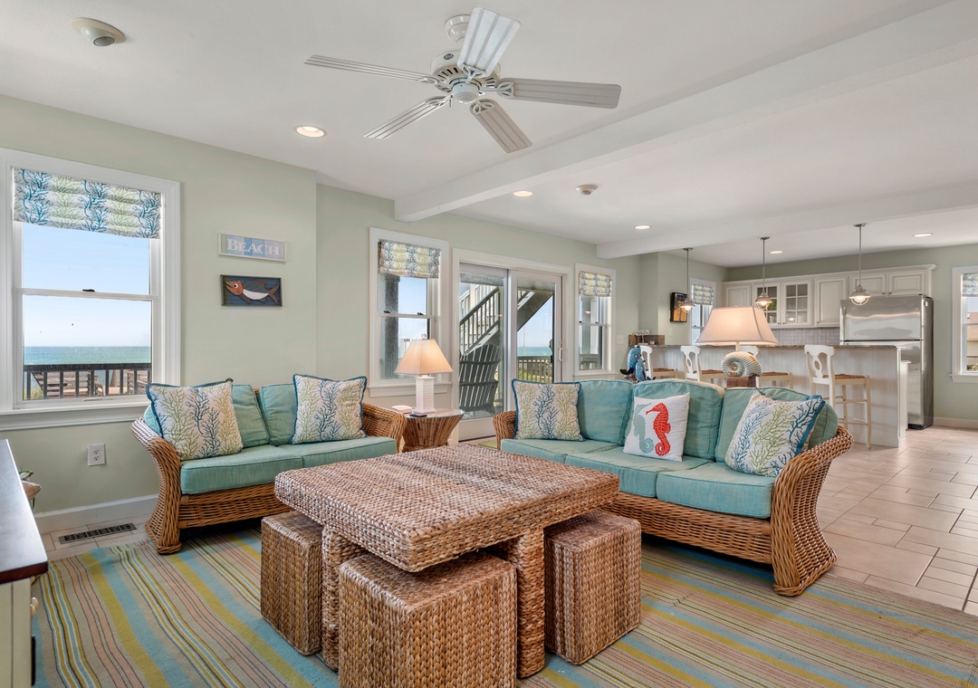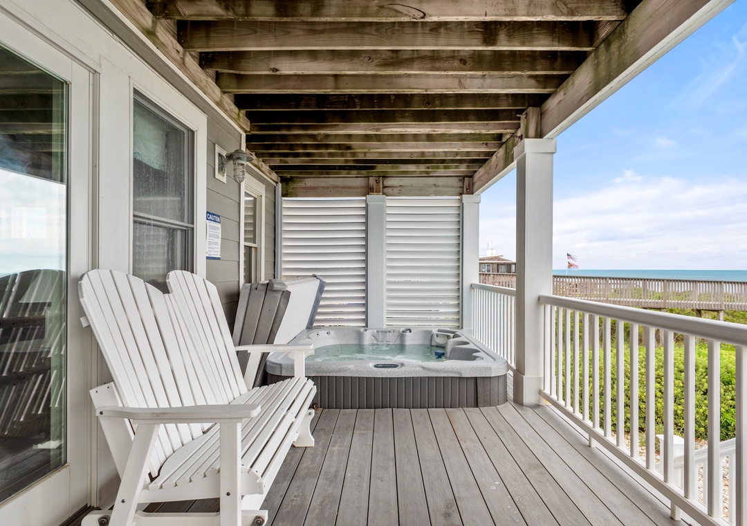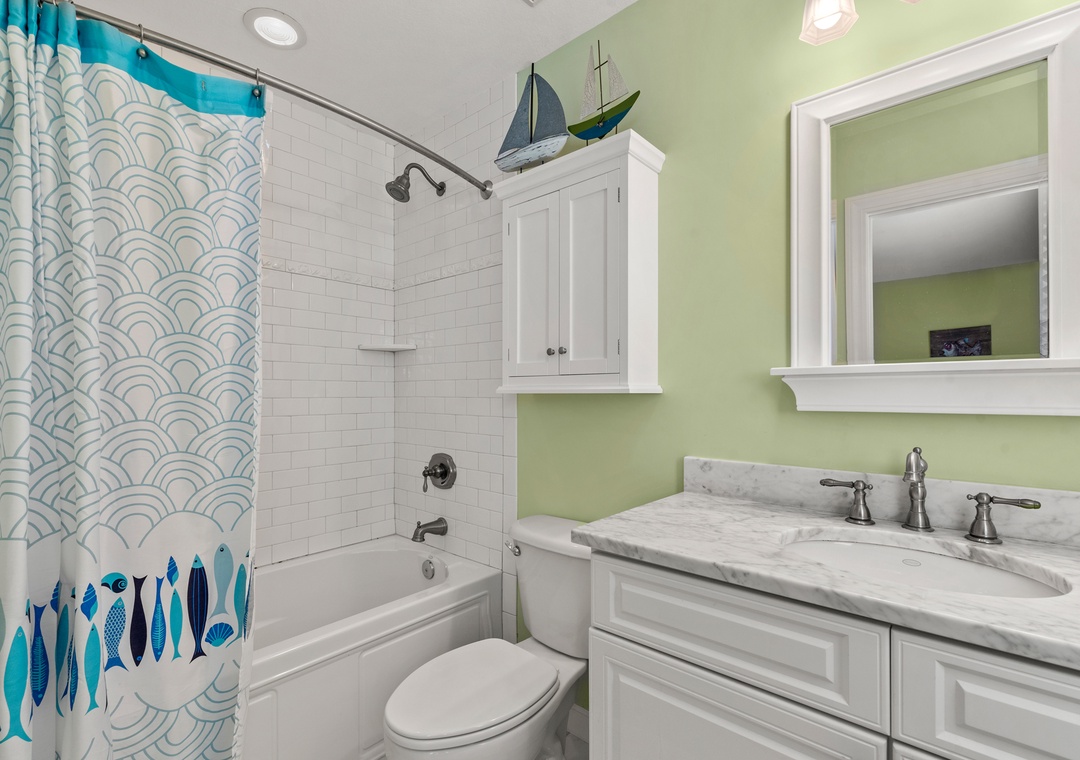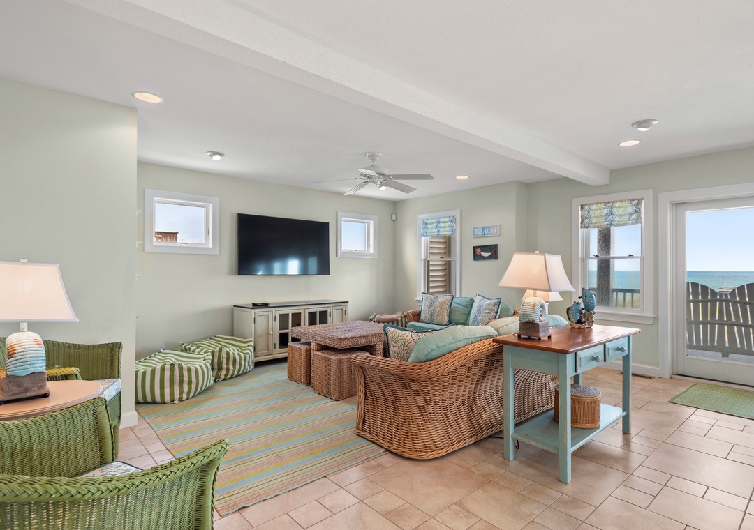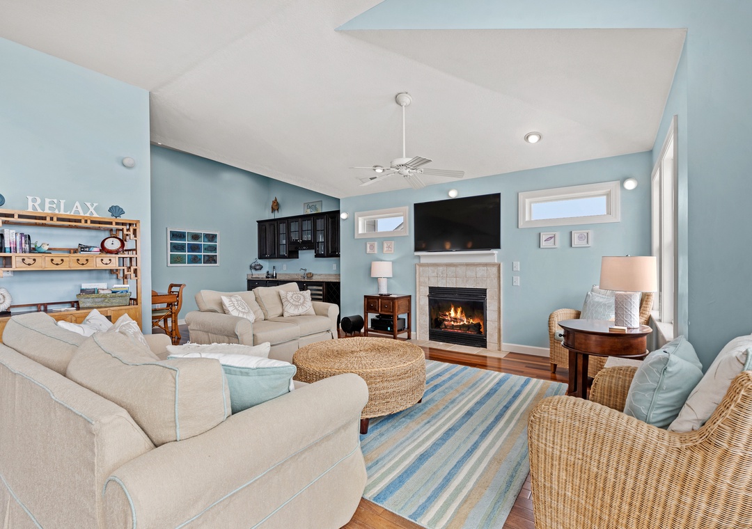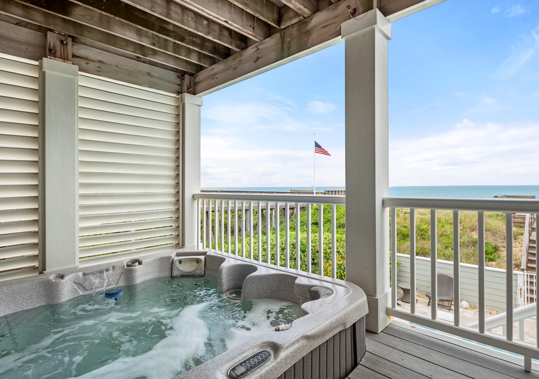 Downstairs by the pool will be the hub of your family vacation, providing everything you need for outdoor fun and relaxation. The tiki bar is equipped with an icemaker for cold drinks and a grill for cooking the catch of the day. The saltwater pool can be heated certain times of the year, ideal for Spring and Fall getaways. An outdoor half bath on the ground level provides convenient access from the pool or beach.