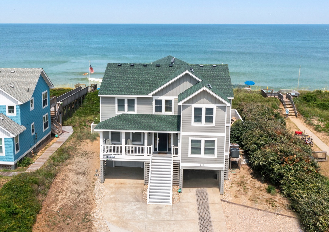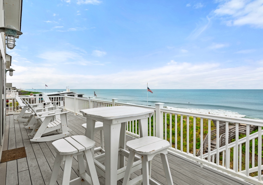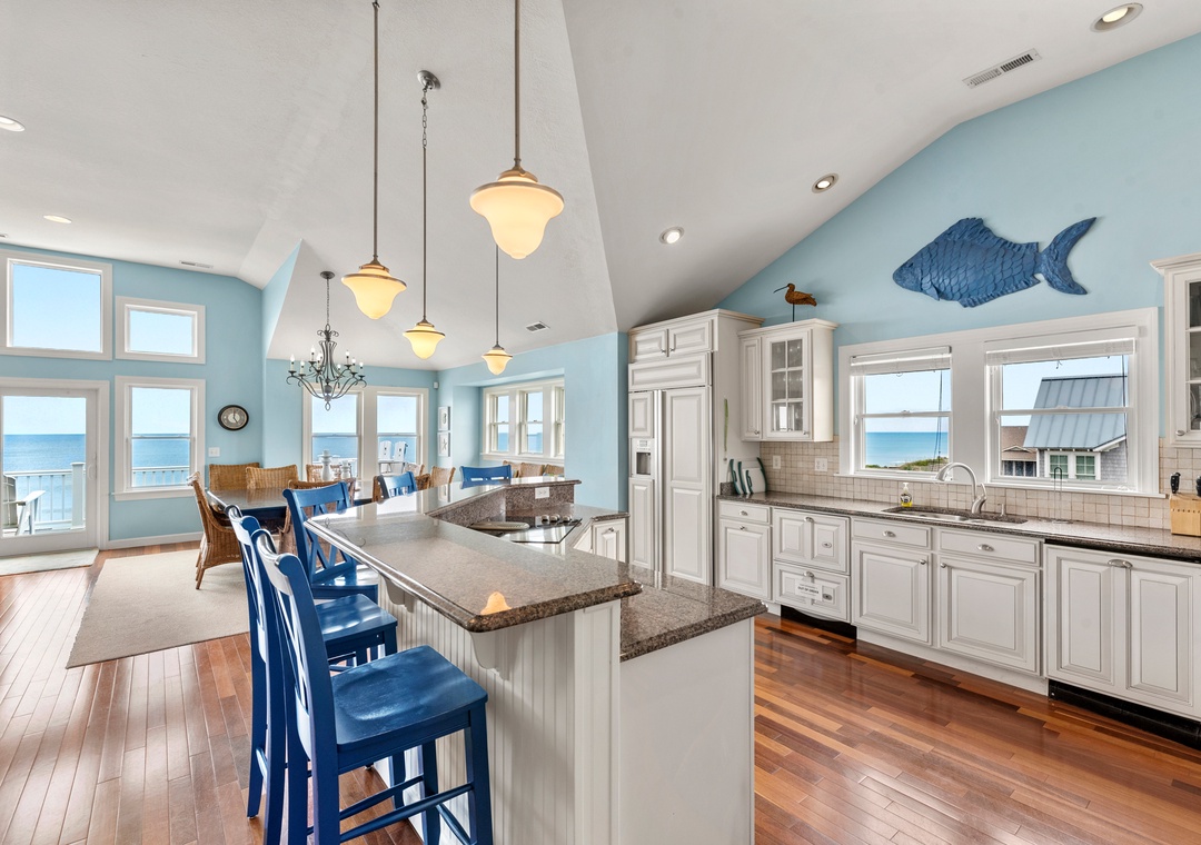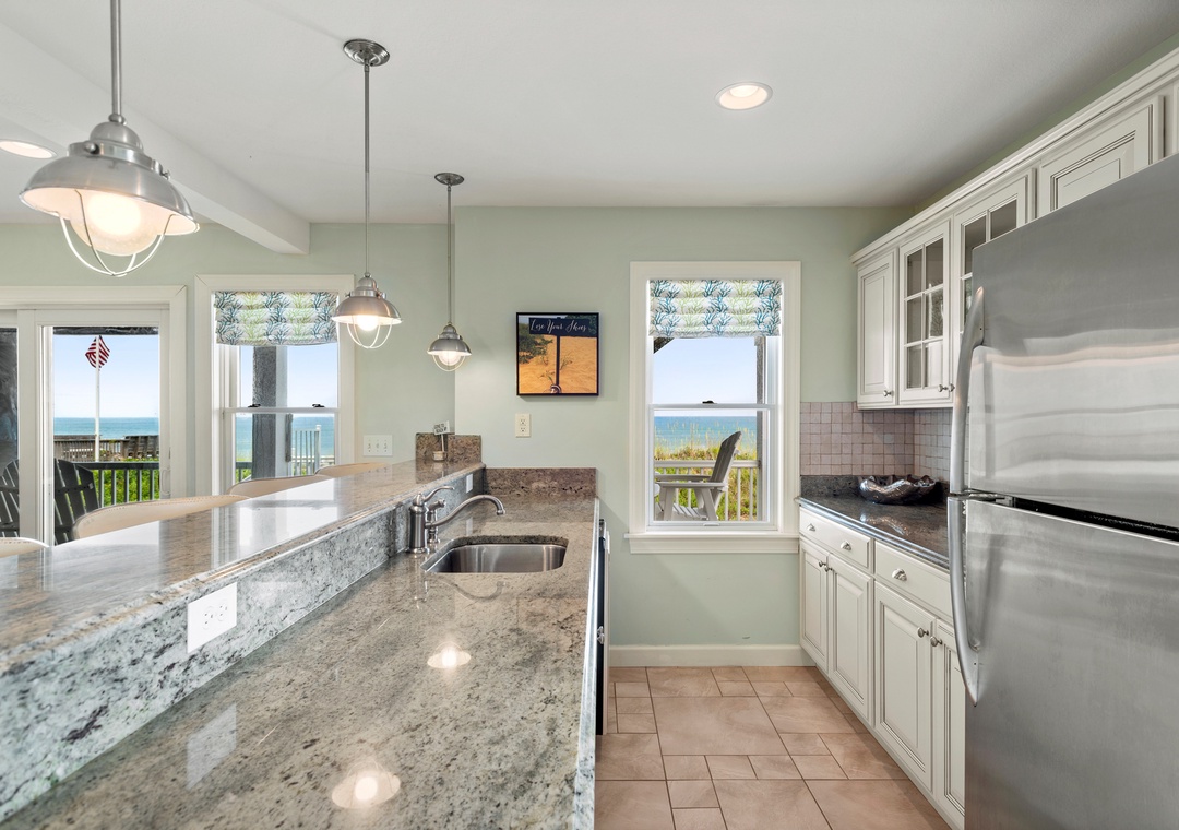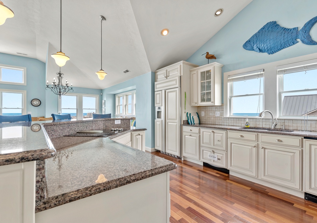 When you arrive, getting settled will be a breeze using the ground floor dry entry with elevator to send luggage and groceries to the upper levels. A reverse floor plan with vaulted ceilings and oversized windows in the open-concept great room take full advantage of the panoramic ocean views. Entertain family and friends in the living area, which features a gas fireplace, surround sound speaker system, and a generously sized wet bar with wine cooler. An expansive oceanfront deck serves as an extenion of the great room for effortless indoor/outdoor living. It's the perfect spot to watch the sunrise with your morning coffee, or simply take in the salt air and ocean breezes. The chef in your group will appreciate the fully stocked kitchen that boasts granite countertops, custom cabinetry and stainless steel appliances including a sub-zero refrigerator and double oven. It overlooks the great room, so guests can still socialize and enjoy the ocean view while preparing meals. Luxurious yet practical hardwood flooring flows throughout the top level, including the two bedrooms. The primary suite features a spa-like private bath with marble countertops, custom tiled shower and large jetted tub.
