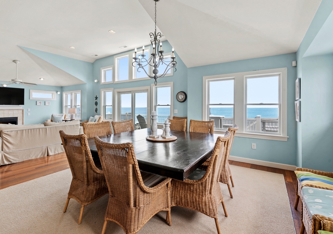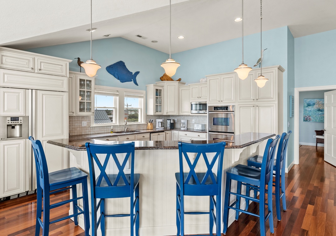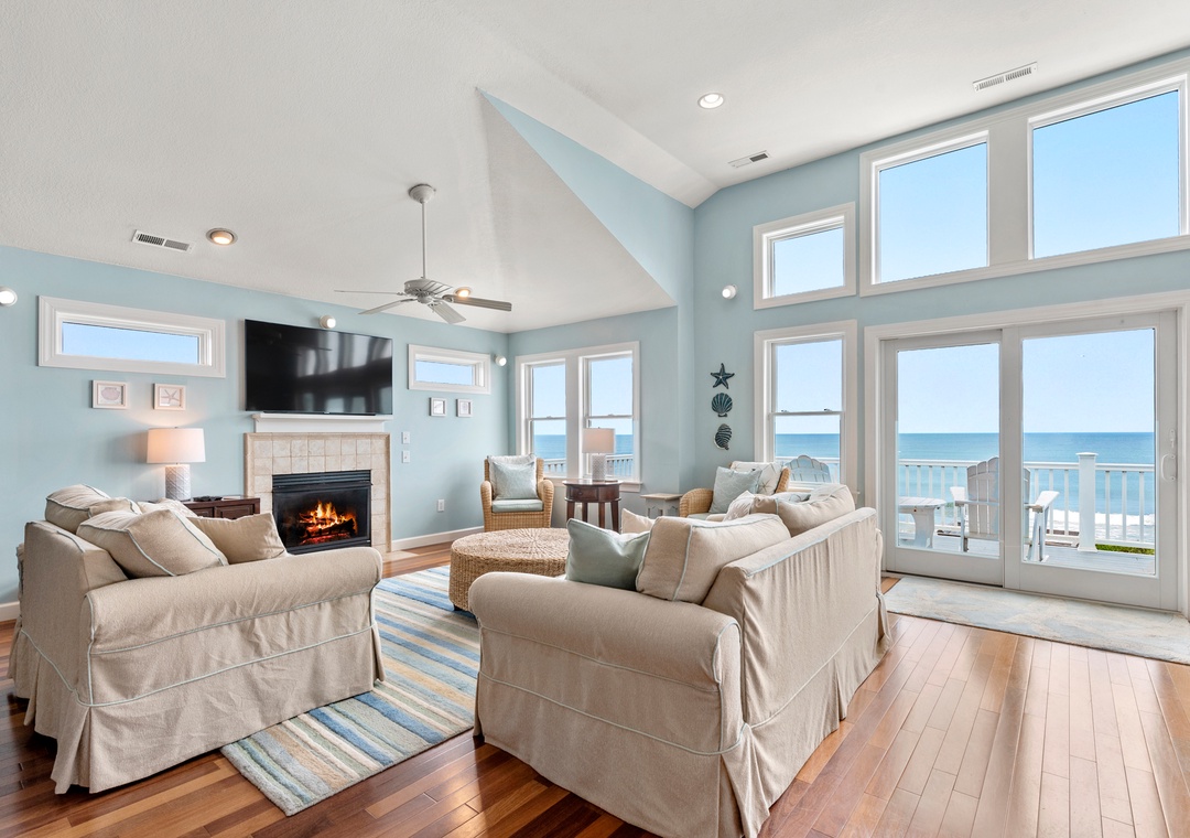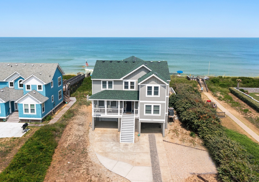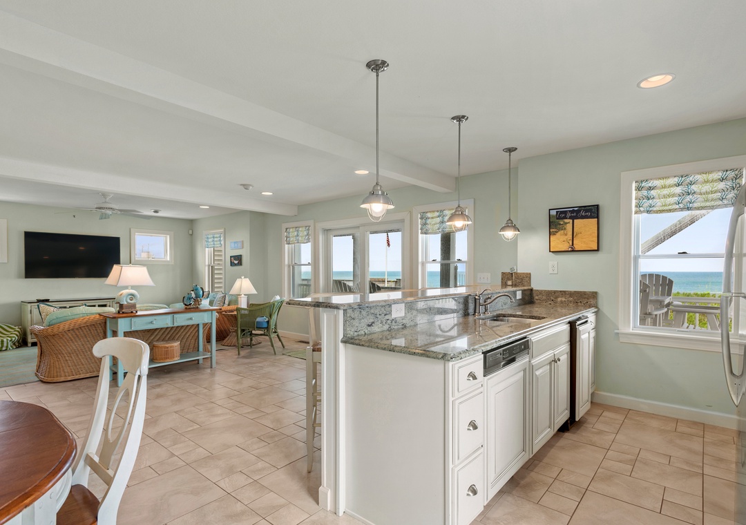 When you arrive, getting settled will be a breeze using the ground floor dry entry with elevator to send luggage and groceries to the upper levels. A reverse floor plan with vaulted ceilings and oversized windows in the open-concept great room take full advantage of the panoramic ocean views. Entertain family and friends in the living area, which features a gas fireplace, surround sound speaker system, and a generously sized wet bar with wine cooler. An expansive oceanfront deck serves as an extenion of the great room for effortless indoor/outdoor living. It's the perfect spot to watch the sunrise with your morning coffee, or simply take in the salt air and ocean breezes. The chef in your group will appreciate the fully stocked kitchen that boasts granite countertops, custom cabinetry and stainless steel appliances including a sub-zero refrigerator and double oven. It overlooks the great room, so guests can still socialize and enjoy the ocean view while preparing meals. Luxurious yet practical hardwood flooring flows throughout the top level, including the two bedrooms. The primary suite features a spa-like private bath with marble countertops, custom tiled shower and large jetted tub.