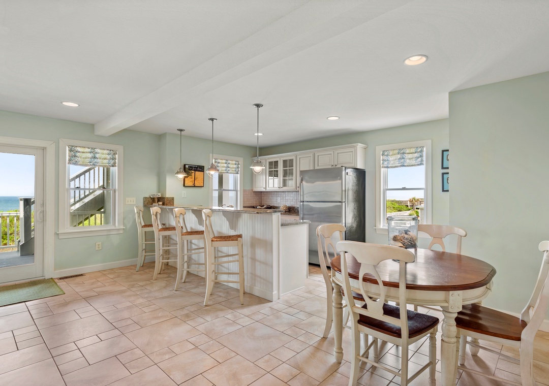 The mid-level includes four additional ensuite bedrooms and a spacious game room, which can serve as a second living room or kid's hang-out area. This bonus space offers plenty of comfortable seating and a kitchenette with additional dining table. Play a round or two of foosball or watch movies on the large TV with home theater system. Equipped with a full-size refrigerator, icemaker, dishwasher and bar seating, the kitchenette is perfect for serving drinks or grabbing a snack without having to go upstairs. The game room provides direct access to the covered deck, which overlooks the pool area below and features a sunken hot tub where you can soak away the day while still enjoying an ocean view.