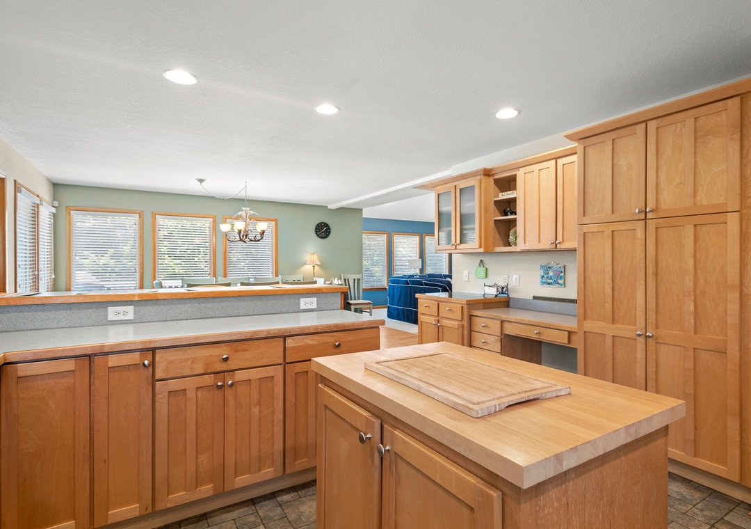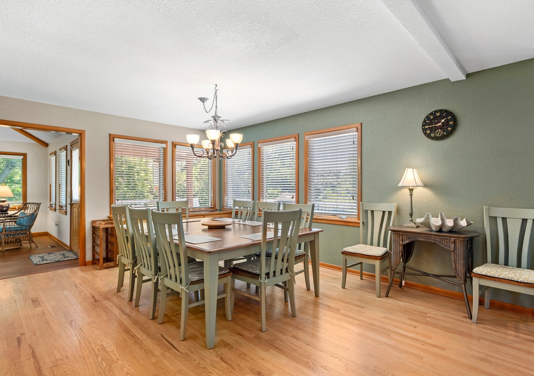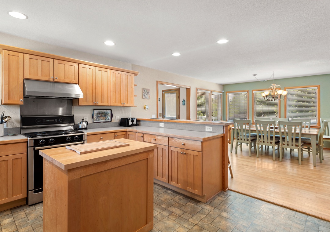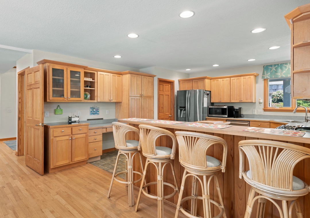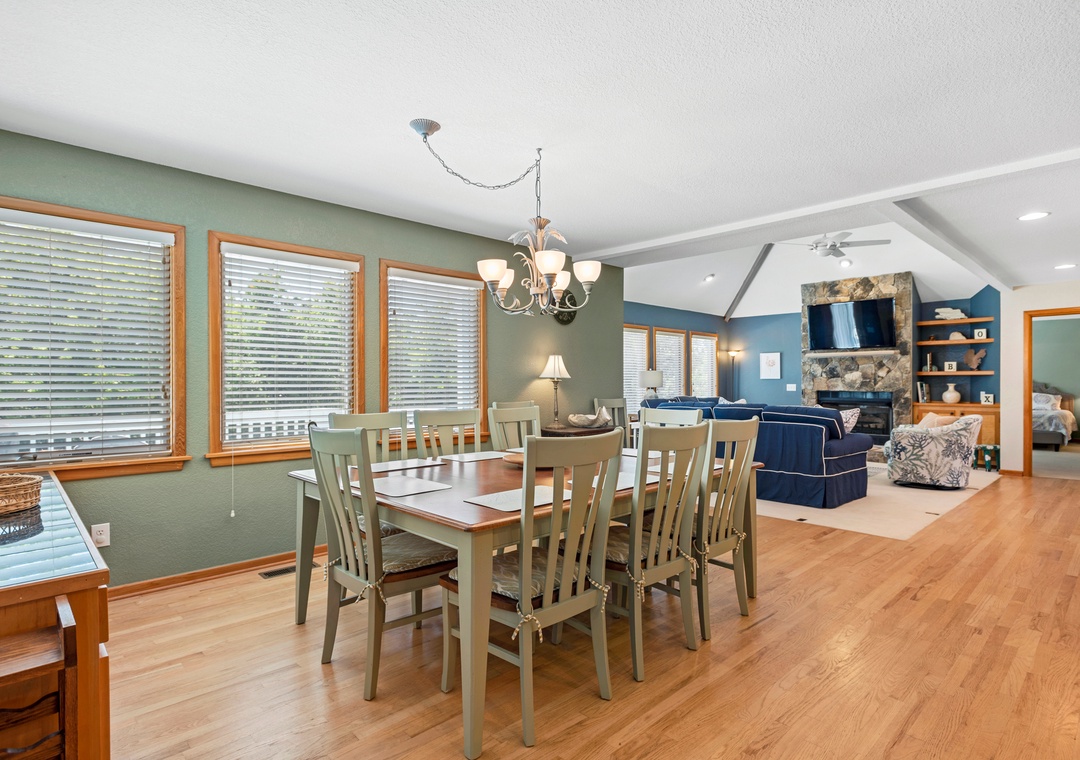 The spacious main living area boasts vaulted ceilings and a wall of southern facing windows for an abundance of natural light. Hardwood floors flow into the dining room, with convenient access to an outdoor dining area on the back deck. The kitchen overlooks the dining room and provides additional seating at the bar. You'll have more than enough room to prepare meals in the kitchen with a center island and plenty of counter space. It also features stainless steel appliances, including a gas range, and a built-in desk for catching up with work or school remotely. The primary bedroom is the only bedroom on the main level and provides deck access, a private sitting area and an ensuite bath with jetted tub and separate shower. Two more bedrooms and a full bath are located on the top floor, including a king bedroom with views of the sound. A den off the dining room serves as an additional living area. The fourth bedroom, additional full bath and media room are located on the ground level with access to the pool area.