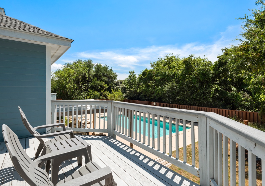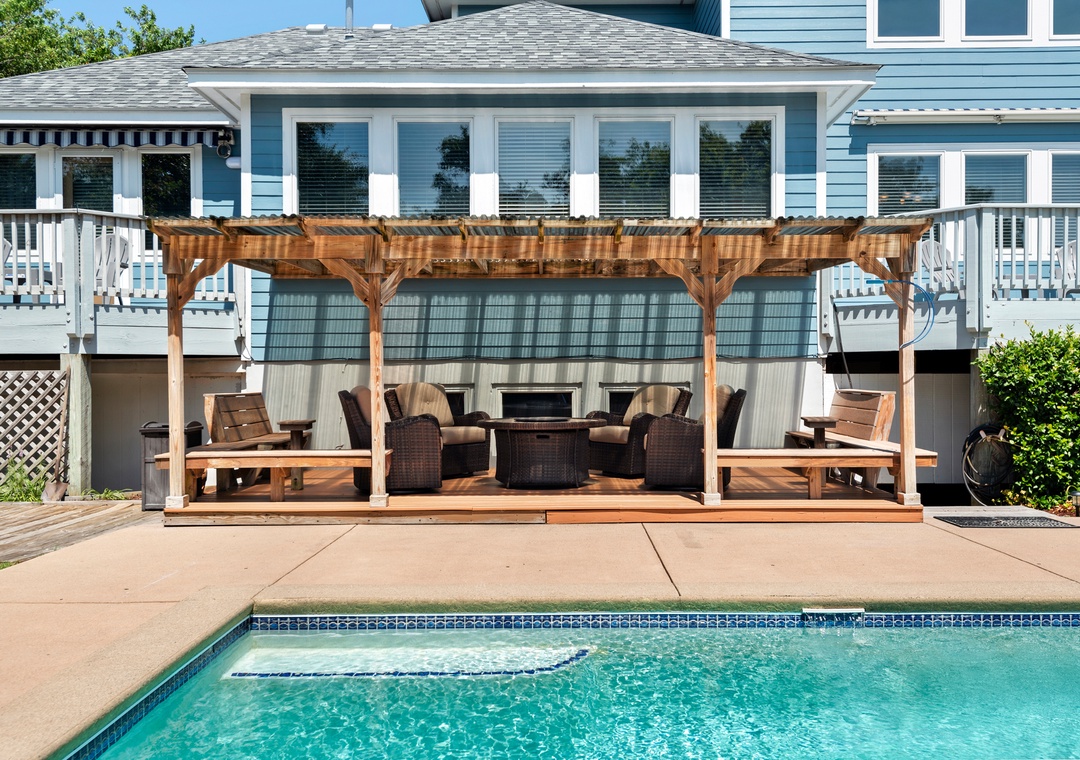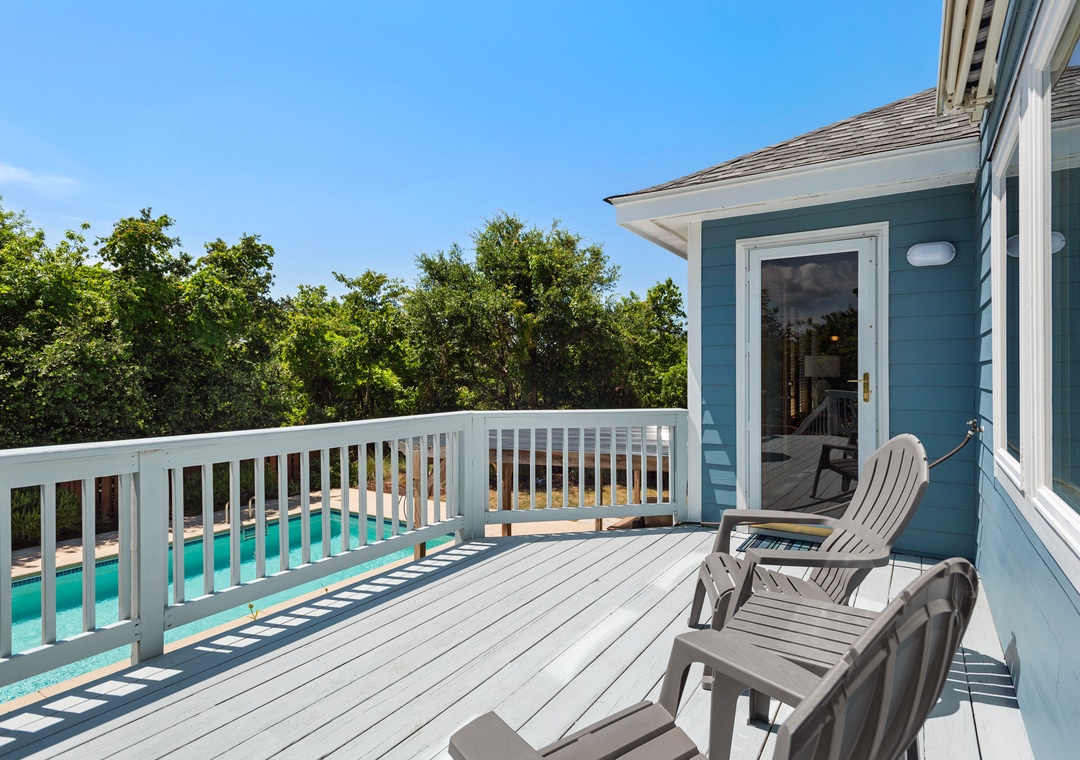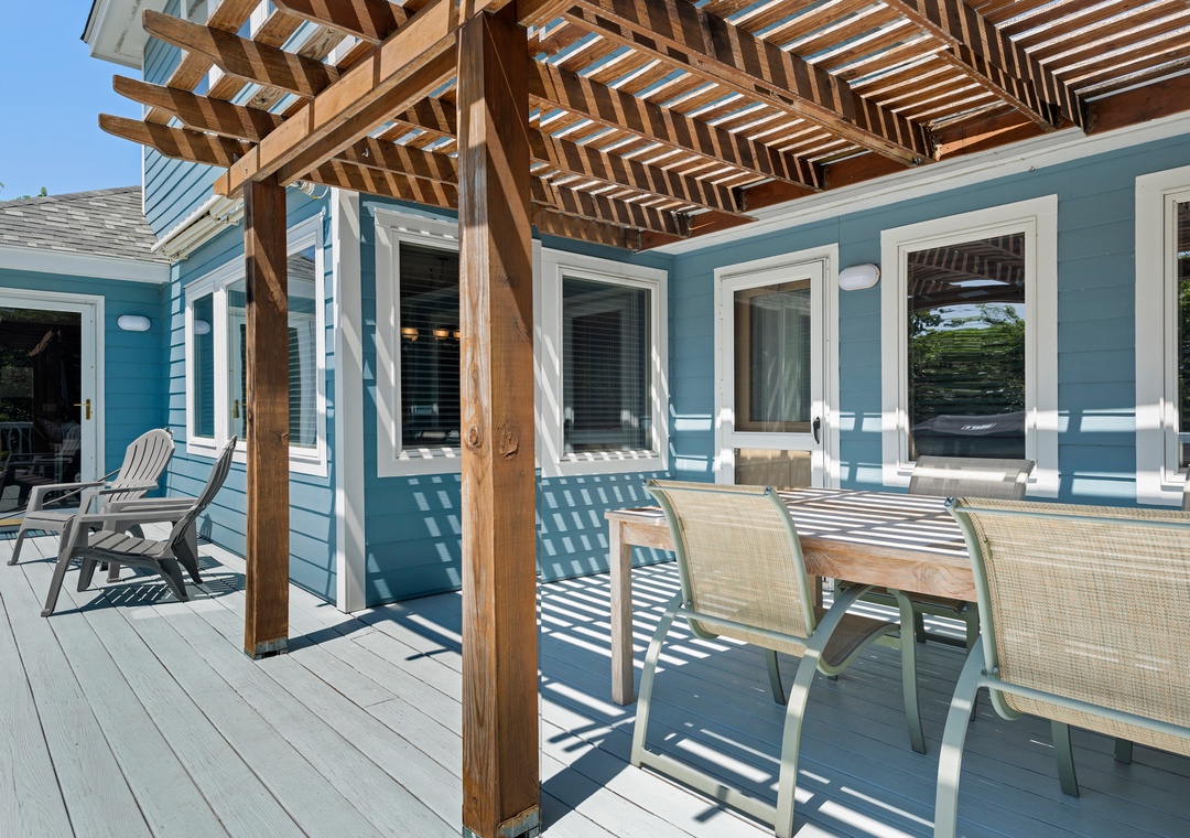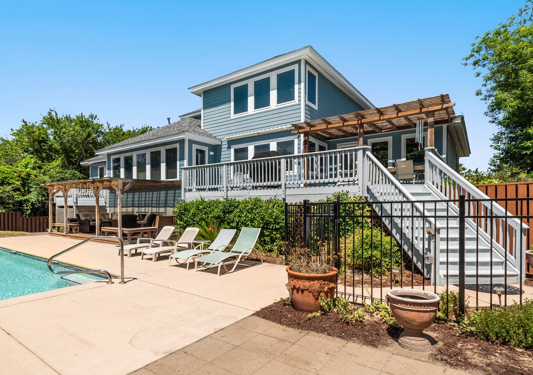 Blue Oasis is a custom-built soundside home situated on a corner lot in the elevated dunes of the sought-after North Dune Loop neighborhood. This charming southern retreat features generously sized rooms, quality finishes and plenty of outdoor living space, including a covered front porch and an expansive sun deck overlooking an enclosed backyard with private pool.