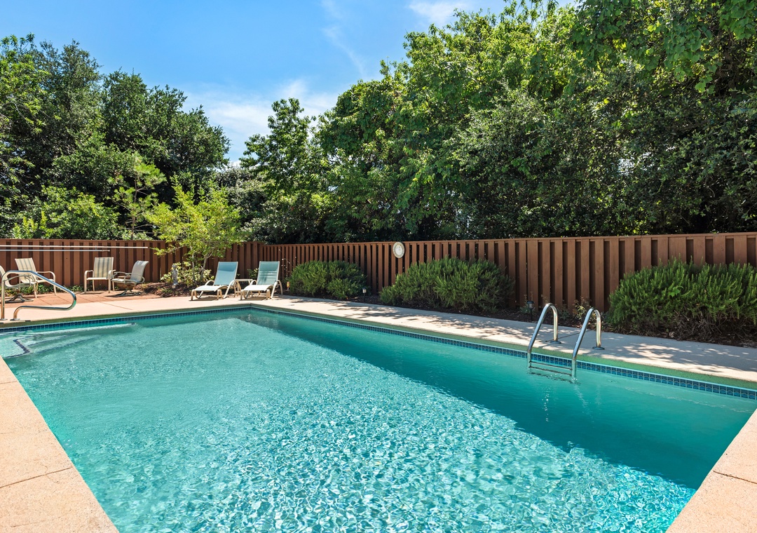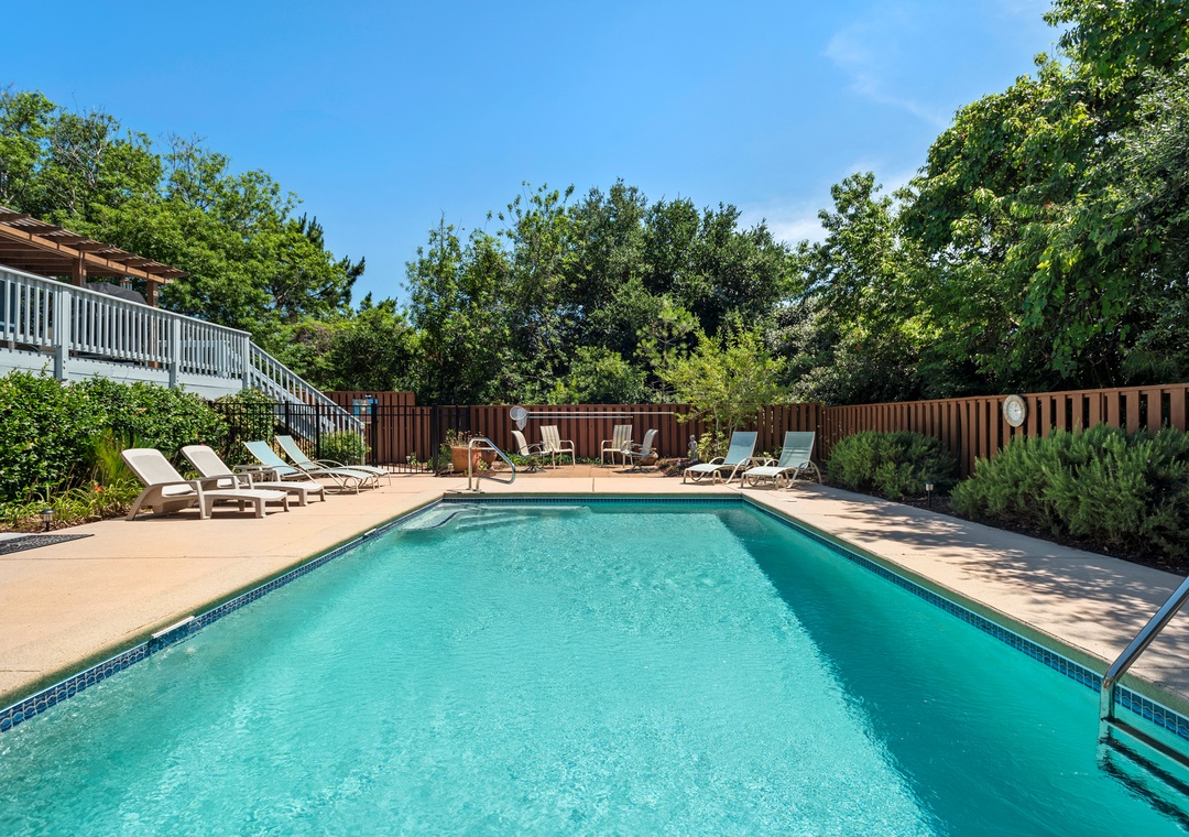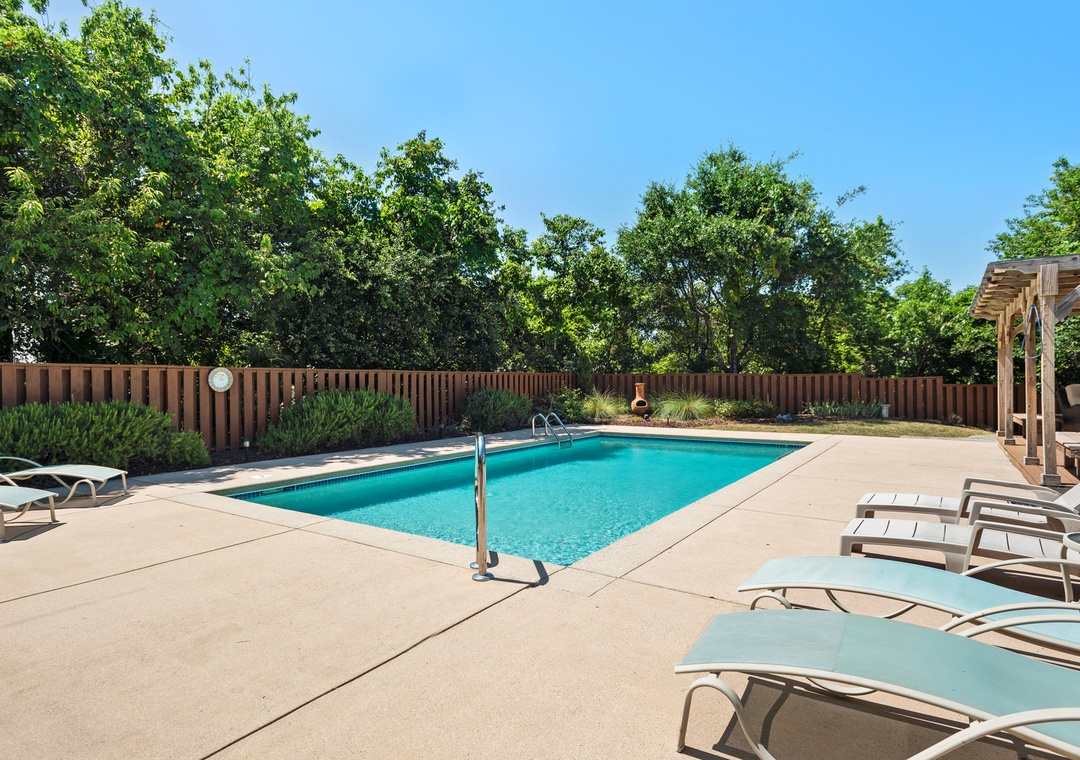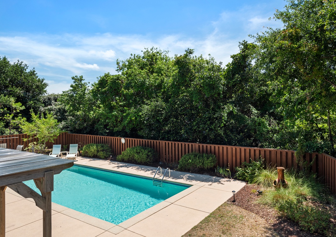 Meticulous landscaping and a barefoot-friendly lawn add to the curb appeal and is ideal play space for kids and yard games. In the backyard, the pool area is surrounded by a privacy fence and mature trees for seclusion. An expansive pool deck provides plenty of room for lounging in the sun, and a pergola with outdoor seating area is perfect for shaded poolside conversation and relaxation.