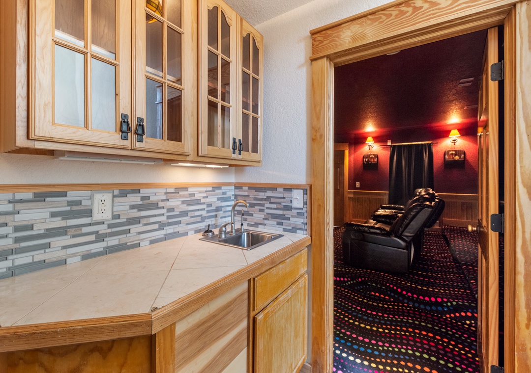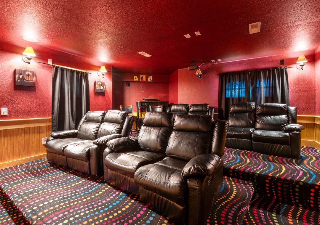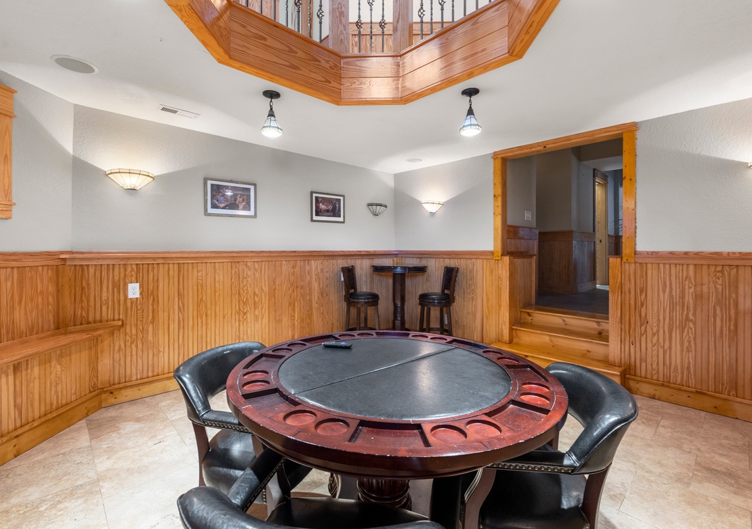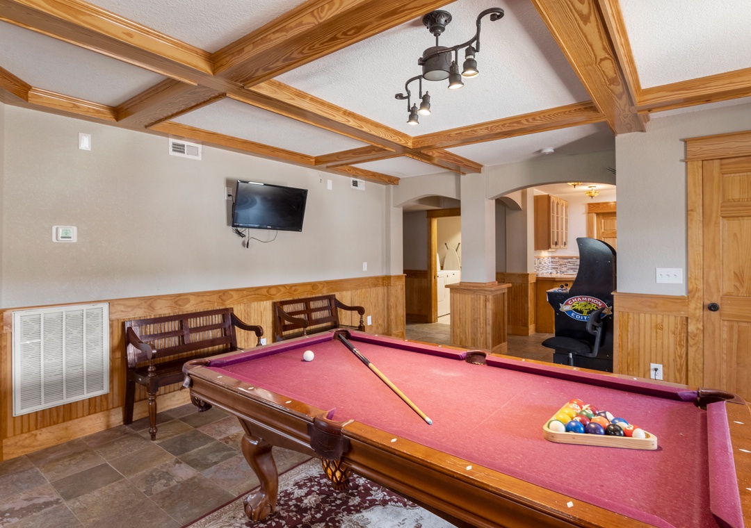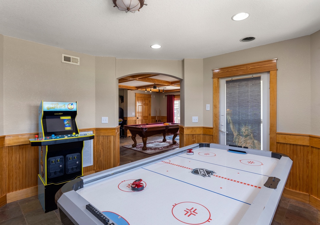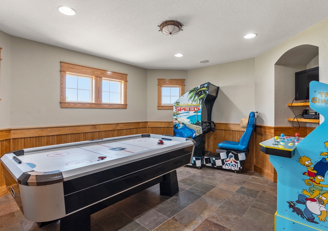 The good times continue downstairs in the rec space where you can show off your skills on the billiard table or play your best hand at the poker table. Go one-on-one in air hockey or foosball, or try to beat the highest score on the arcade games. For more laid-back entertainment, host a movie night in the theater with tiered, electric leather seating. A wet bar and full-size fridge on the ground level is perfect for grabbing a snack or a refill during the game or movie. At the end of the night, retreat to the stunning primary suite that features a huge private bath with a jetted tub and spacious walk-in shower. Six additional bedrooms, all of which are ensuite and provide deck access, will comfortably accommodate multiple or extended families. Guests with mobility issues can skip the stairs and use the elevator, which is also convenient for unpacking luggage and groceries.