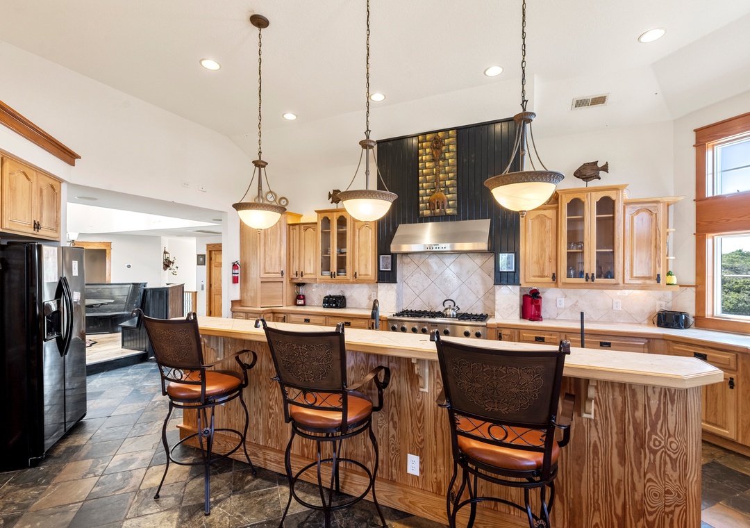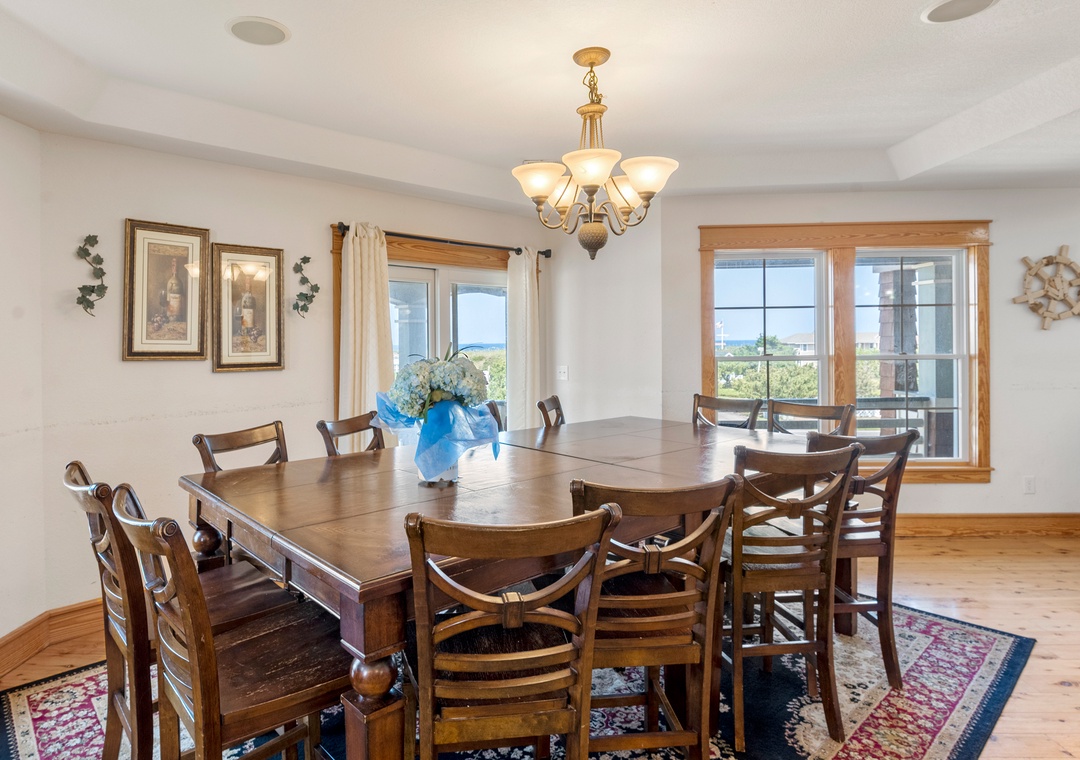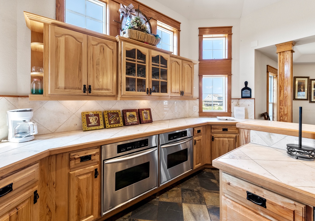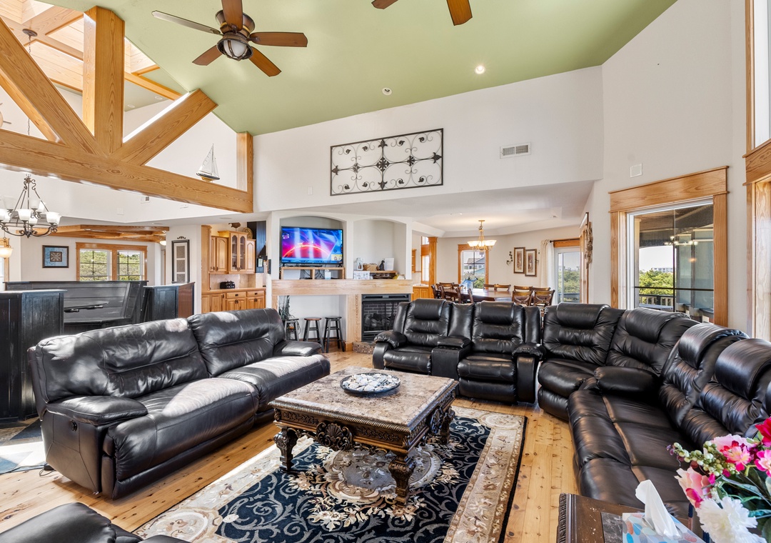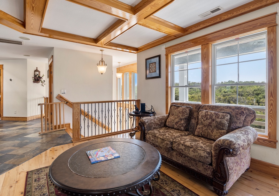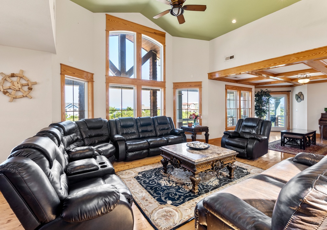 After a day at the beach, come home and unwind in the expansive great room with a wall of ocean-facing windows. Coffered ceilings, exposed beams, gorgeous hardwood floors and Tuscan-inspired tile throughout the common areas elevate the space to one of luxury and craftsmanship. The main living area is comprised of two separate furniture groupings, each with its own TV. Along with a central sitting area and a cozy den with a third TV, there's plenty of room for families to spread out on this level while still enjoying the sightlines and connection of an open-concept layout. The gourmet kitchen is anchored by a massive center island with bar seating, allowing family and friends to gather in heart of the home and socialize during meal prep. Two ovens and two dishwashers make cooking and cleaning up for large groups a breeze.