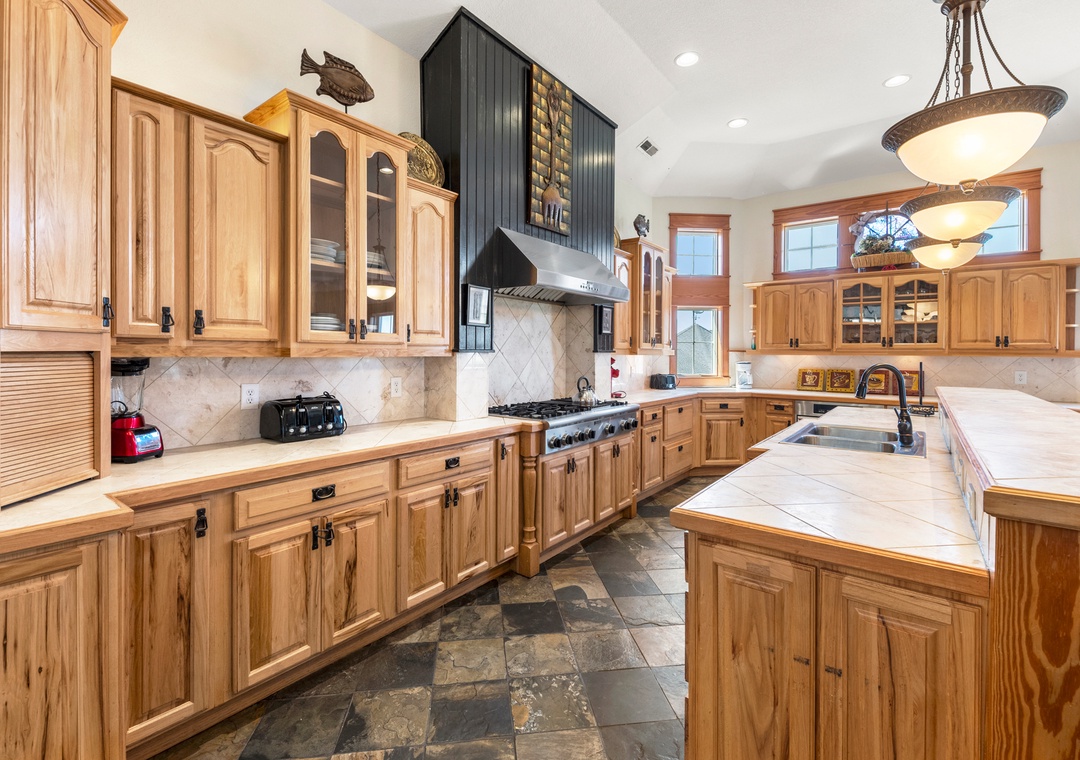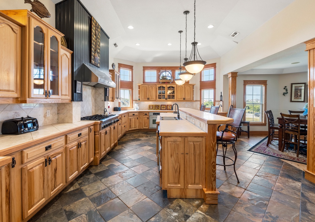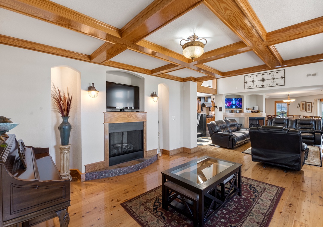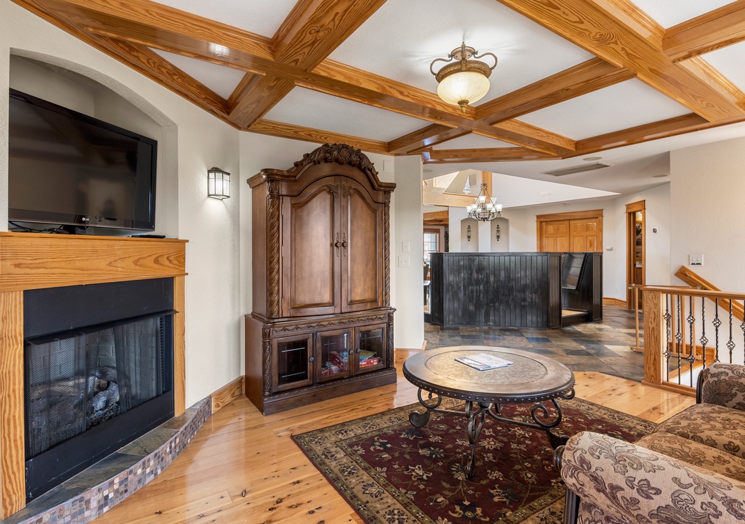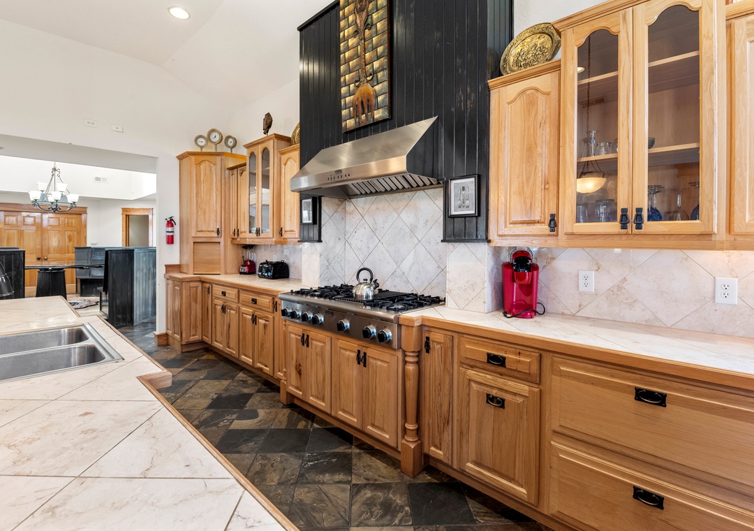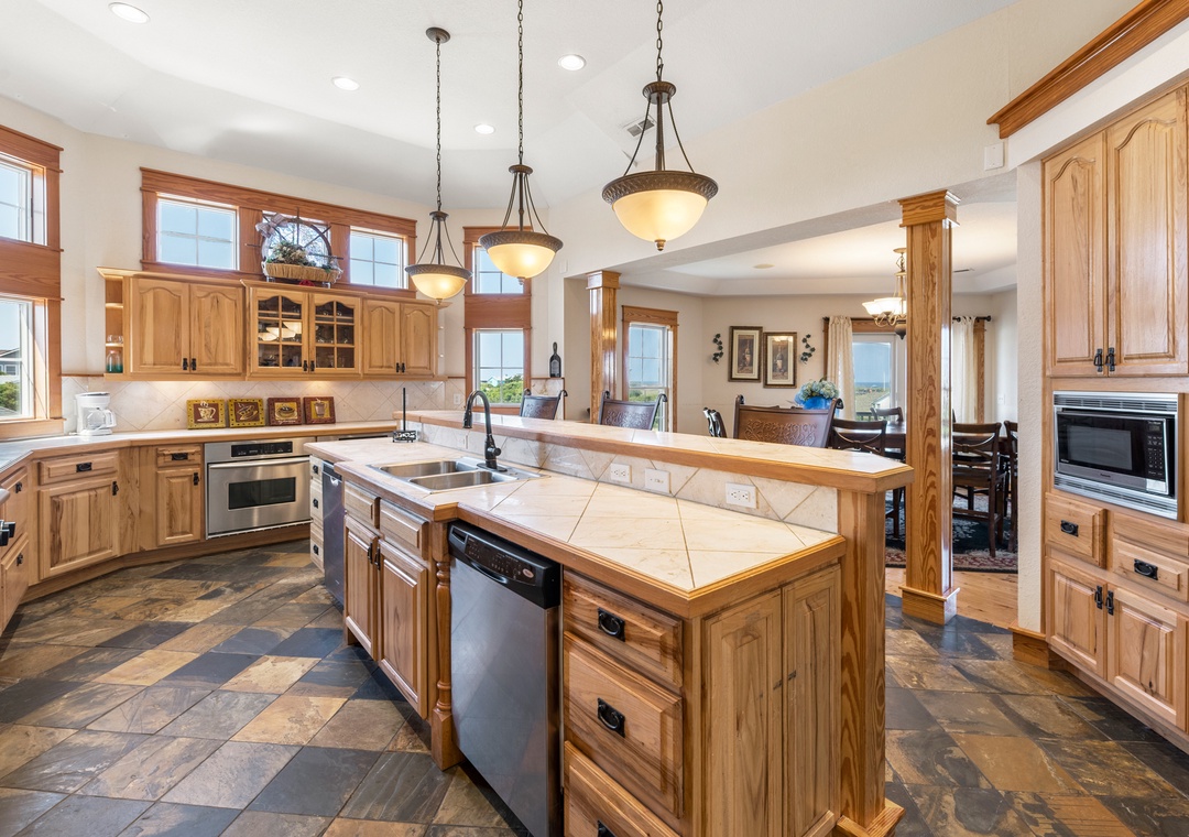 After a day at the beach, come home and unwind in the expansive great room with a wall of ocean-facing windows. Coffered ceilings, exposed beams, gorgeous hardwood floors and Tuscan-inspired tile throughout the common areas elevate the space to one of luxury and craftsmanship. The main living area is comprised of two separate furniture groupings, each with its own TV. Along with a central sitting area and a cozy den with a third TV, there's plenty of room for families to spread out on this level while still enjoying the sightlines and connection of an open-concept layout. The gourmet kitchen is anchored by a massive center island with bar seating, allowing family and friends to gather in heart of the home and socialize during meal prep. Two ovens and two dishwashers make cooking and cleaning up for large groups a breeze.