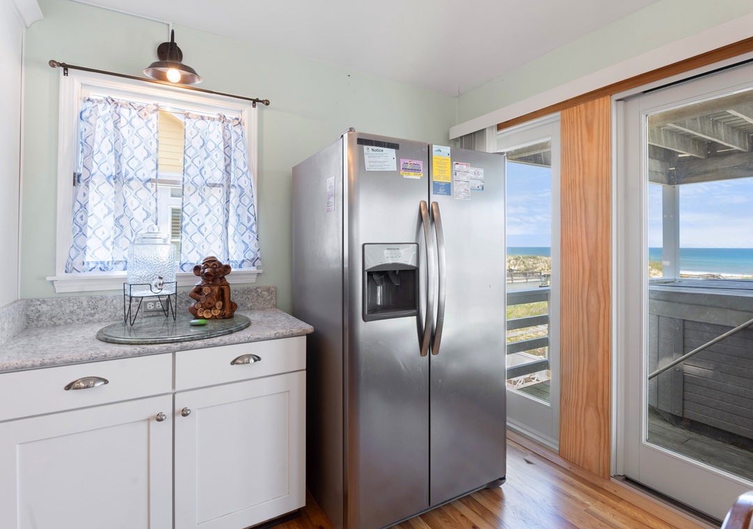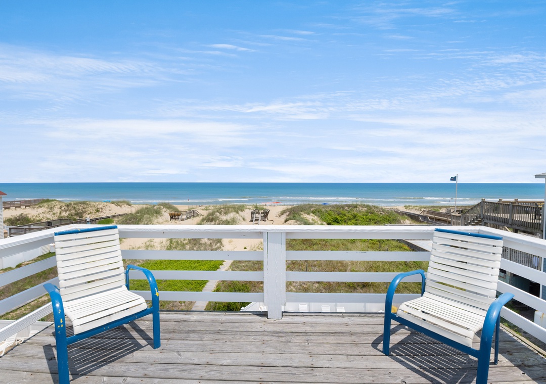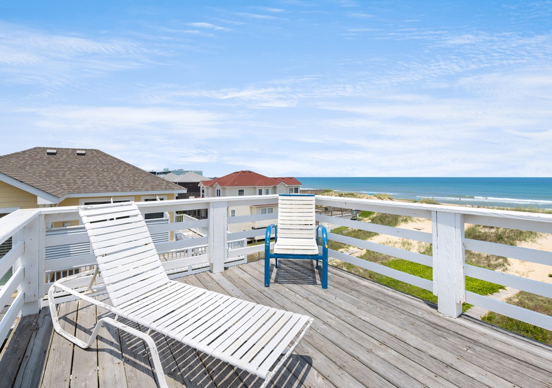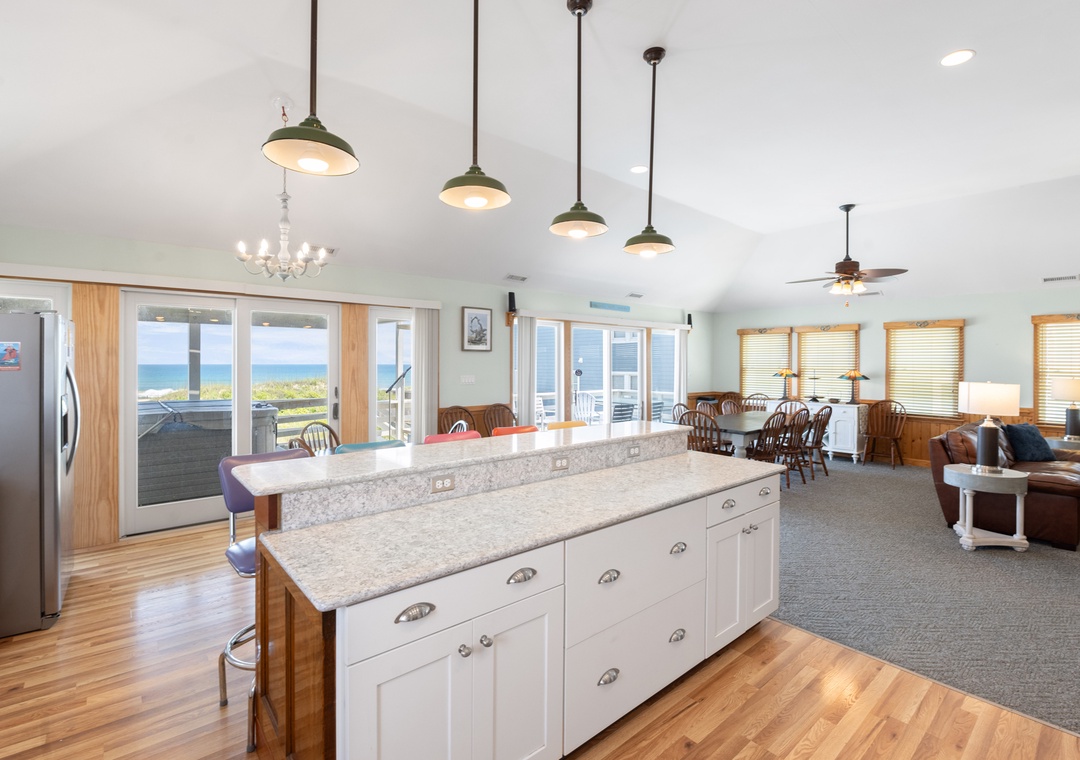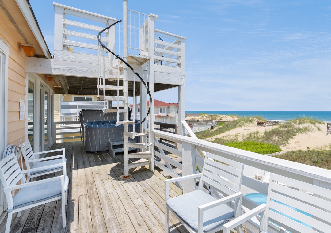 On the top level, an east-facing wall of sliding doors and oversized windows in the great room take full advantage of the panoramic ocean views. The open-concept layout offers the sight lines and flow needed for large families to comfortably gather and mingle. Everyone can pitch in with meal prep using the spacious and newly updated kitchen with granite countertops and stainless steel appliances, including a gas cooktop. There's even a second full-size fridge for storing extra groceries or the catch of the day. Outside, an expansive oceanfront deck serves as an extension of the great room for effortless indoor/outdoor living. It's the perfect spot to watch the sunrise with your morning coffee, or simply take in the salt air and ocean breezes. For an even better view, climb the spiral staircase to the rooftop observation deck.