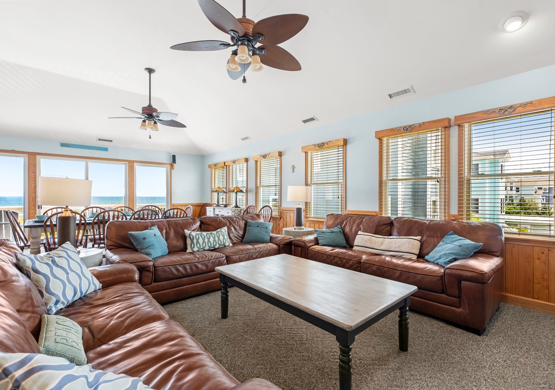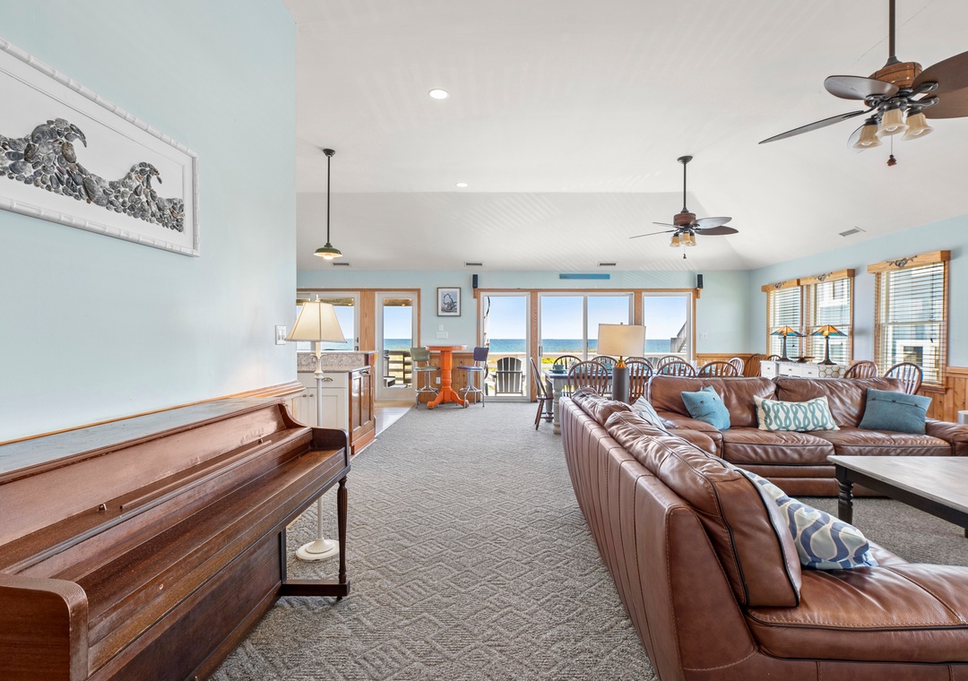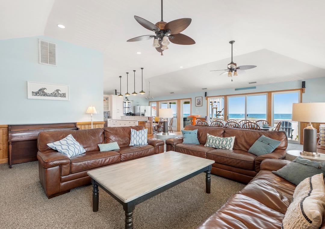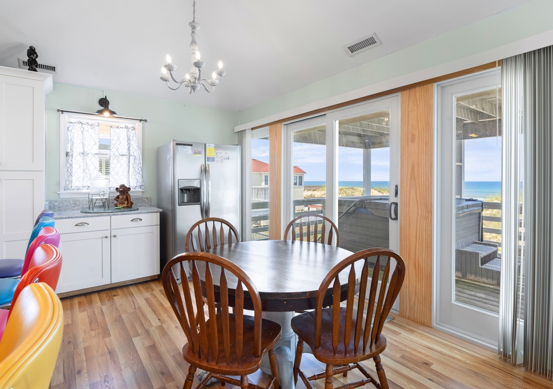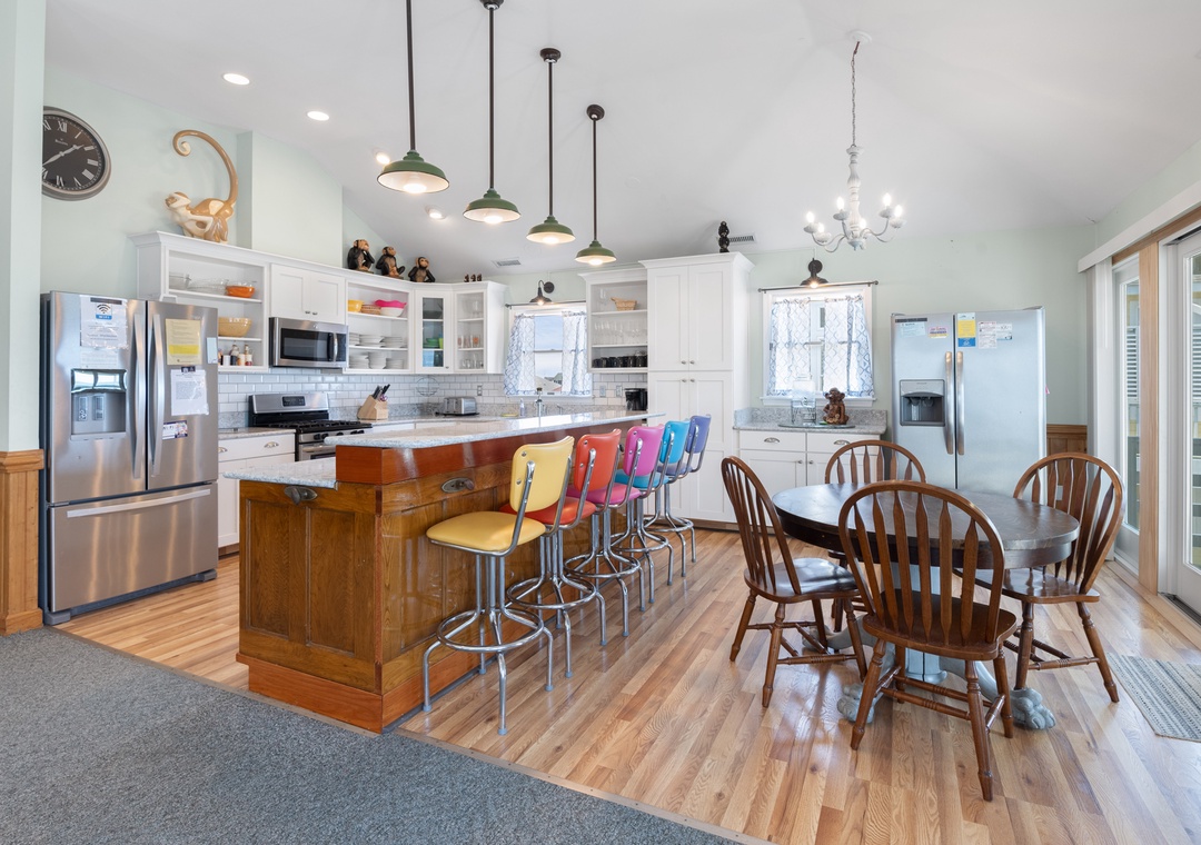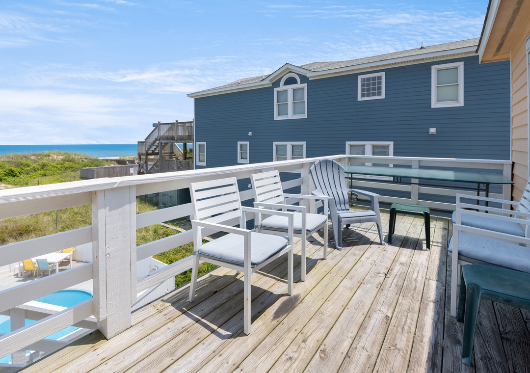 On the top level, an east-facing wall of sliding doors and oversized windows in the great room take full advantage of the panoramic ocean views. The open-concept layout offers the sight lines and flow needed for large families to comfortably gather and mingle. Everyone can pitch in with meal prep using the spacious and newly updated kitchen with granite countertops and stainless steel appliances, including a gas cooktop. There's even a second full-size fridge for storing extra groceries or the catch of the day. Outside, an expansive oceanfront deck serves as an extension of the great room for effortless indoor/outdoor living. It's the perfect spot to watch the sunrise with your morning coffee, or simply take in the salt air and ocean breezes. For an even better view, climb the spiral staircase to the rooftop observation deck.