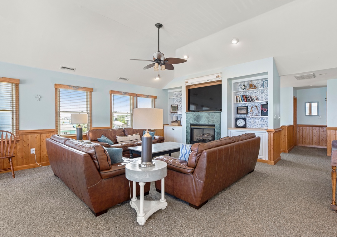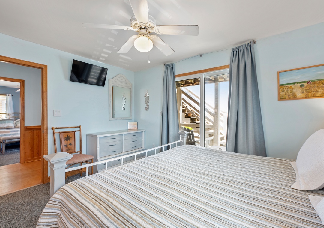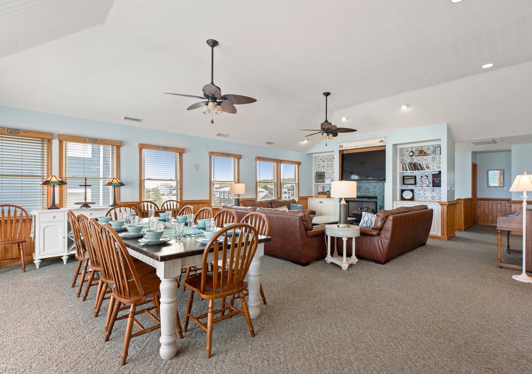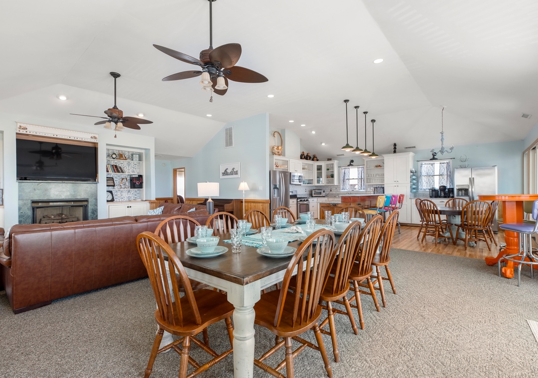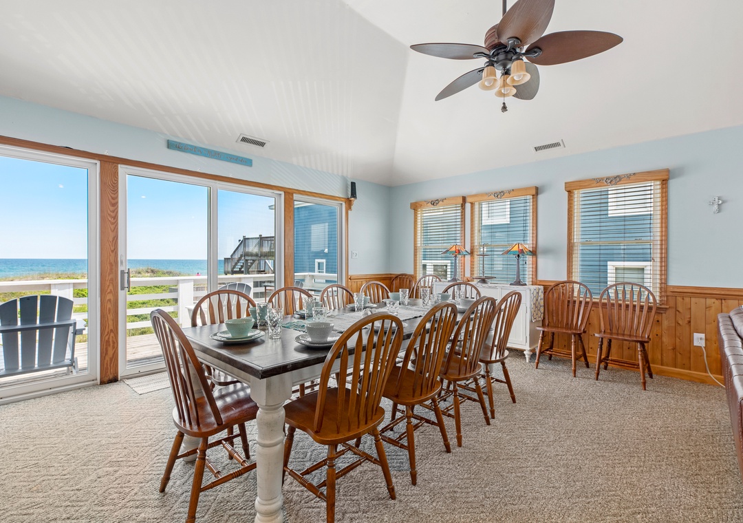On the top level, an east-facing wall of sliding doors and oversized windows in the great room take full advantage of the panoramic ocean views. The open-concept layout offers the sight lines and flow needed for large families to comfortably gather and mingle. Everyone can pitch in with meal prep using the spacious and newly updated kitchen with granite countertops and stainless steel appliances, including a gas cooktop. There's even a second full-size fridge for storing extra groceries or the catch of the day. Outside, an expansive oceanfront deck serves as an extension of the great room for effortless indoor/outdoor living. It's the perfect spot to watch the sunrise with your morning coffee, or simply take in the salt air and ocean breezes. For an even better view, climb the spiral staircase to the rooftop observation deck.