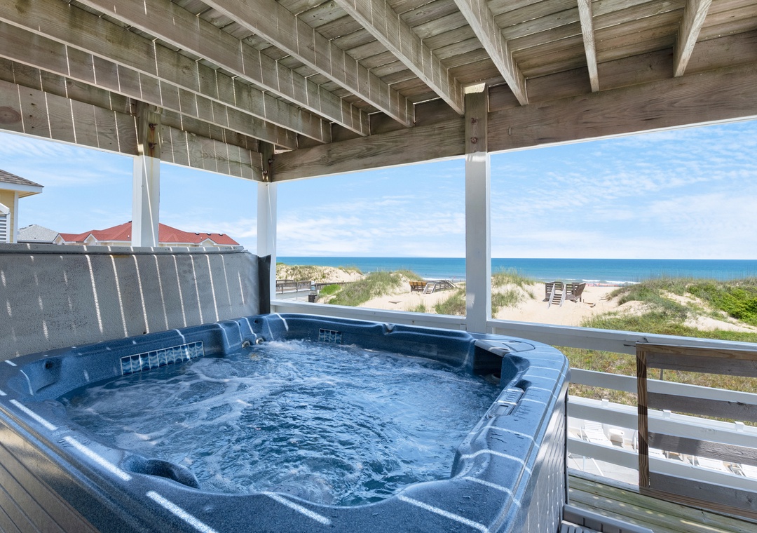 The primary bedroom is also located on the top level and includes an ensuite bath and private deck. All other bedrooms are situated on the lower levels, three of which provide direct access to a covered deck with hot tub. Imagine taking a relaxing soak while listening to the sound of the waves before heading off to bed. There's also a rec room on the mid-level, where guests can shoot pool or enjoy a cold beverage from the wet bar.